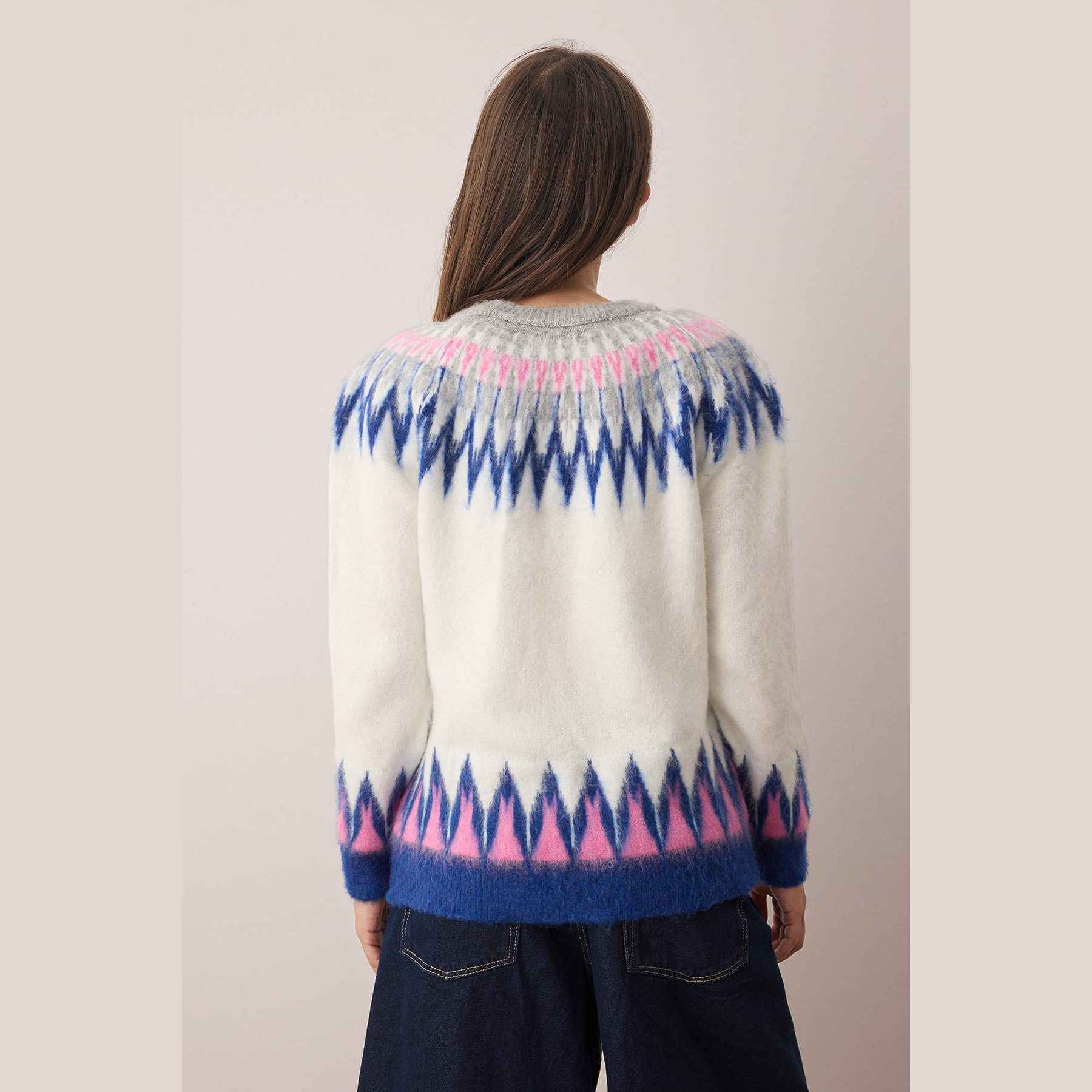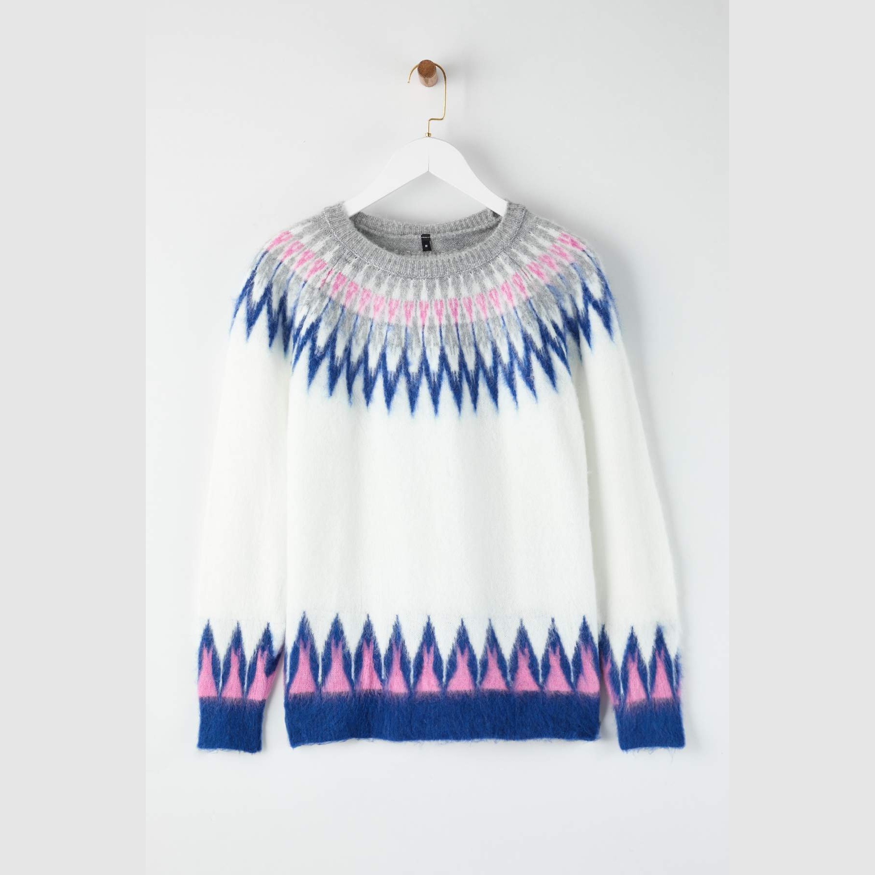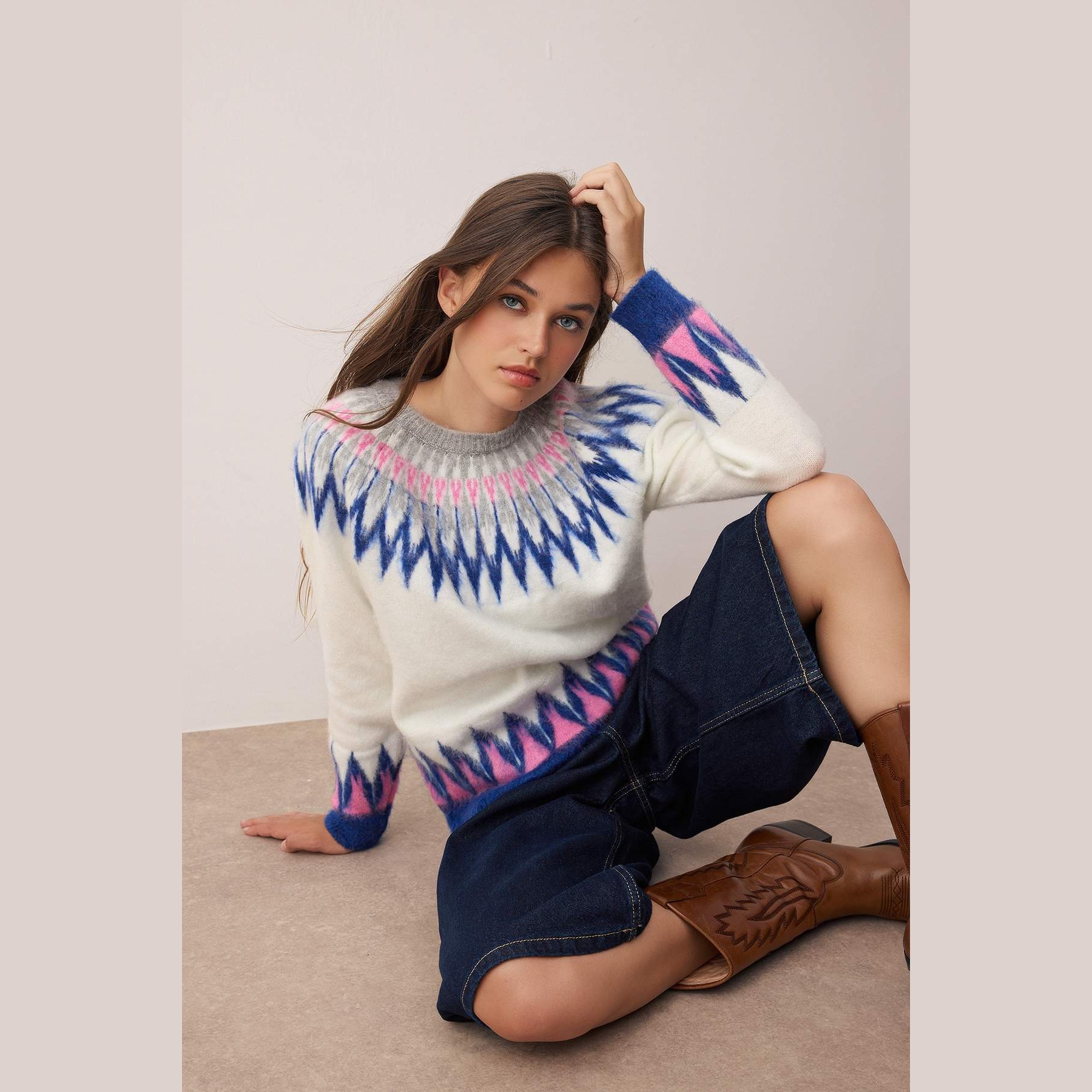 كنزة شتوية بلون أوف وايت هادئ، مصممة بنقشة هندسية تضيف طابعًا عصريًا مميزًا، مع خامة تريكو متوسطة السماكة بملمس ناعم. تأتي بياقة مستديرة مغلقة، وأكمام طويلة بكتف مائل، وقصة منتظمة تمنحك تناسقًا مريحًا، ما يجعلها مثالية للإطلالات اليومية الشتوية الأنيقة.