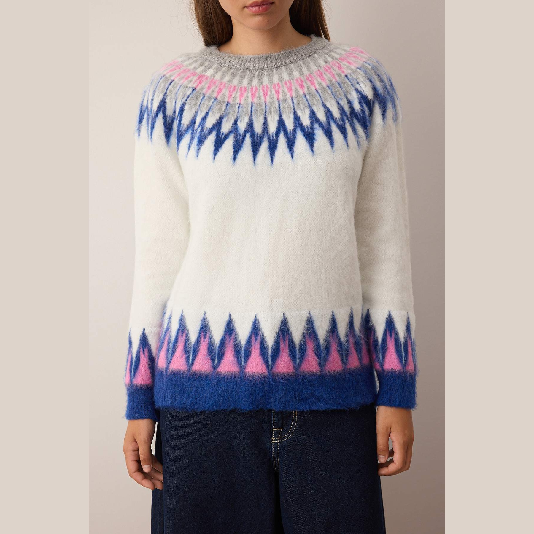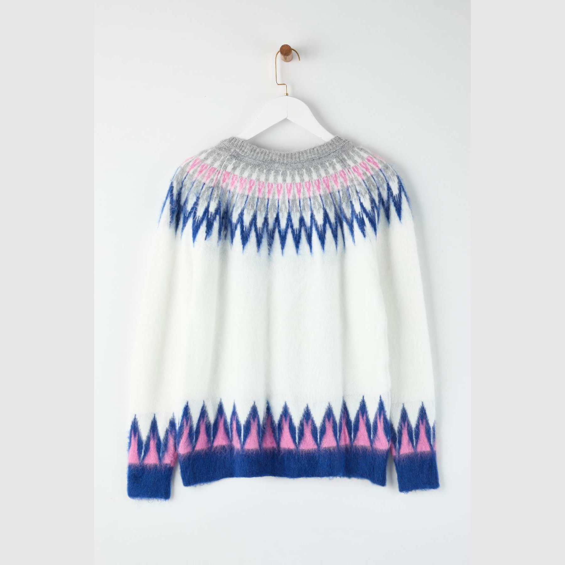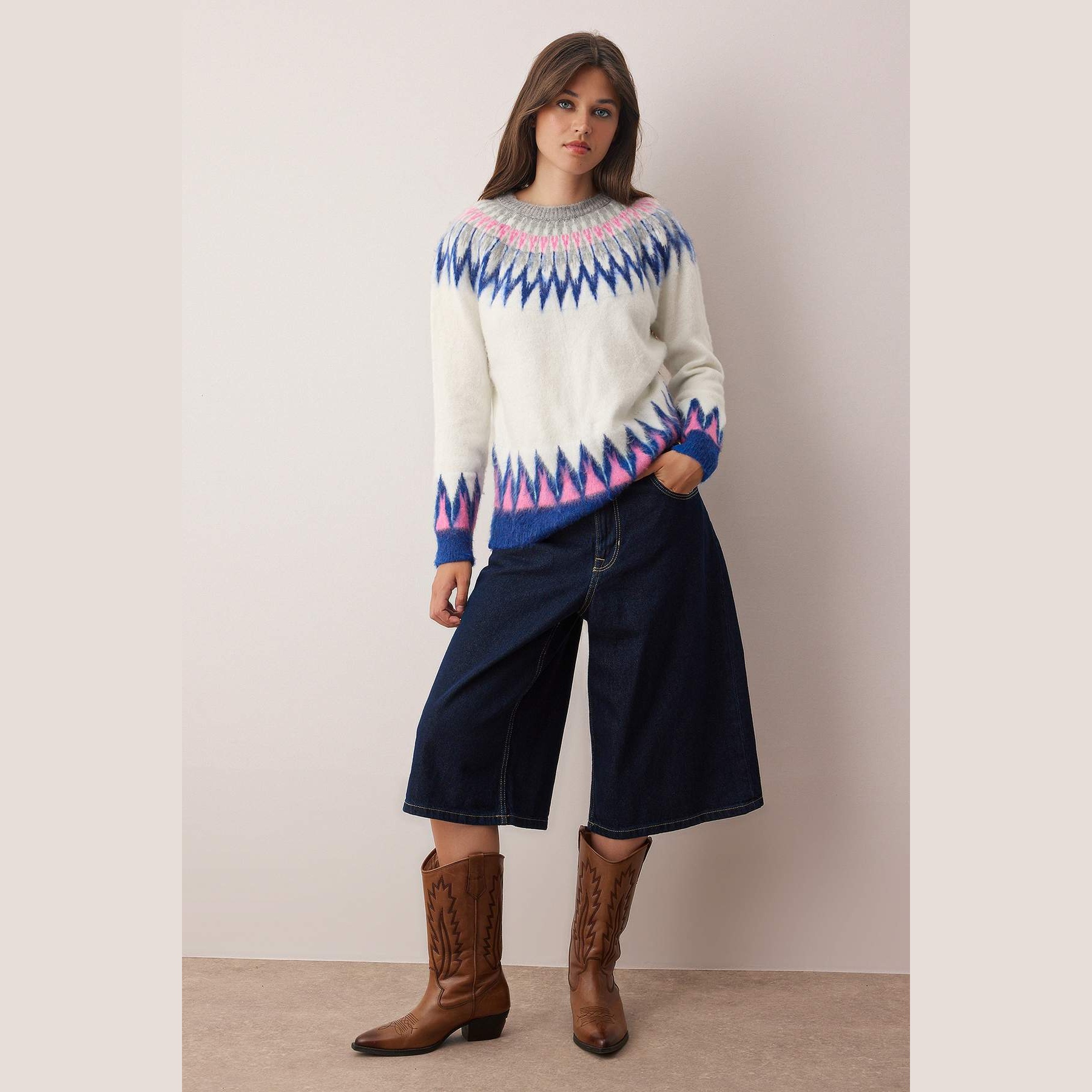 كنزة شتوية بلون أوف وايت هادئ، مصممة بنقشة هندسية تضيف طابعًا عصريًا مميزًا، مع خامة تريكو متوسطة السماكة بملمس ناعم. تأتي بياقة مستديرة مغلقة، وأكمام طويلة بكتف مائل، وقصة منتظمة تمنحك تناسقًا مريحًا، ما يجعلها مثالية للإطلالات اليومية الشتوية الأنيقة.