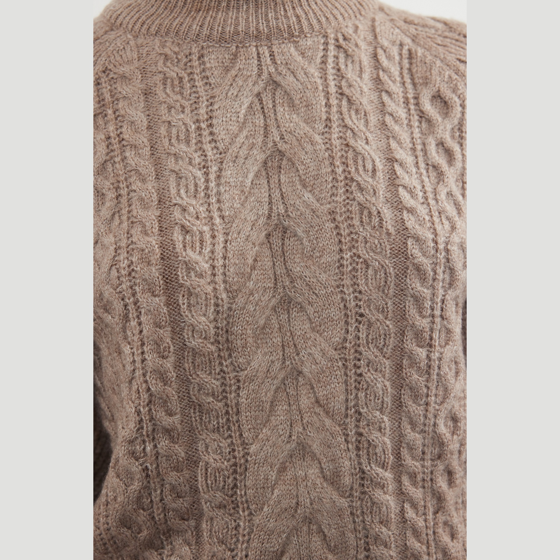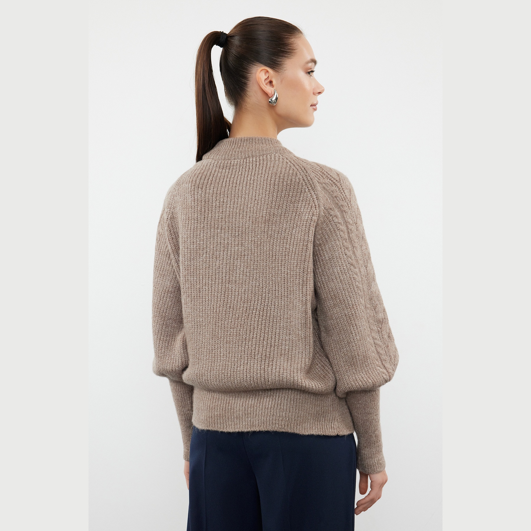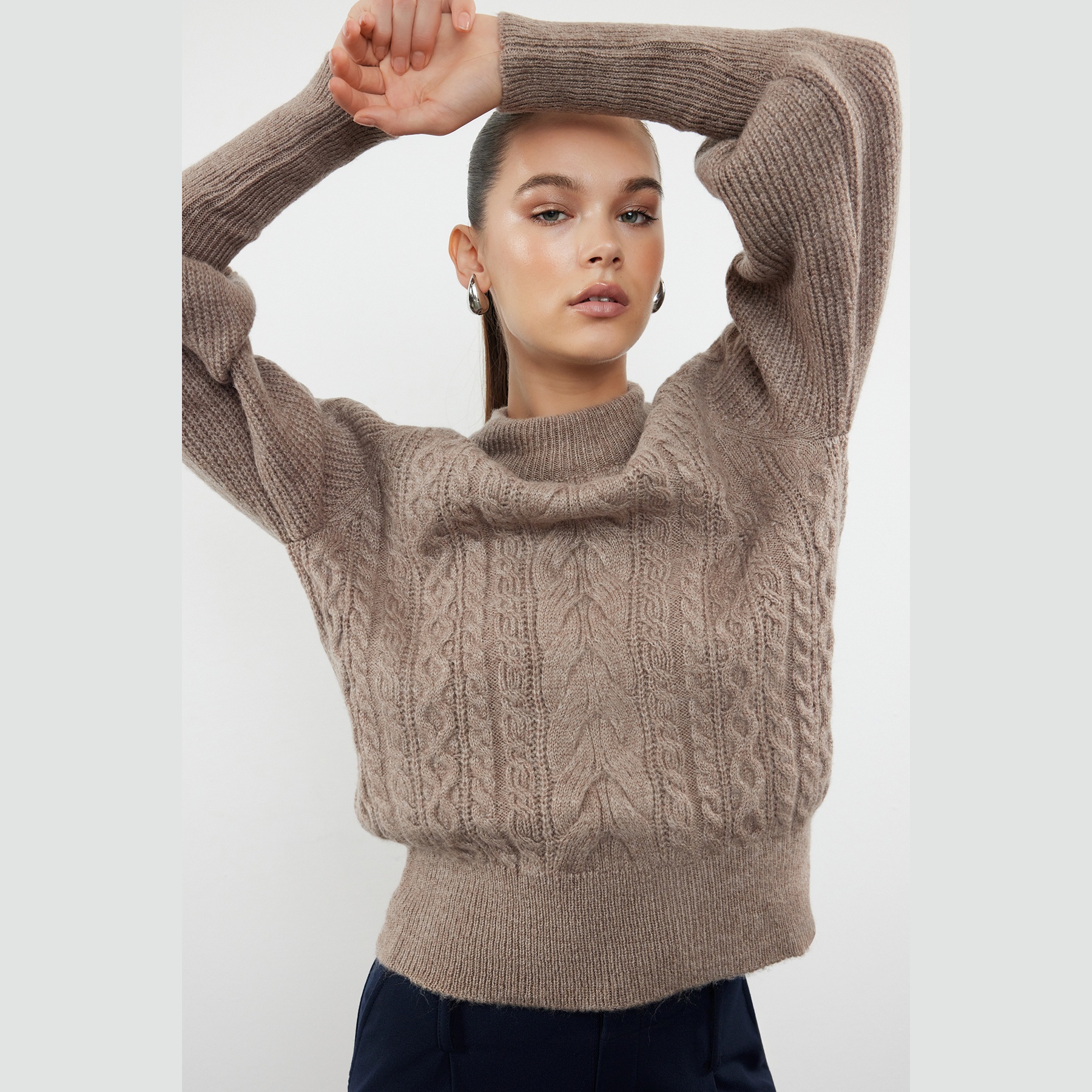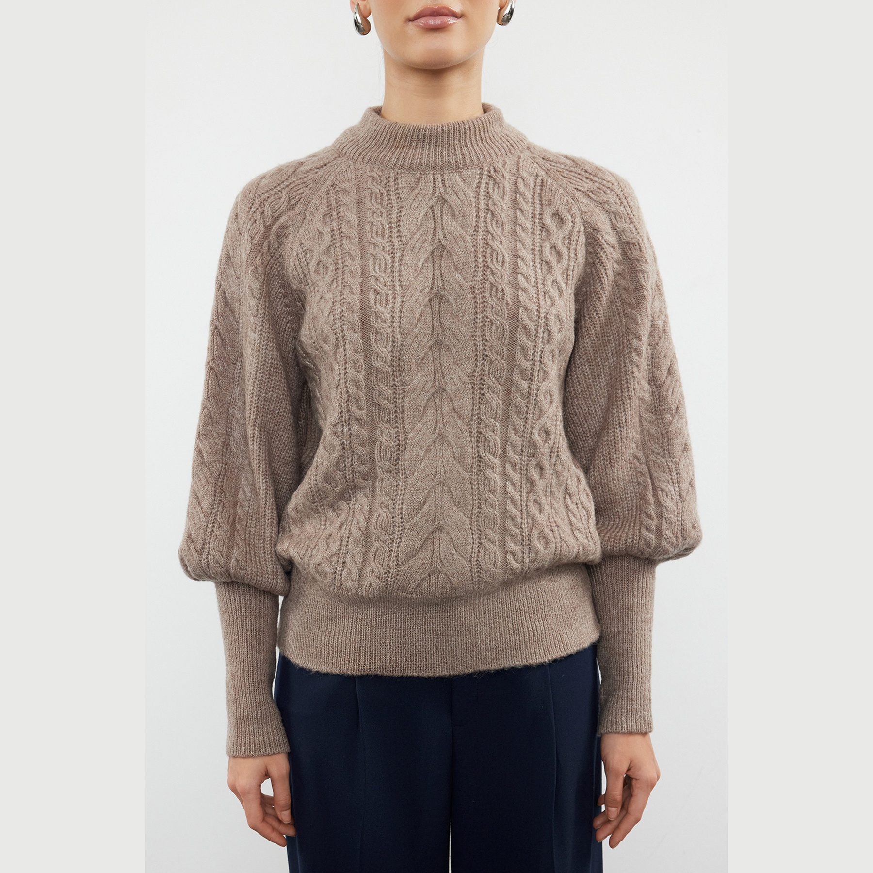 كنزة شتوية بلون بيج هادئ، مصممة بنقشة ضفائر تضيف طابعًا كلاسيكيًا أنيقًا، مع خامة تريكو متوسطة السماكة بملمس ناعم. تأتي بياقة عالية مغلقة، وأكمام طويلة بتصميم البالون، وقصة منتظمة تمنحك تناسقًا مريحًا، ما يجعلها مثالية للإطلالات اليومية الشتوية التي تجمع بين الدفء والأناقة.