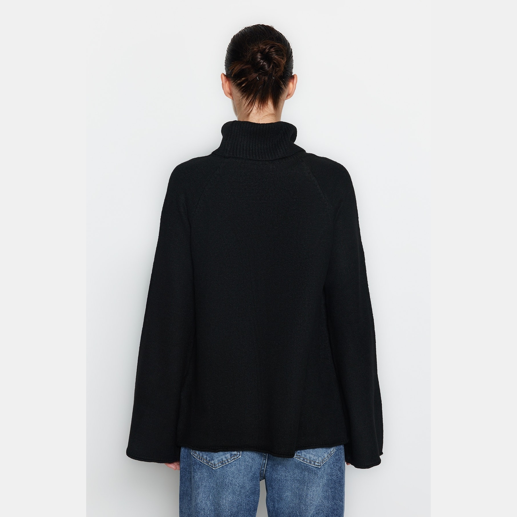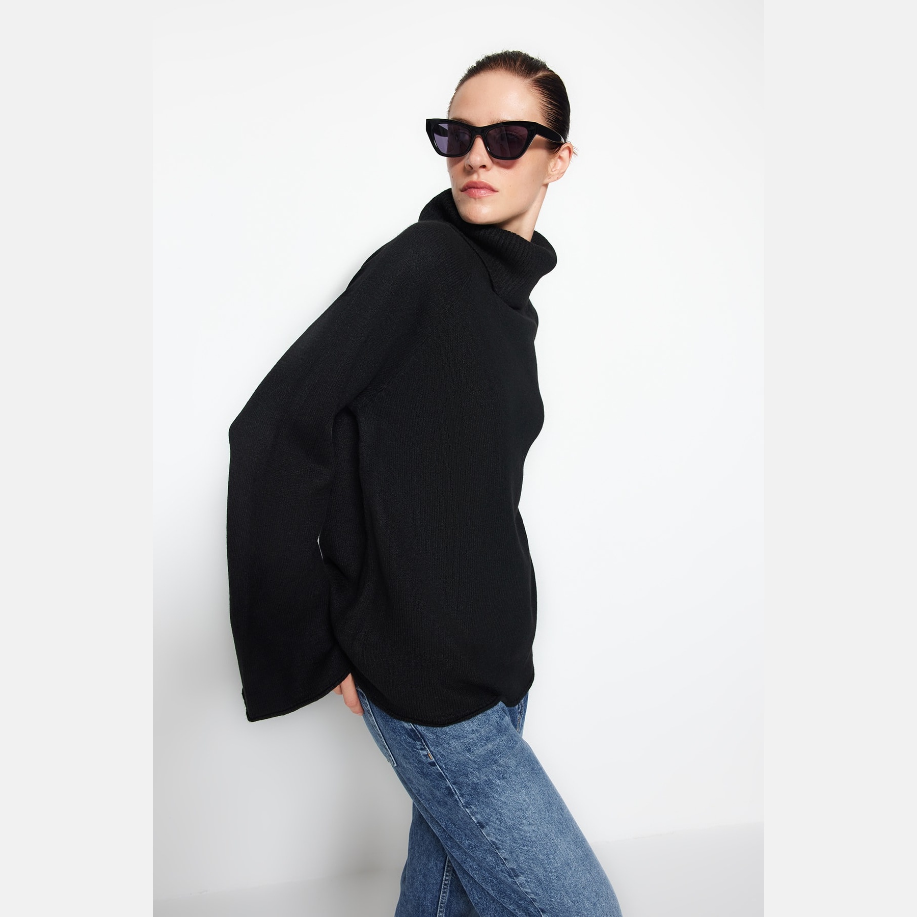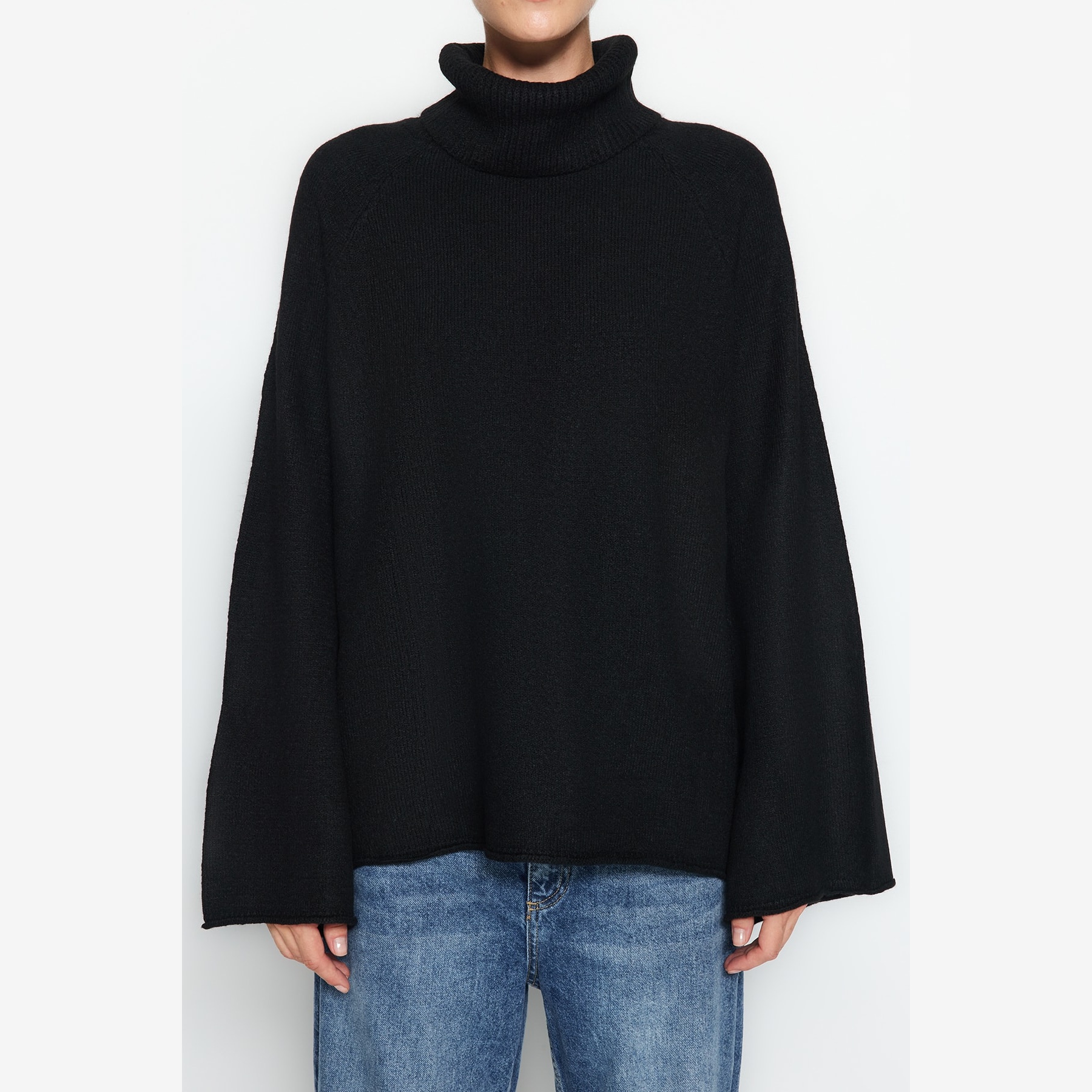 كنزة نسائية – أسود بياقة عالية وقصة واسعة من خامة تريكو ناعمة (دفء مثالي بلمسة بسيطة وأنيقة)