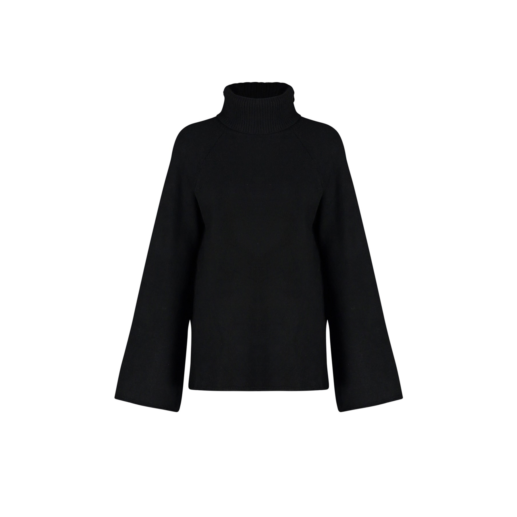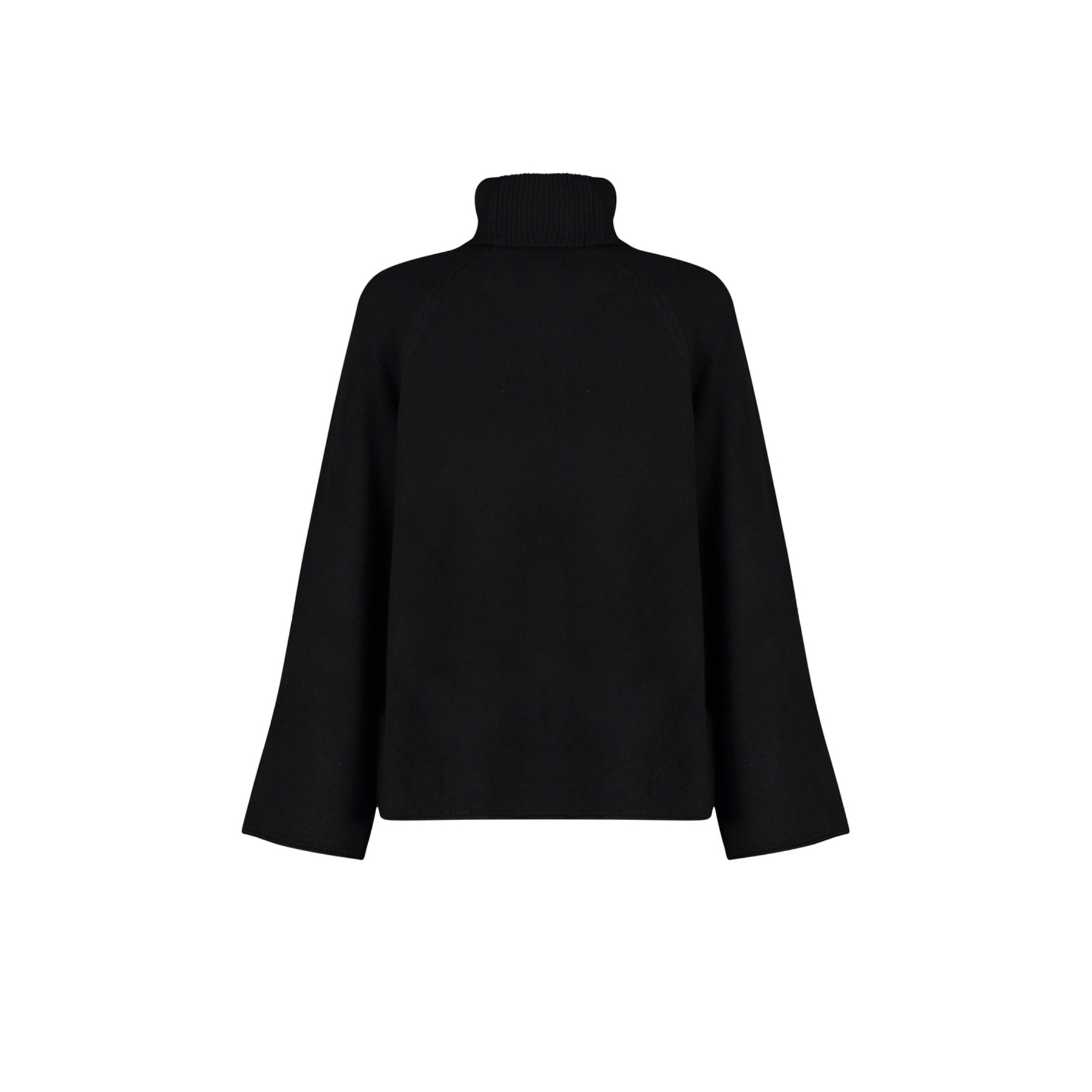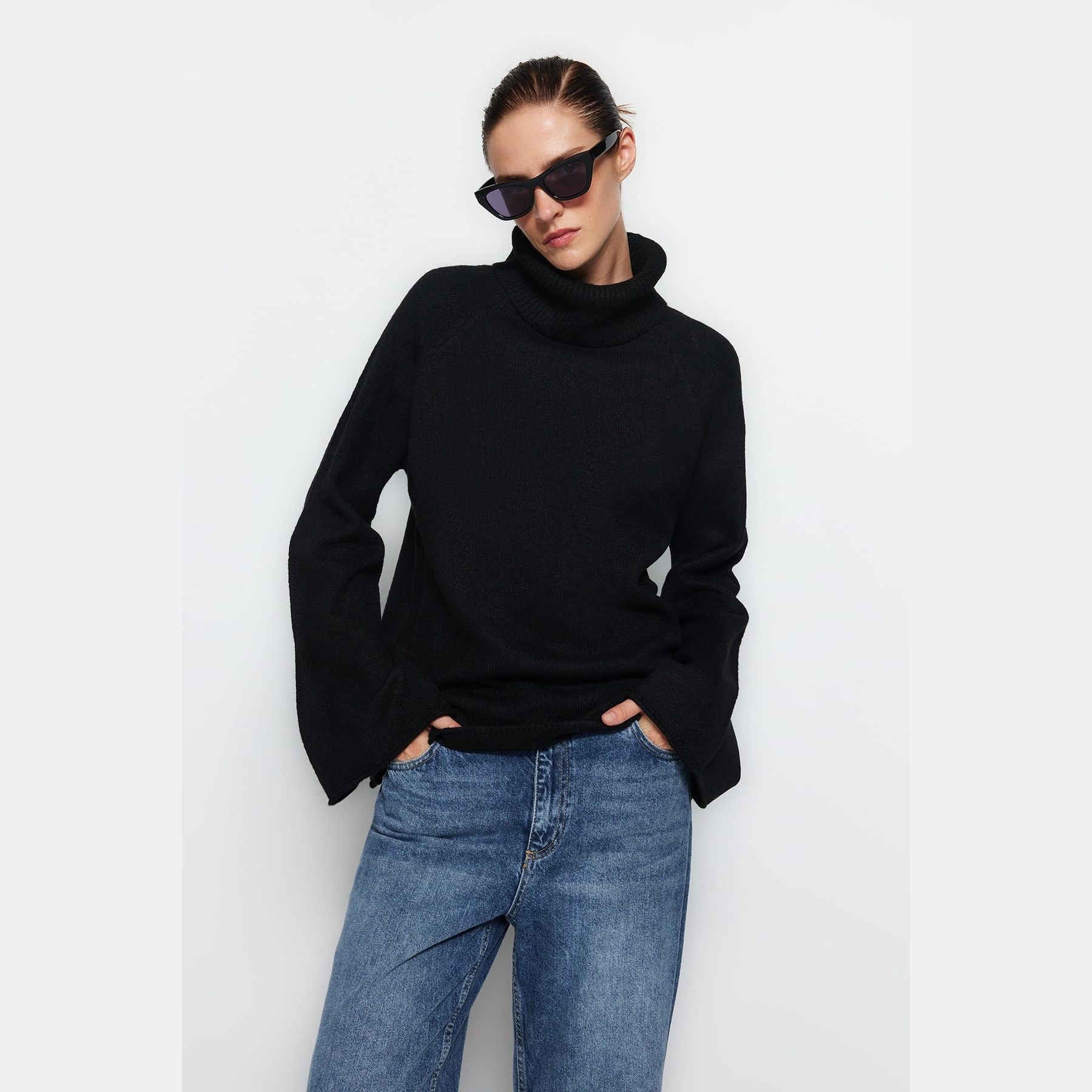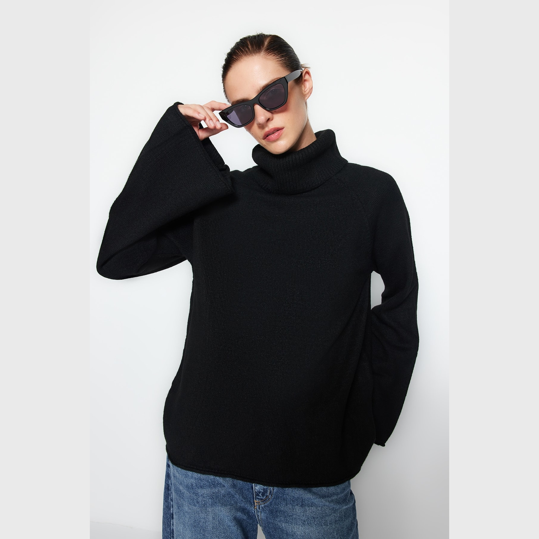 كنزة نسائية – أسود بياقة عالية وقصة واسعة من خامة تريكو ناعمة (دفء مثالي بلمسة بسيطة وأنيقة)