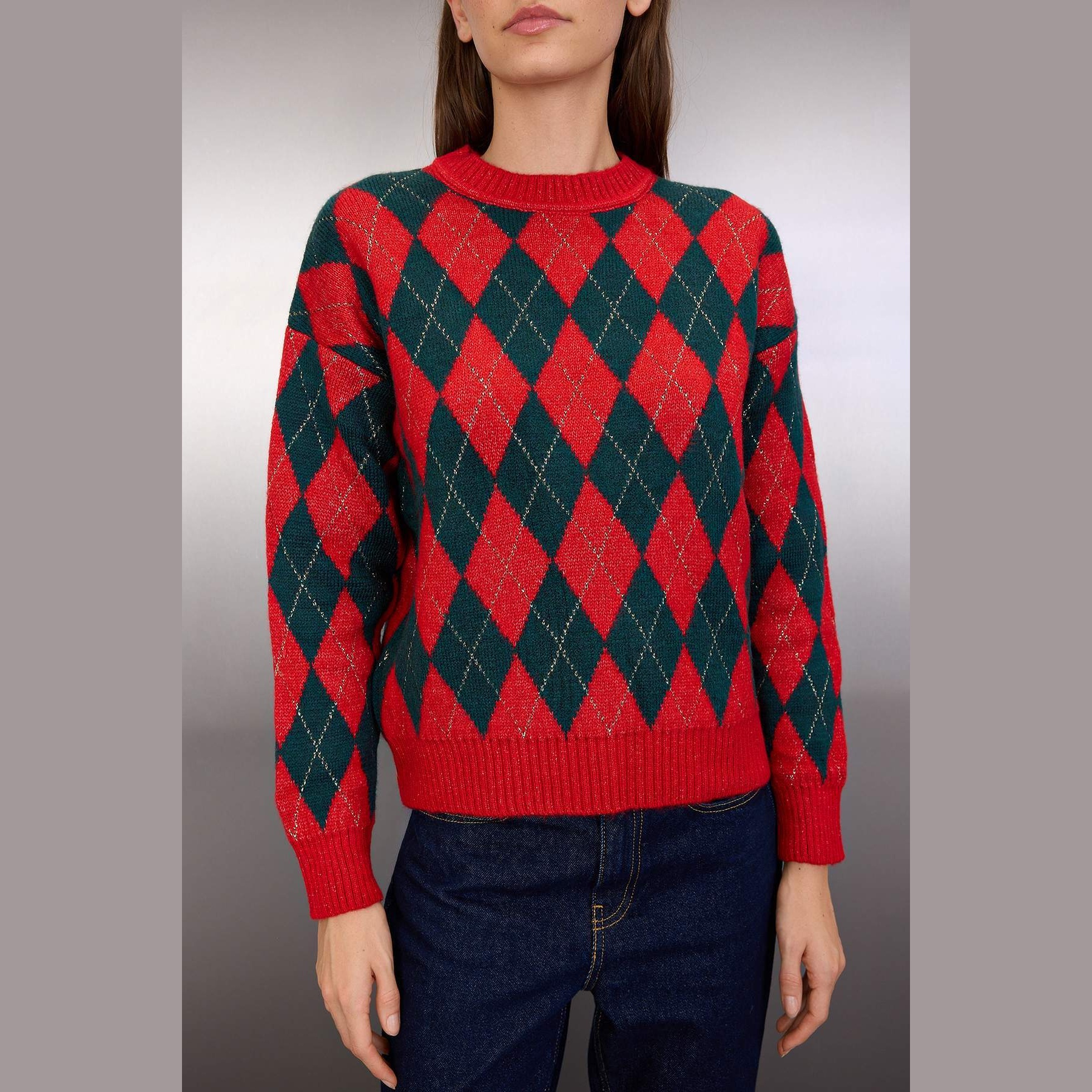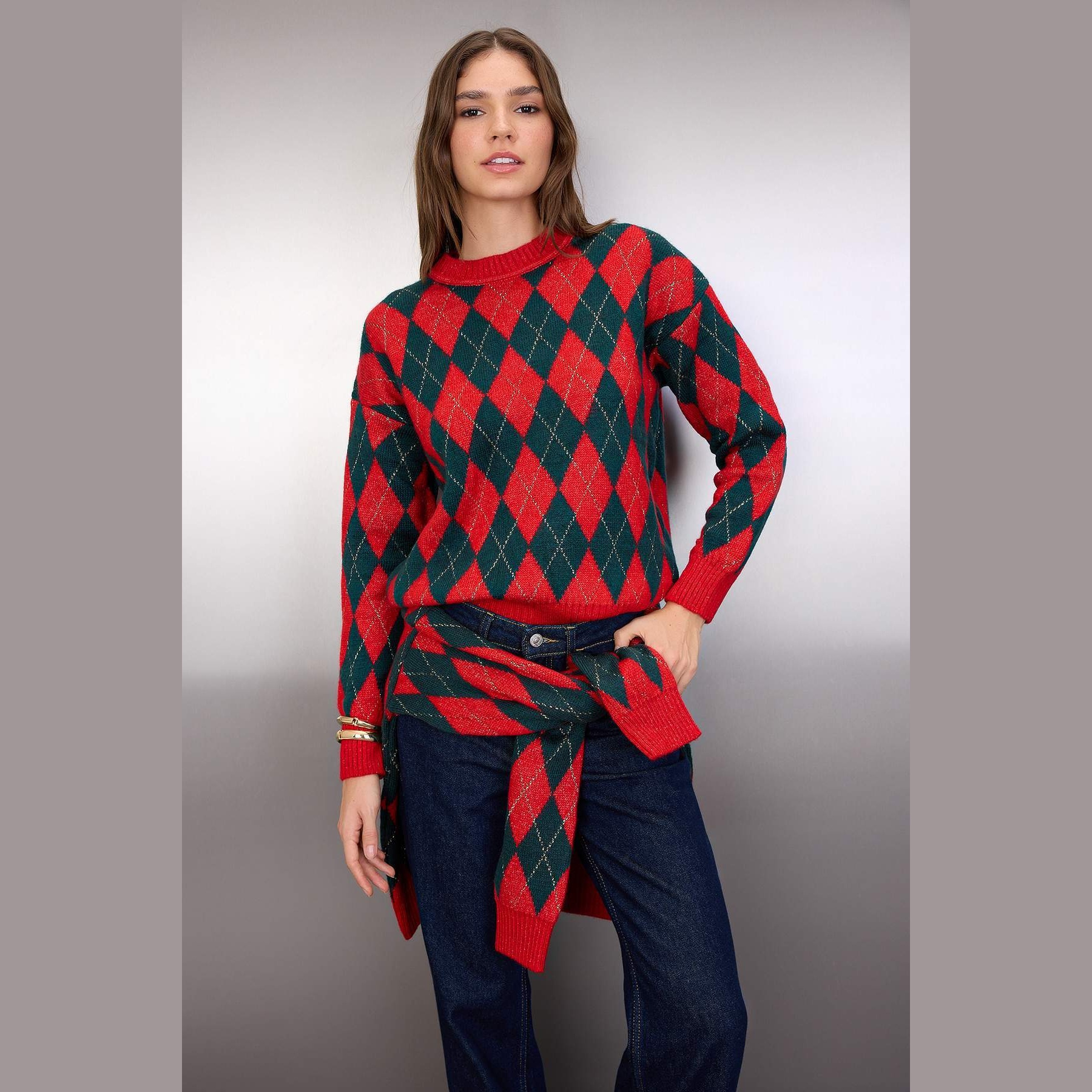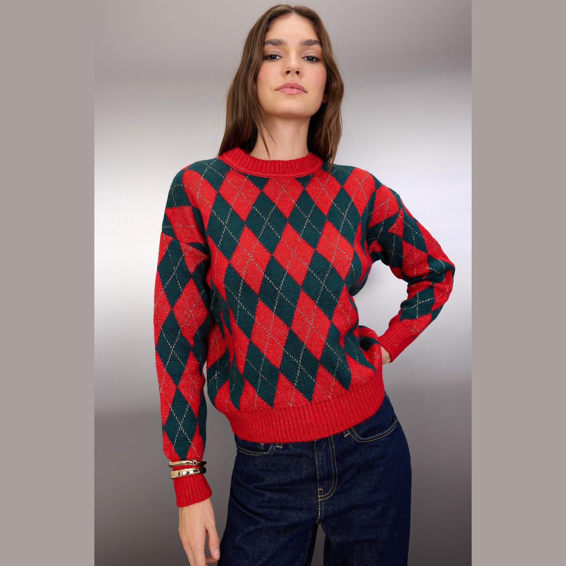 كنزة شتوية بلون أحمر زاهي، مصممة بقصة واسعة تمنحك راحة مثالية، مع خامة تريكو سميكة بملمس ناعم ولمعة خفيفة تضيف طابعًا احتفاليًا مميزًا. تأتي بياقة مستديرة مغلقة، وأكمام طويلة بكتف منخفض، ونقشة هندسية موسمية، ما يجعلها خيارًا مثاليًا لإطلالات نهاية العام التي تجمع بين الدفء والمرح.