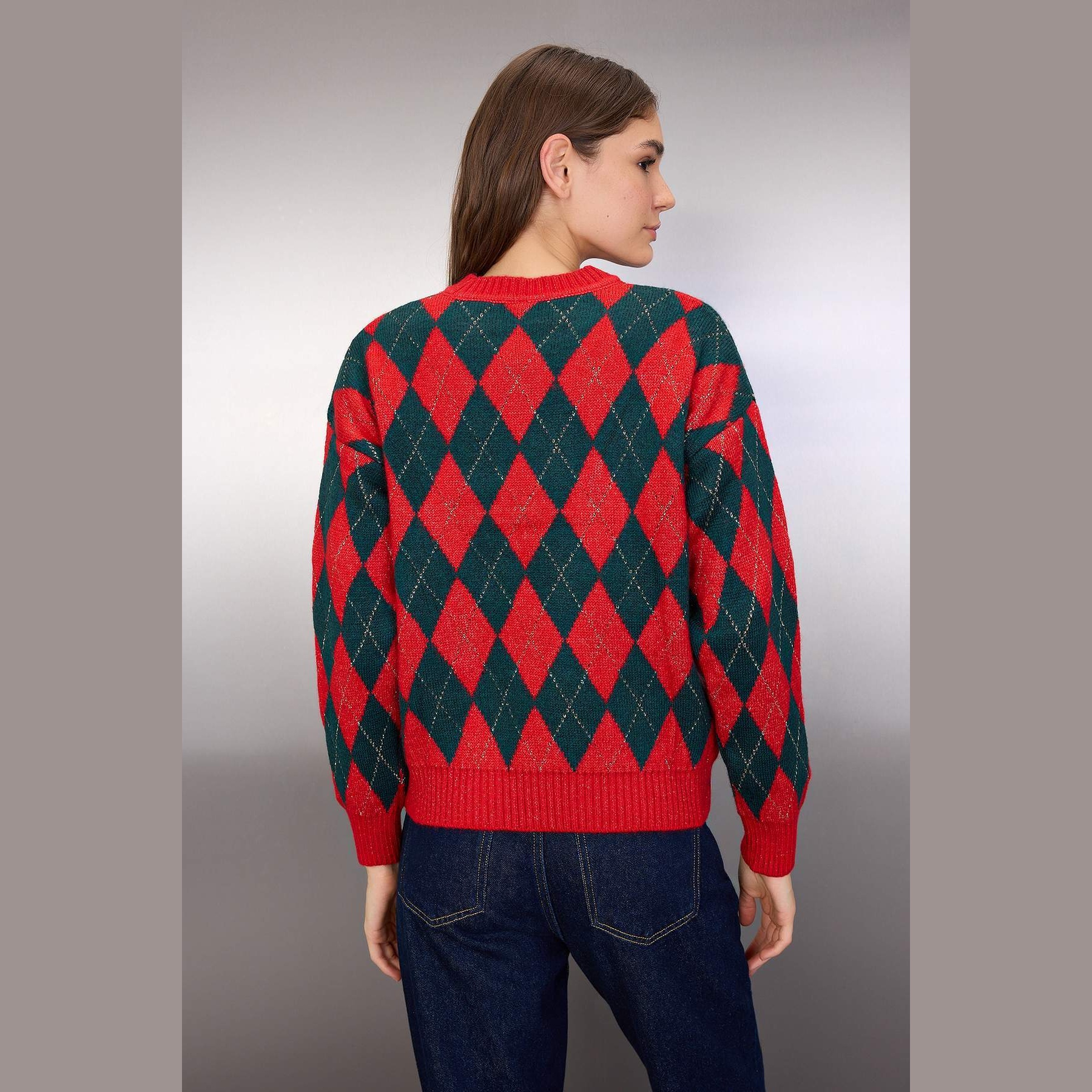 كنزة نسائية – أحمر بلمعة خفيفة ونقشة موسمية من خامة تريكو ناعمة (إطلالة احتفالية دافئة بلمسة مرحة)