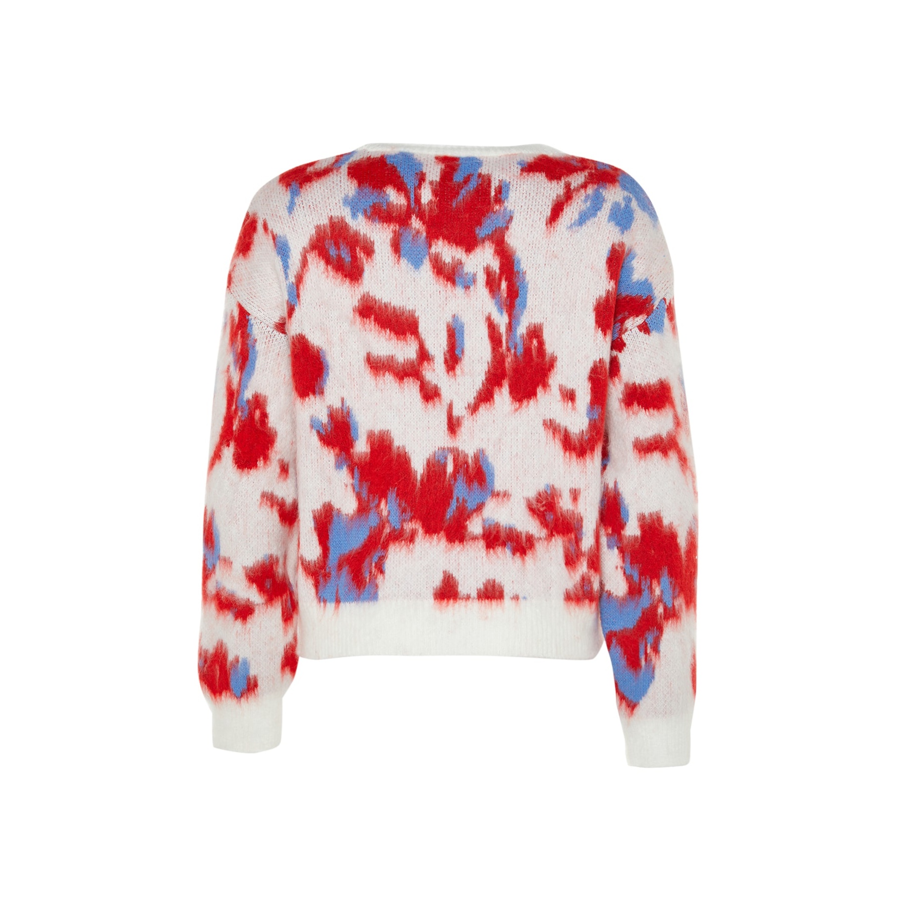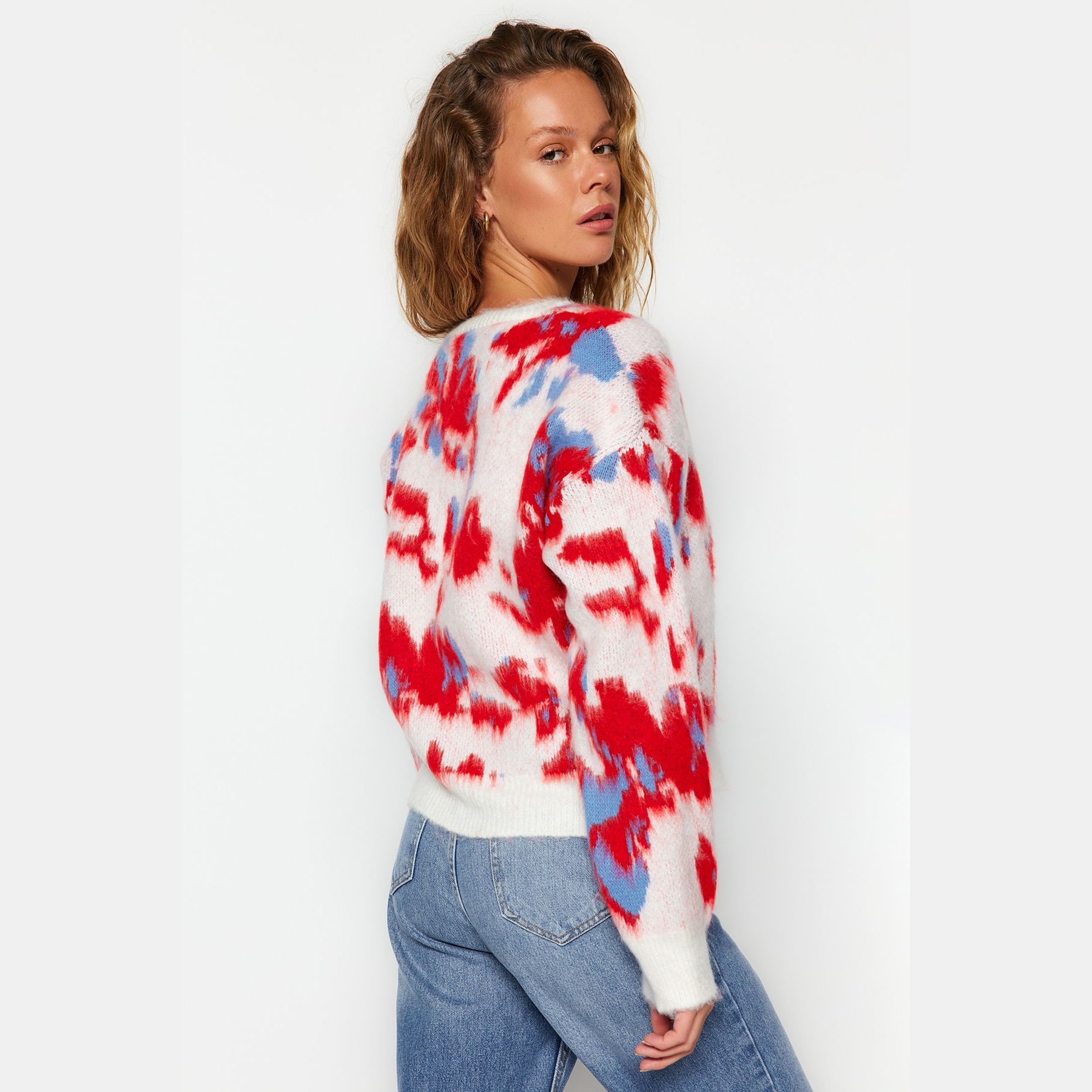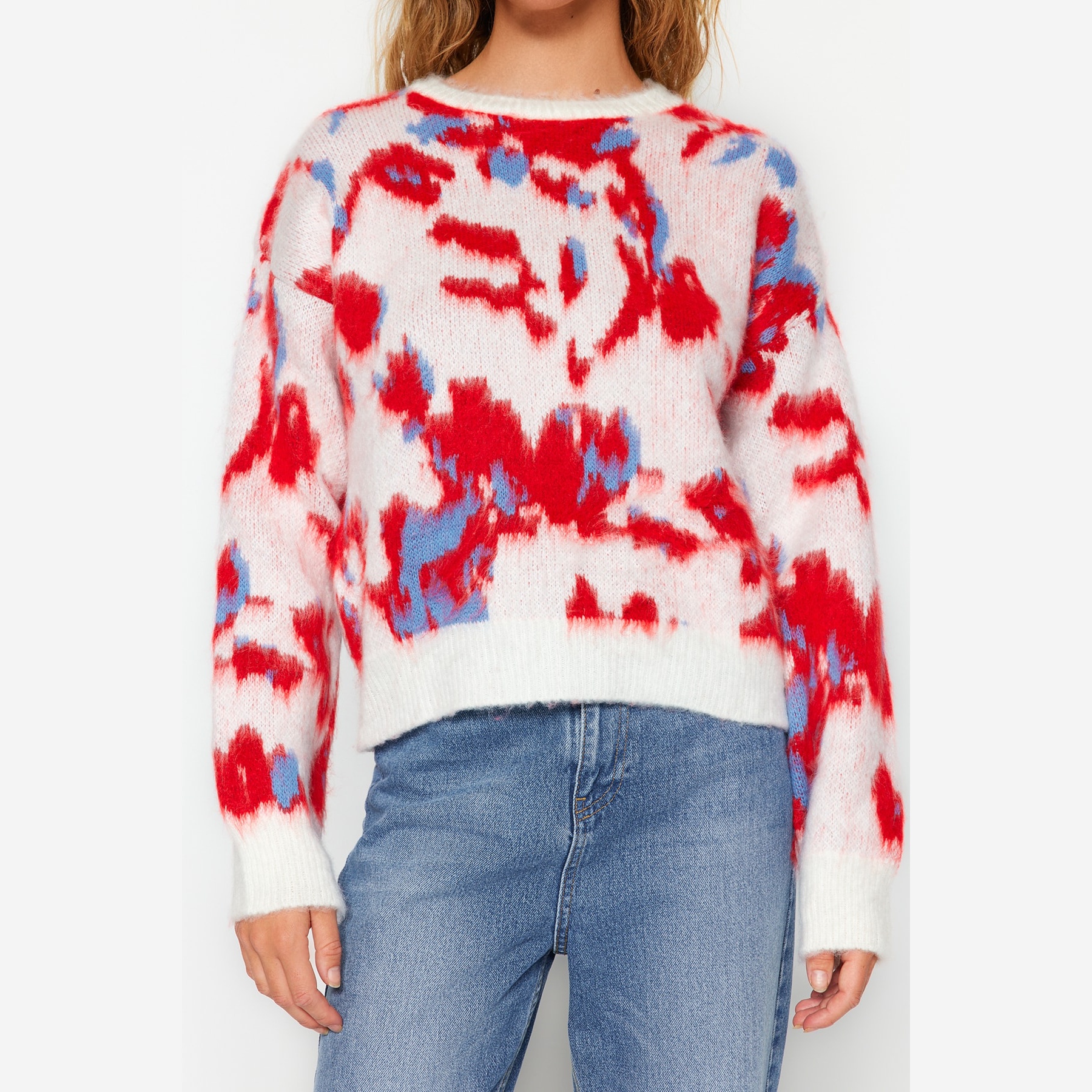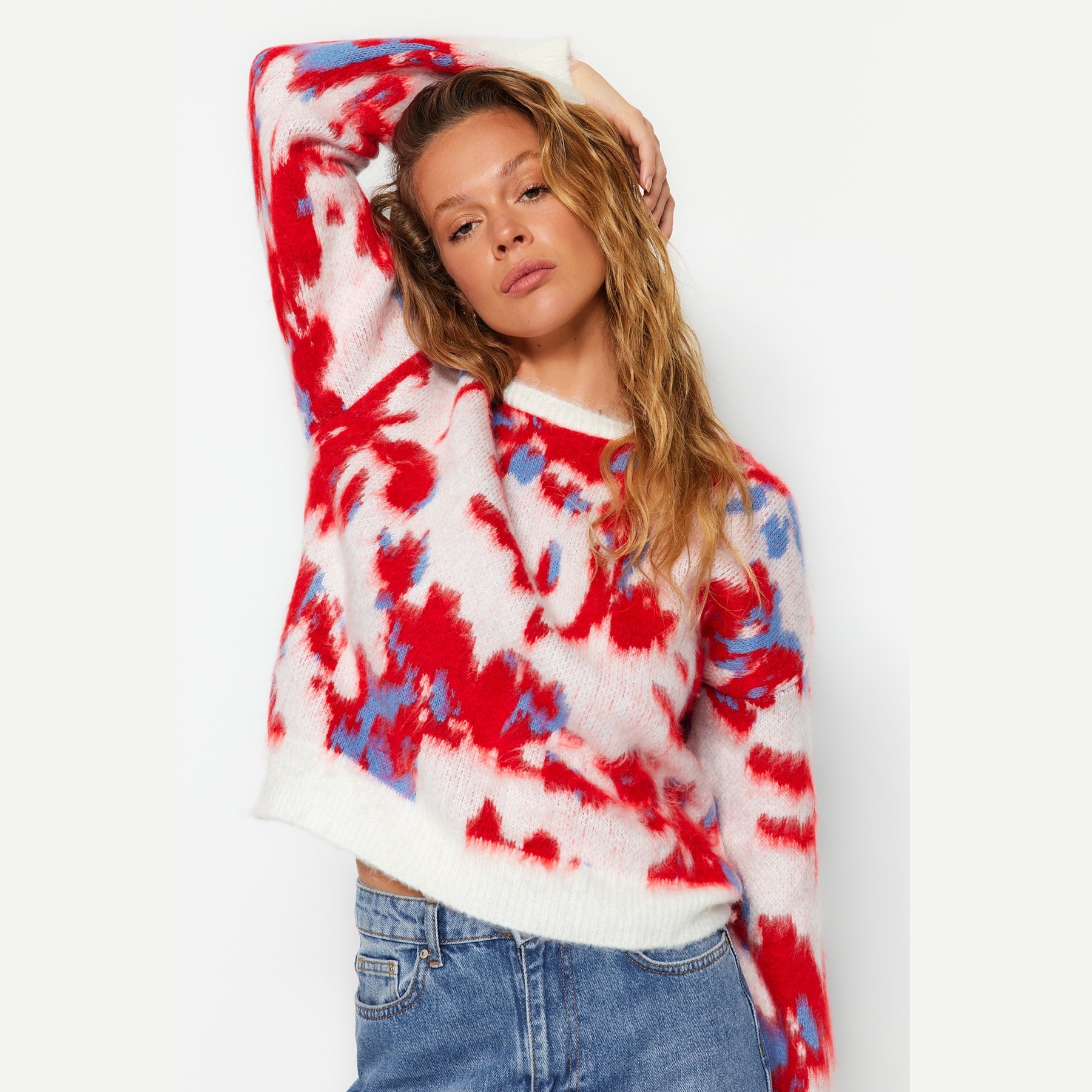 كنزة نسائية – إكرُو بنقشة باتيك وخامة تريكو ناعمة (دفء ناعم بلمسة فنية مميزة)