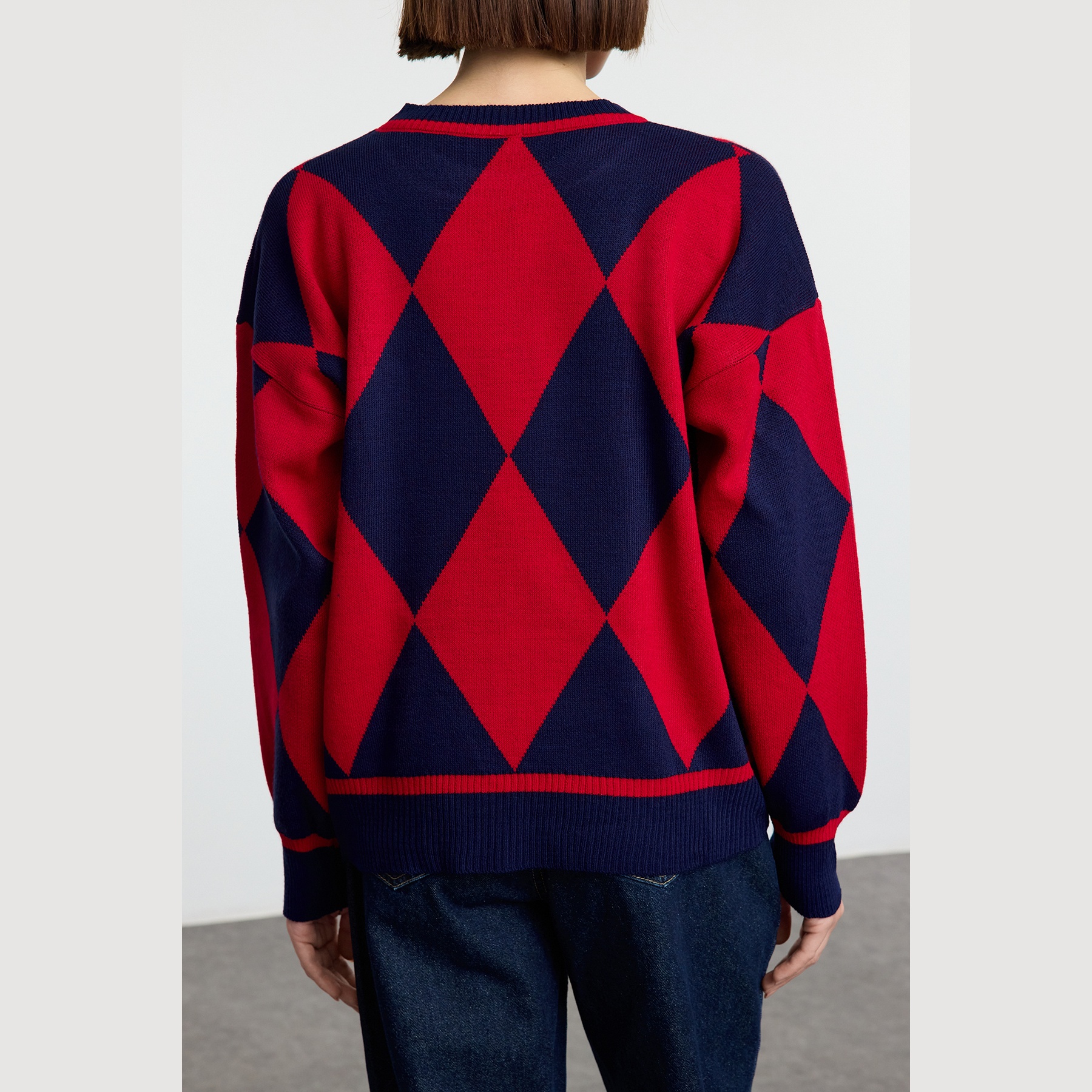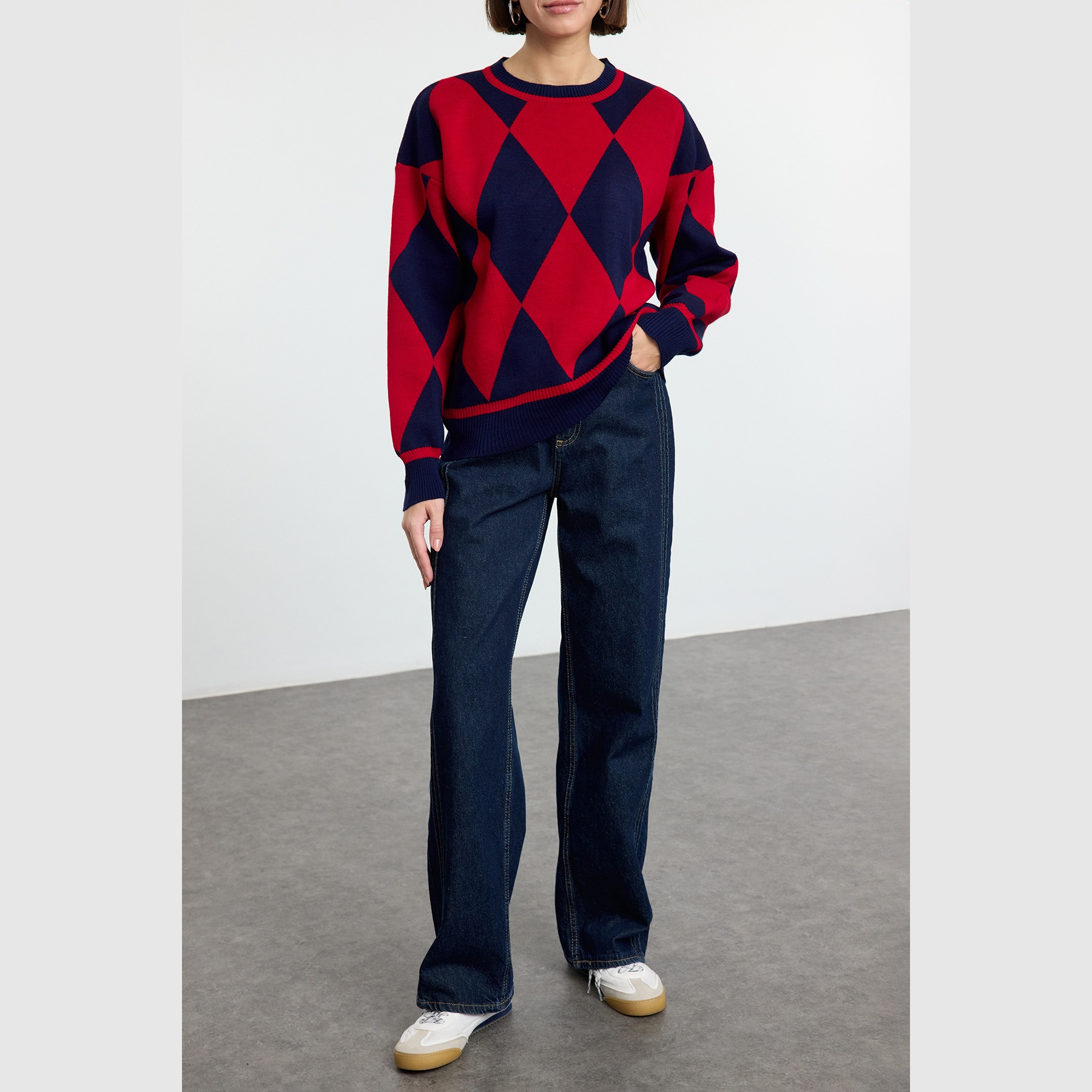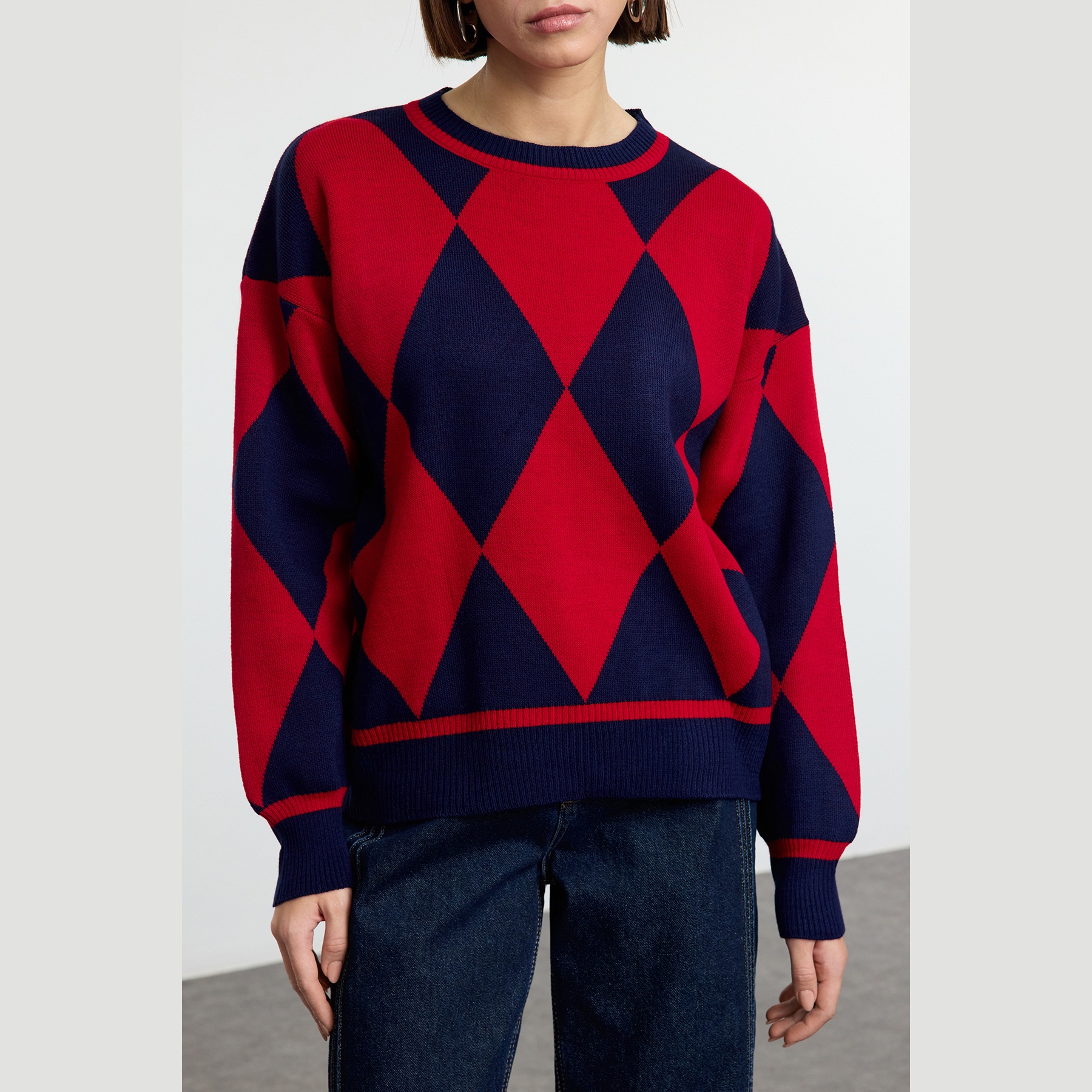 كنزة نسائية – كحلي بنقشة هندسية وياقة مستديرة من خامة تريكو ناعمة (دفء يومي بلمسة كلاسيكية)