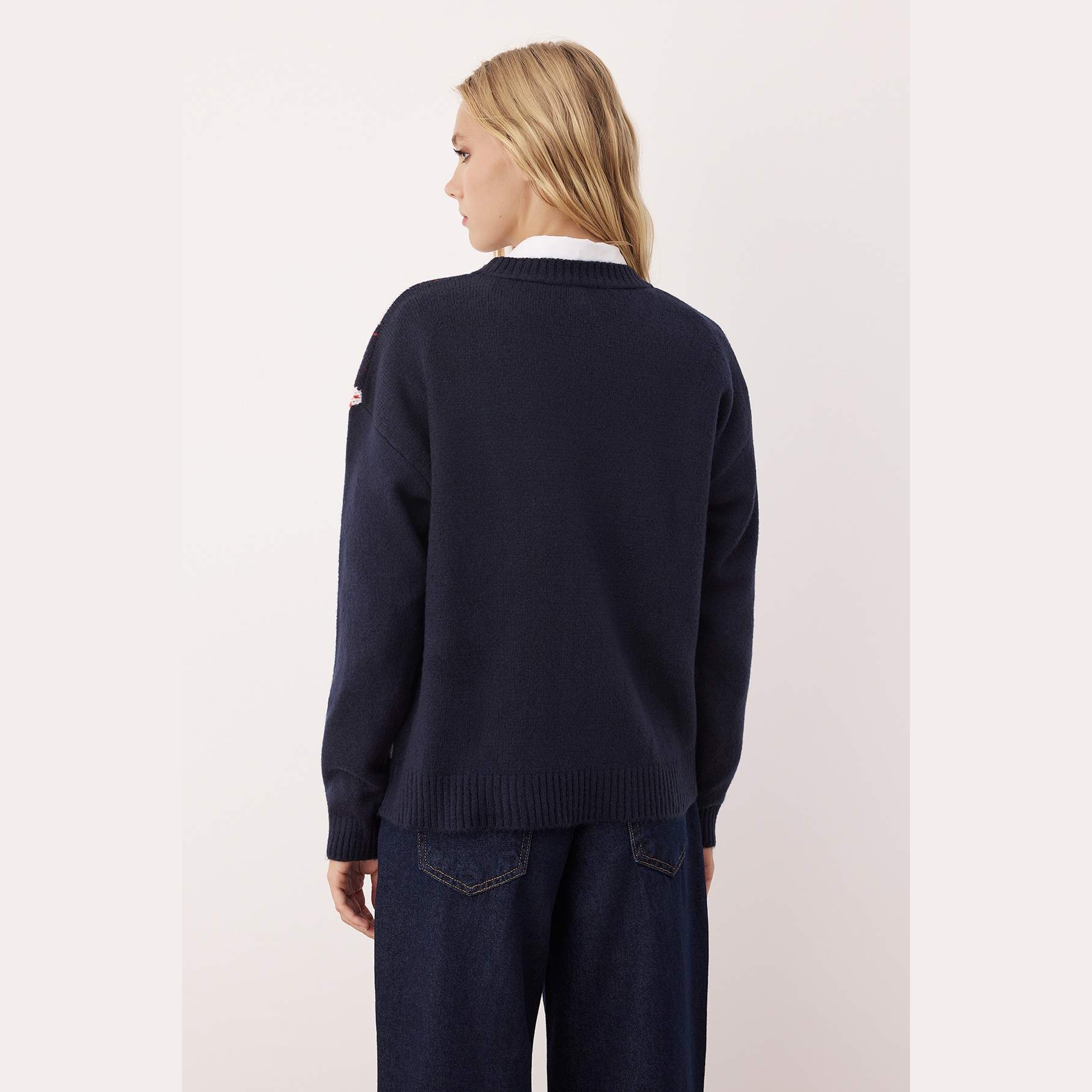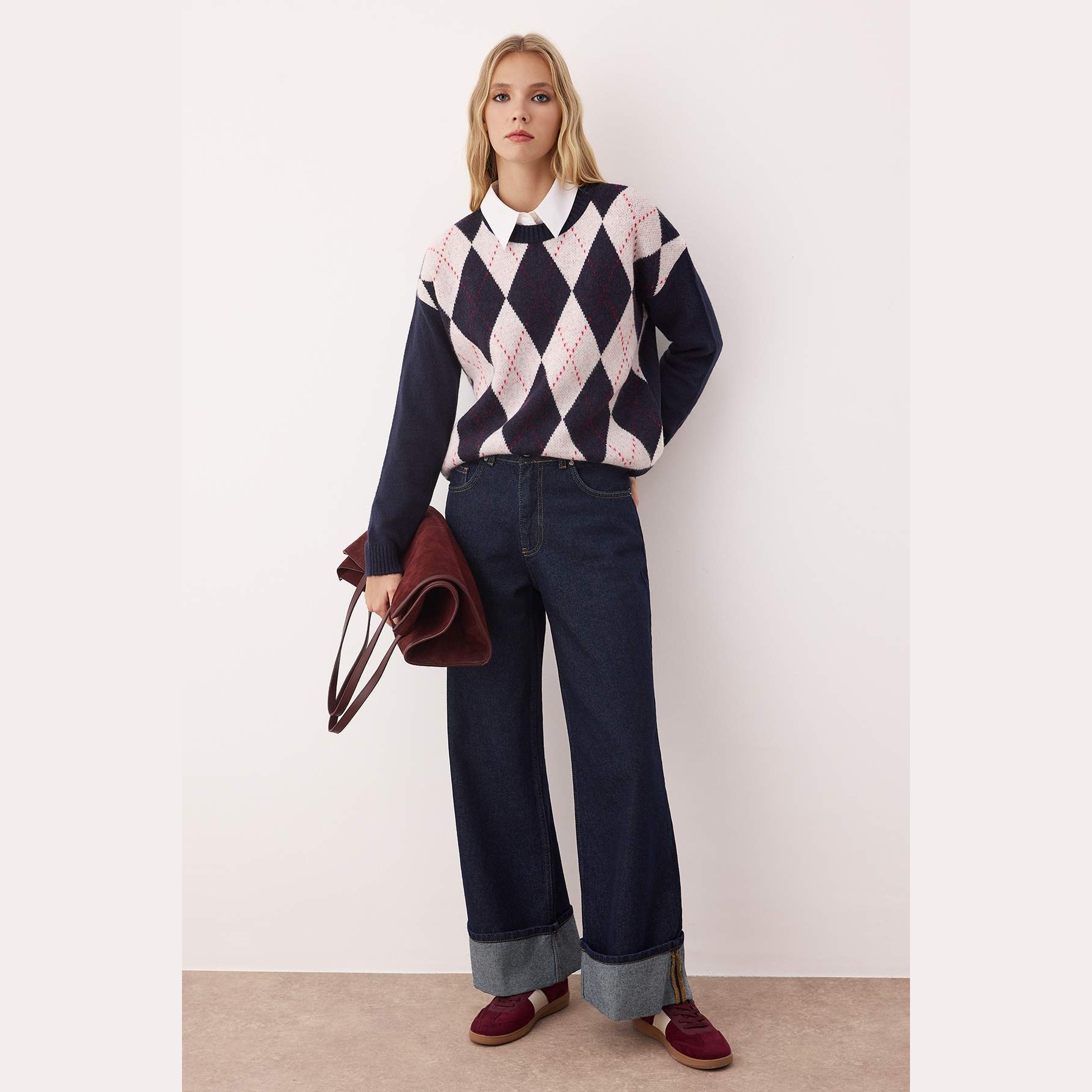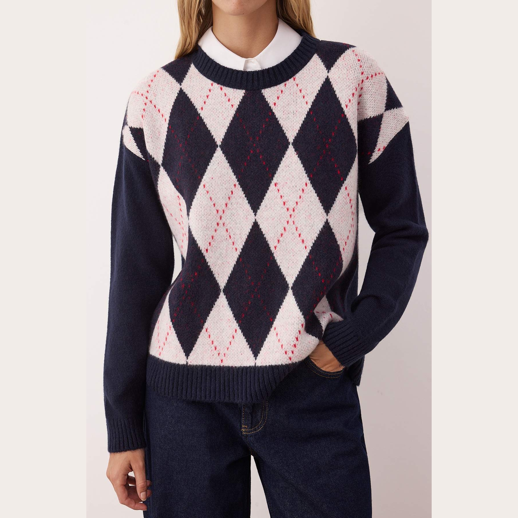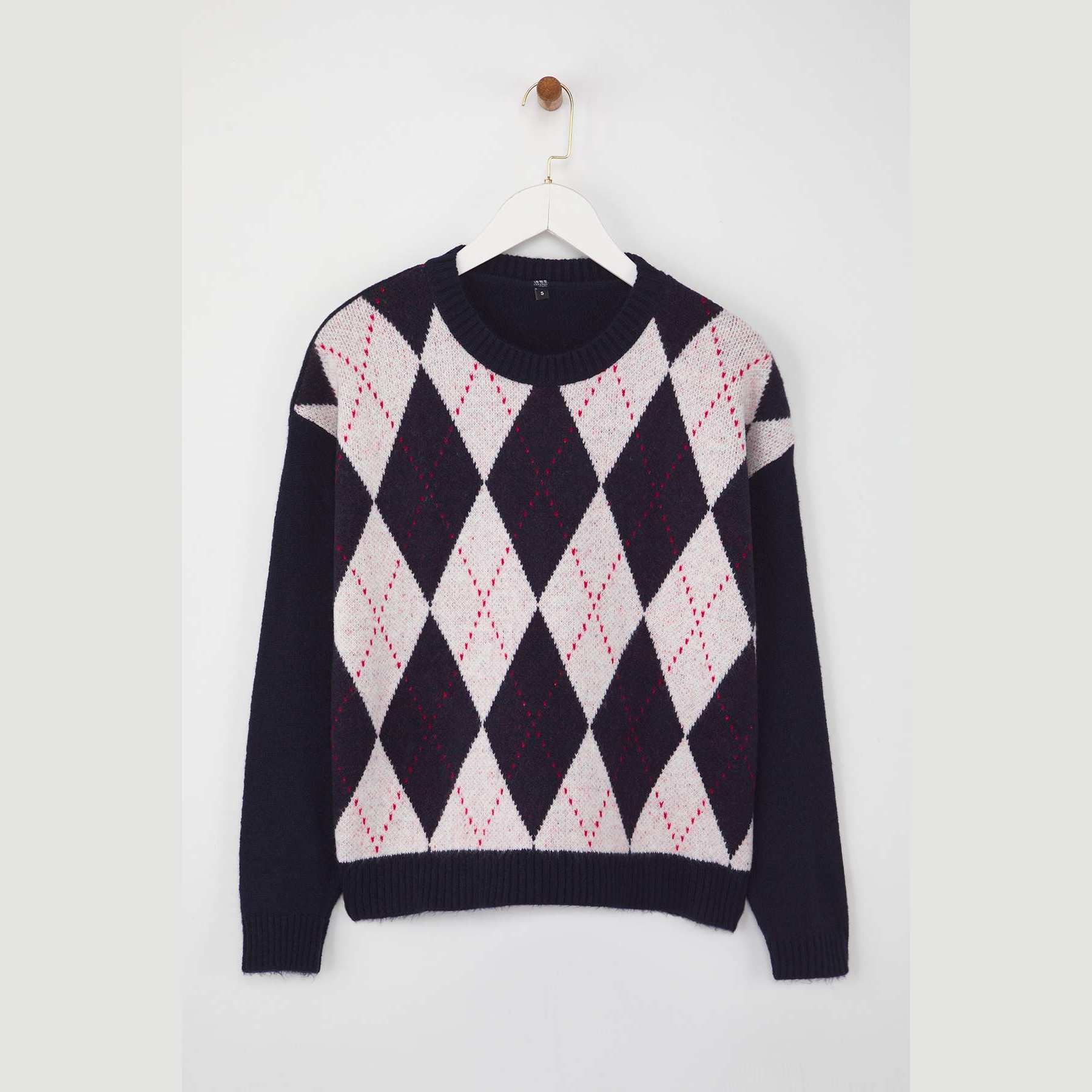 كنزة نسائية – كحلي بنقشة هندسية وقصة واسعة من خامة تريكو ناعمة (دفء يومي بلمسة عصرية)