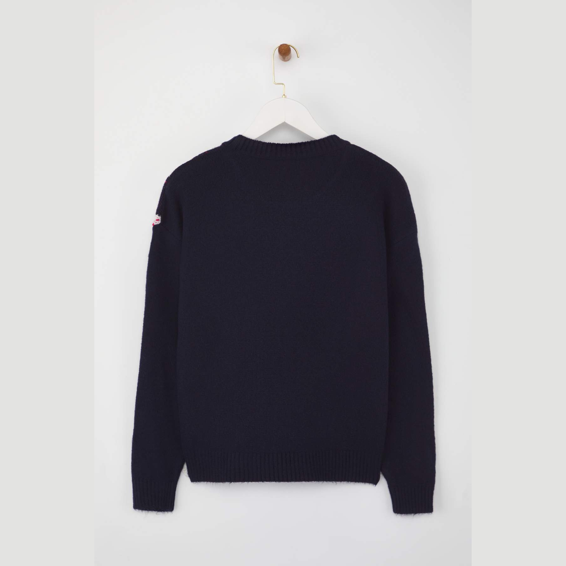 كنزة شتوية بلون كحلي أنيق، مصممة بقصة واسعة تمنحك راحة مثالية، مع خامة تريكو متوسطة السماكة بملمس ناعم ونقشة هندسية بارزة تضيف طابعًا عصريًا. تأتي بياقة مستديرة مغلقة، وأكمام طويلة بكتف منخفض، ما يجعلها خيارًا مثاليًا للإطلالات اليومية الشتوية التي تجمع بين الراحة والبساطة.