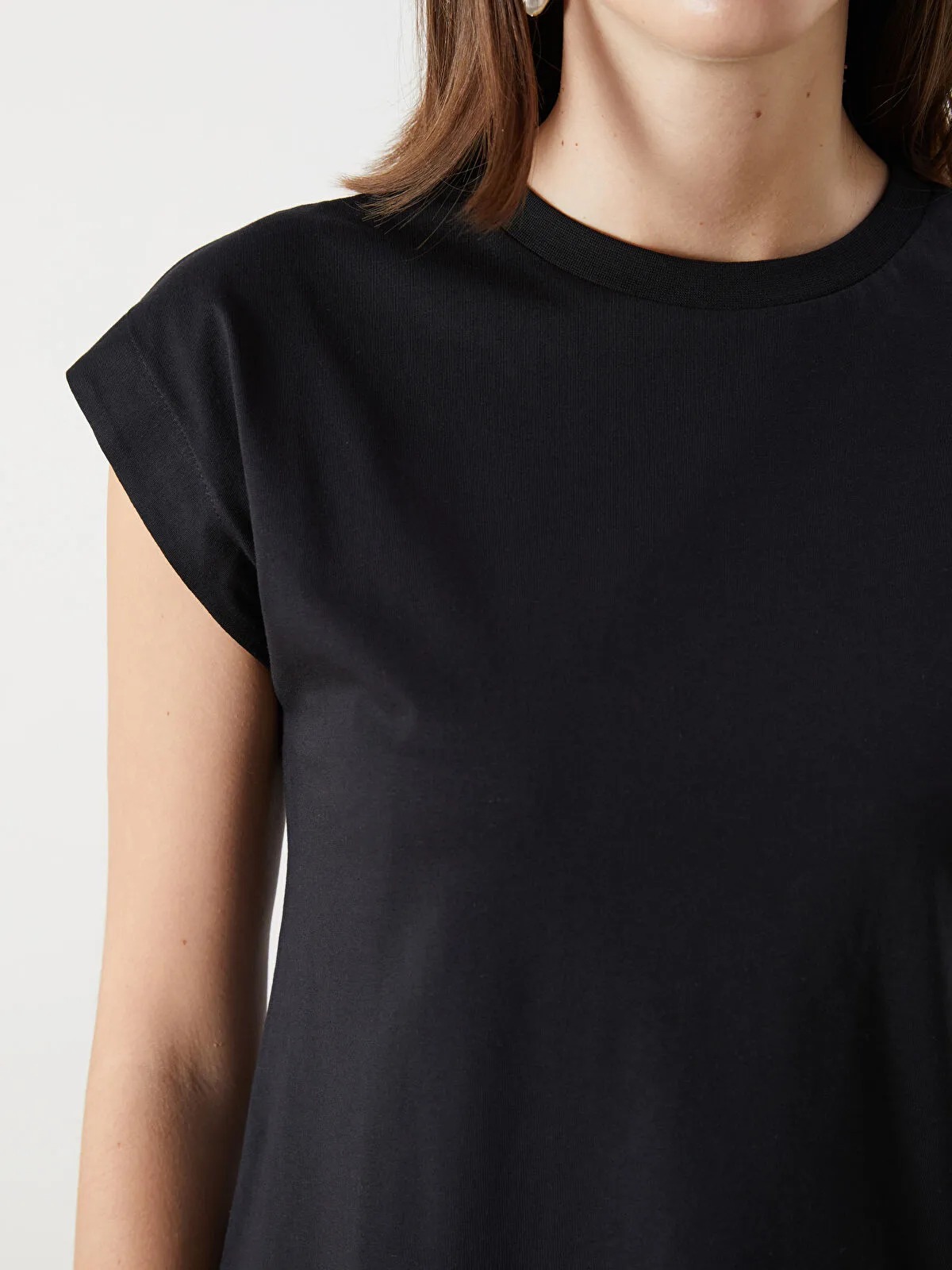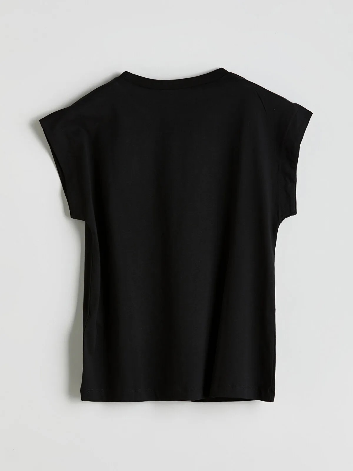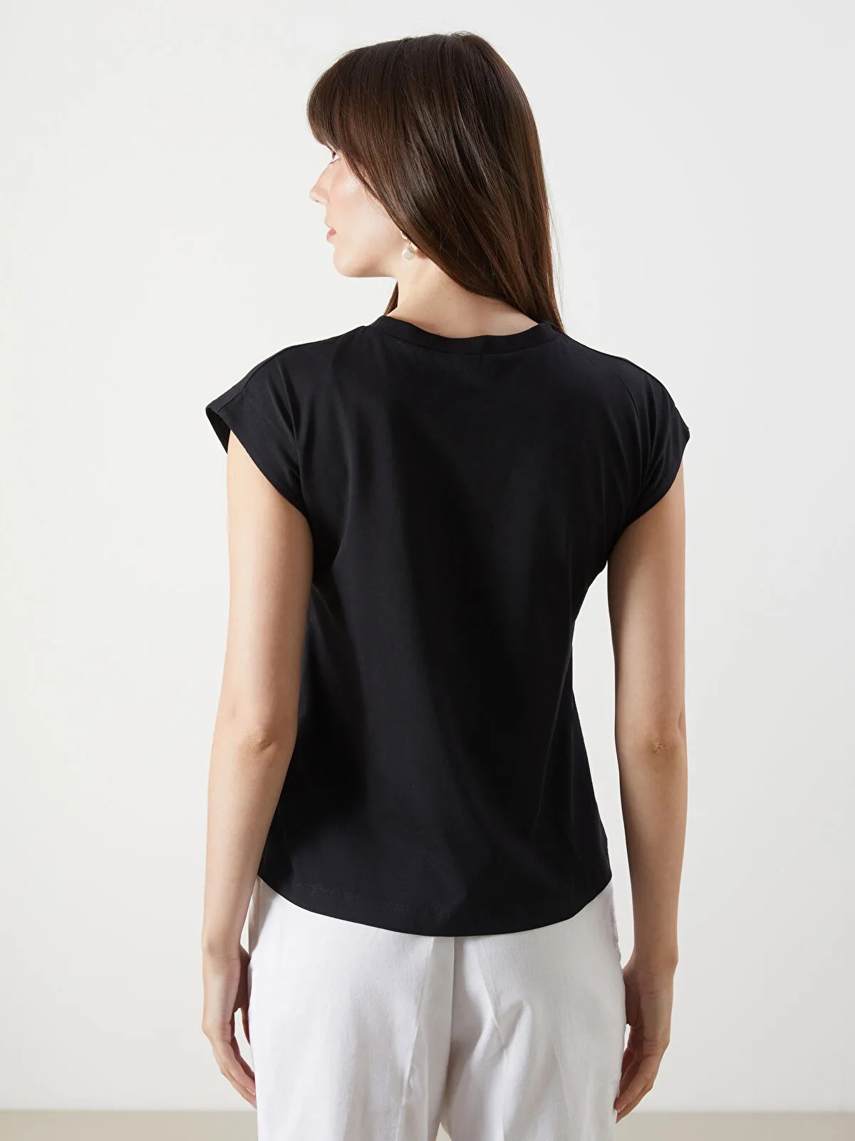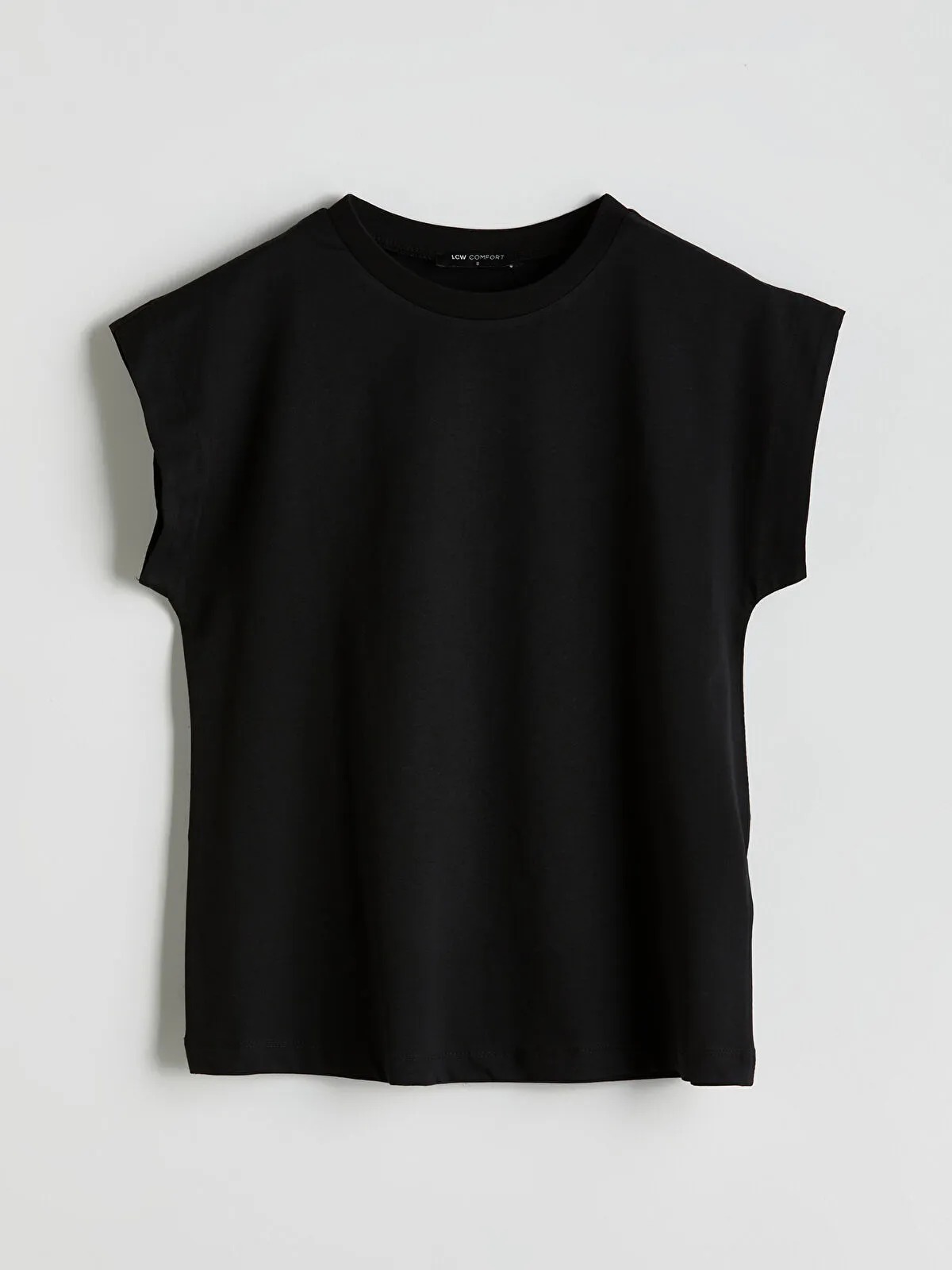 تيشيرت نسائي بلون أسود ناصع، بياقة دائرية قصيرة وأكمام قصيرة، بتصميم بسيط وأنيق. يحتوي على طبعة كلاسيكية بنسبة بسيطة أو بدون زخرفة، مما يمنحه مظهرًا راقياً وهادئاً يكمل الإطلالة الكاجوال اليومية بتوازن.