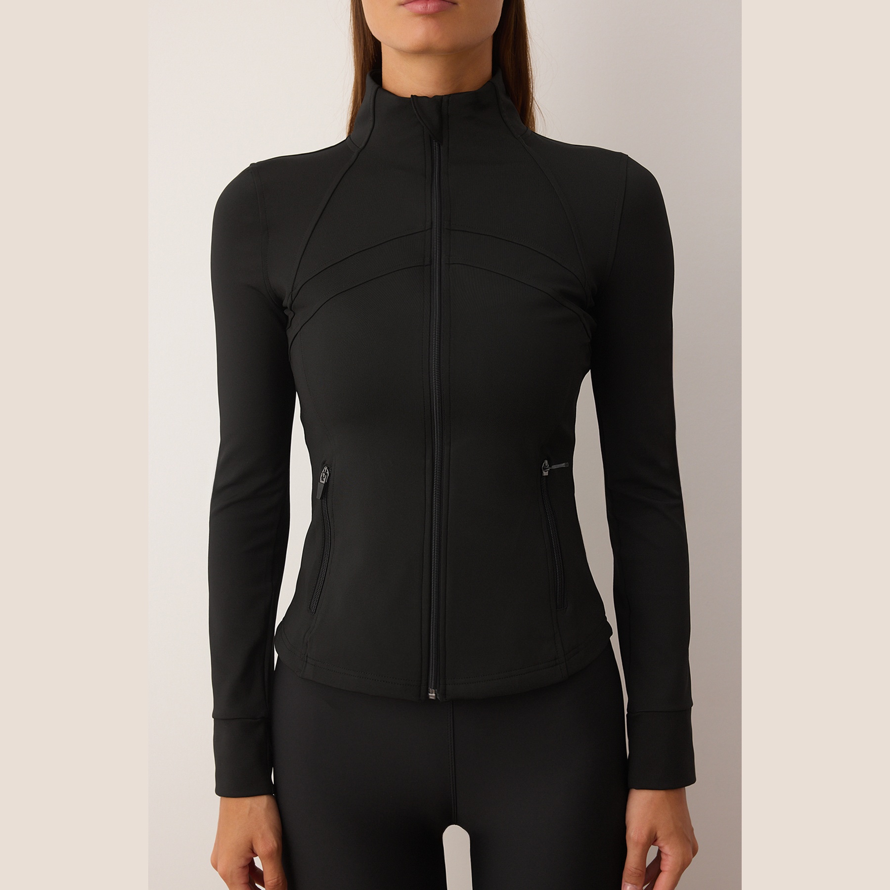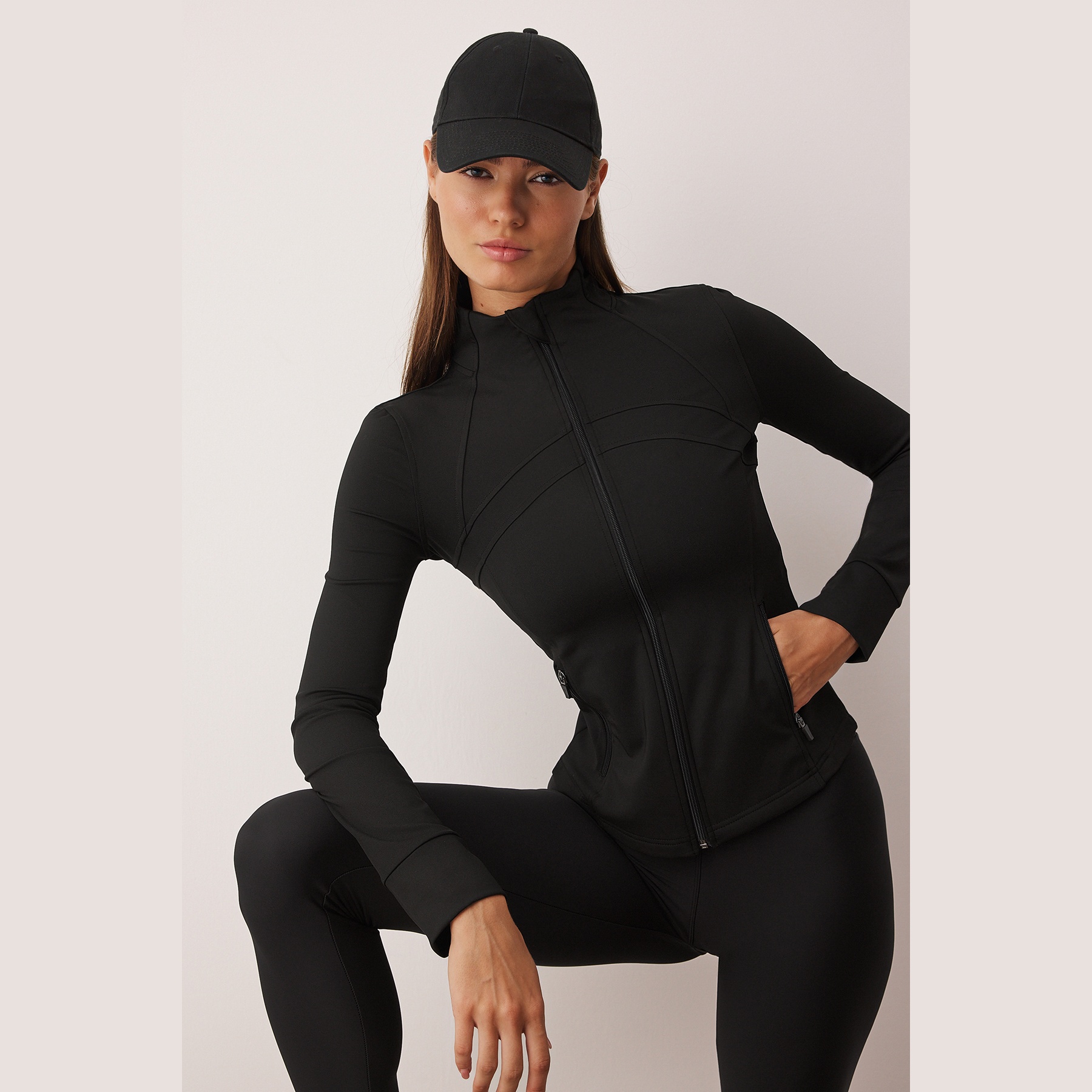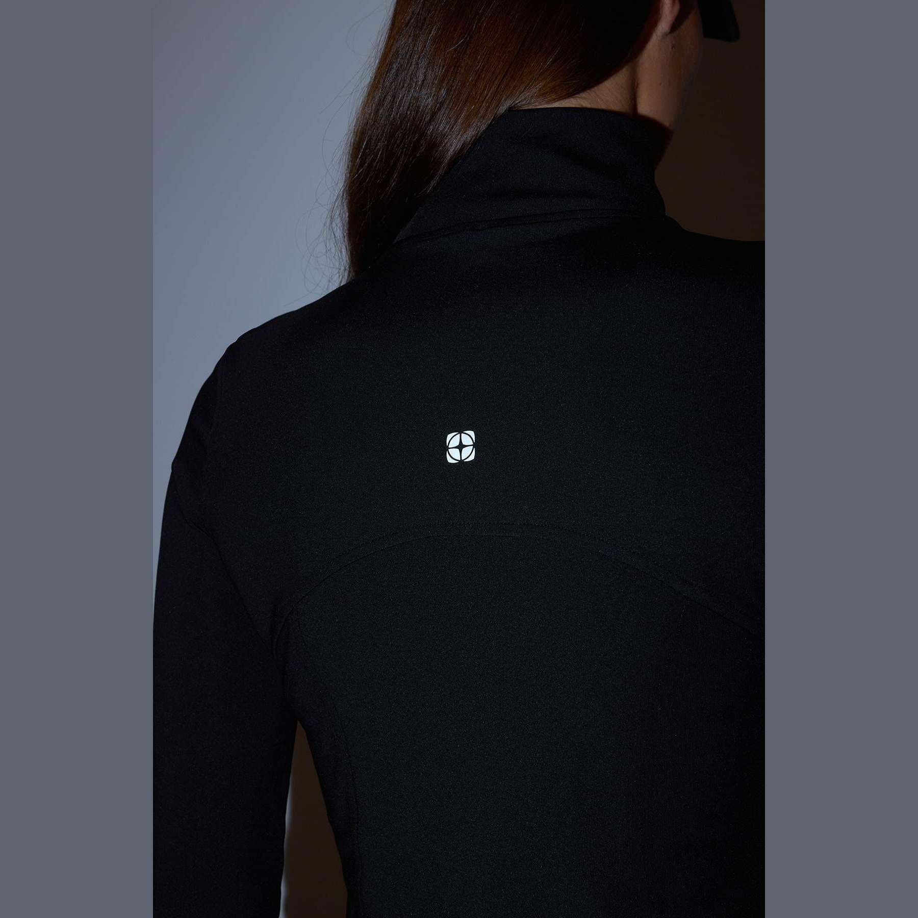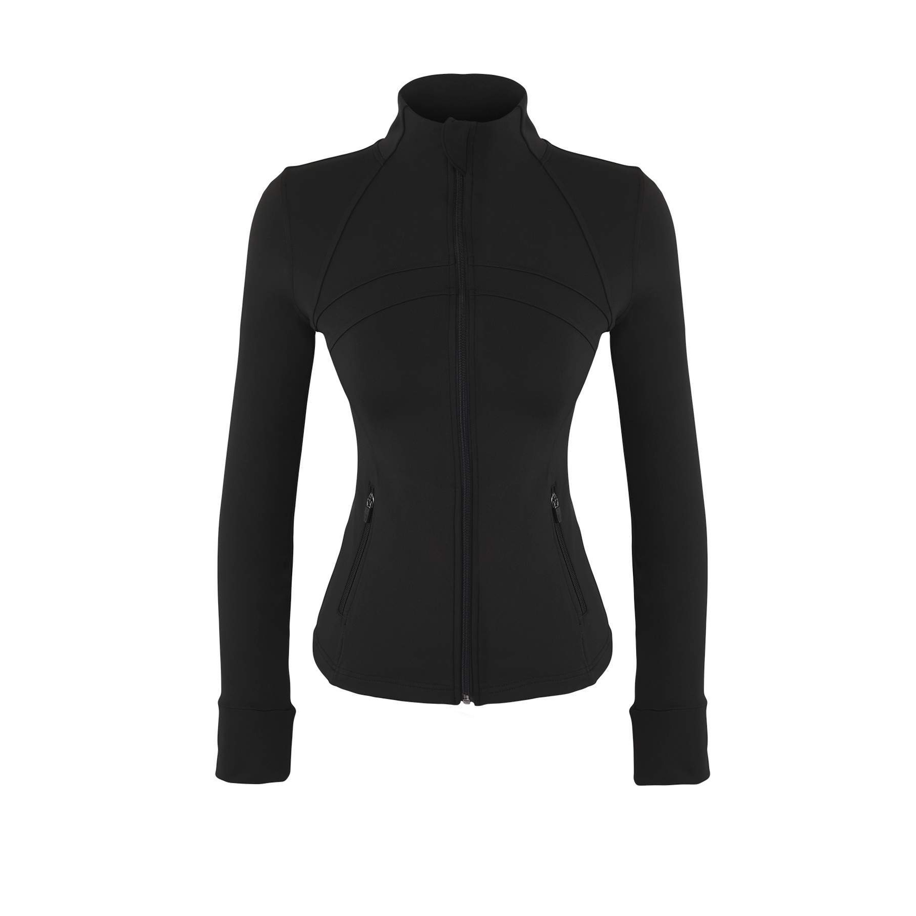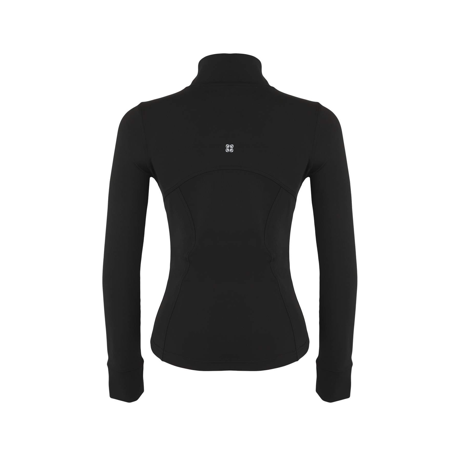 جاكيت رياضي بلون أسود أنيق، مصنوع من قماش سكوبا المرن والمريح، بتصميم محاك وقصة ضيقة تبرز القوام. يتميز بياقة عالية مغلقة، وأكمام طويلة بتصميم كتف مائل، مع طبعة عاكسة تضيف لمسة عصرية وعملية في الإضاءة المنخفضة. مثالي للأنشطة الرياضية أو الإطلالات اليومية في الطقس المعتدل.