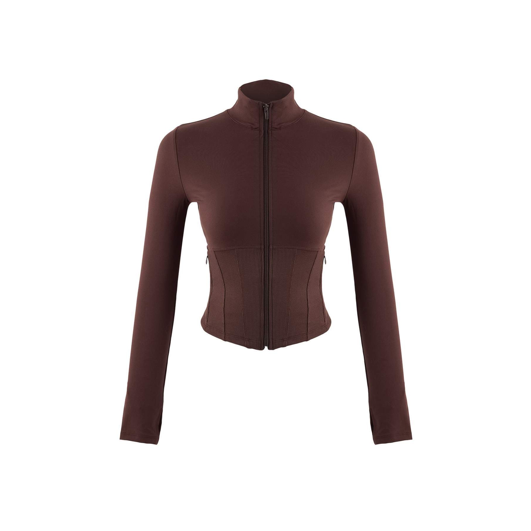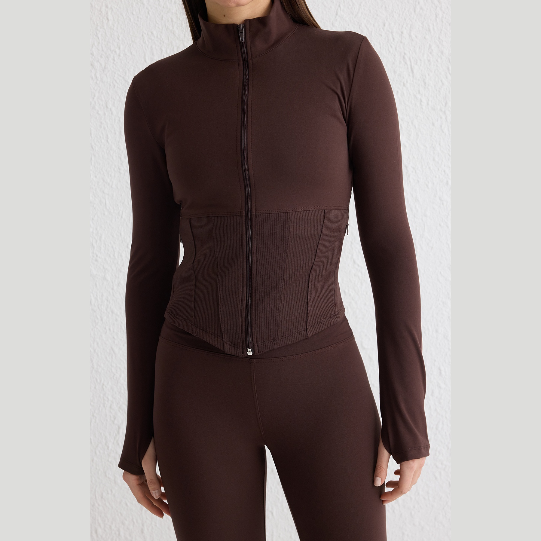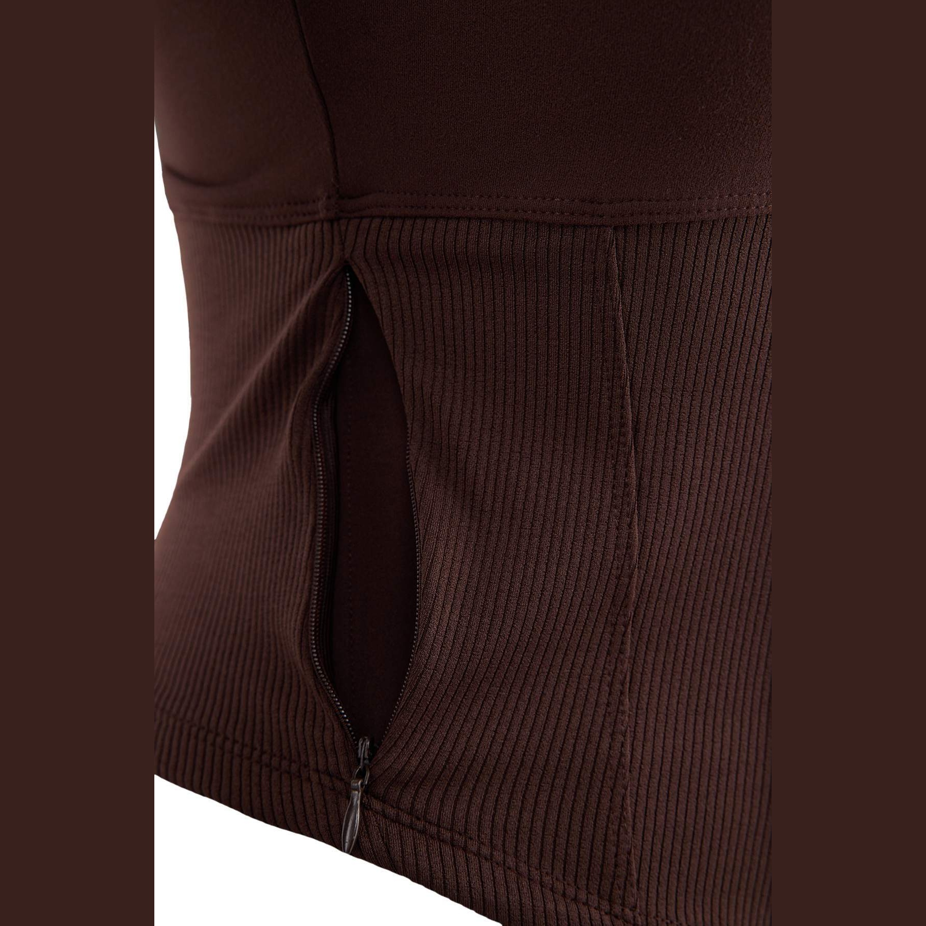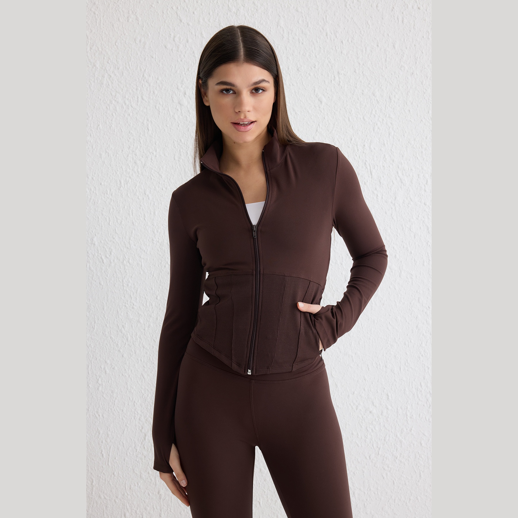 جاكيت رياضي نسائي – بني من خامة ناعمة بفتحة للإبهام (راحة يومية وأناقة رياضية)