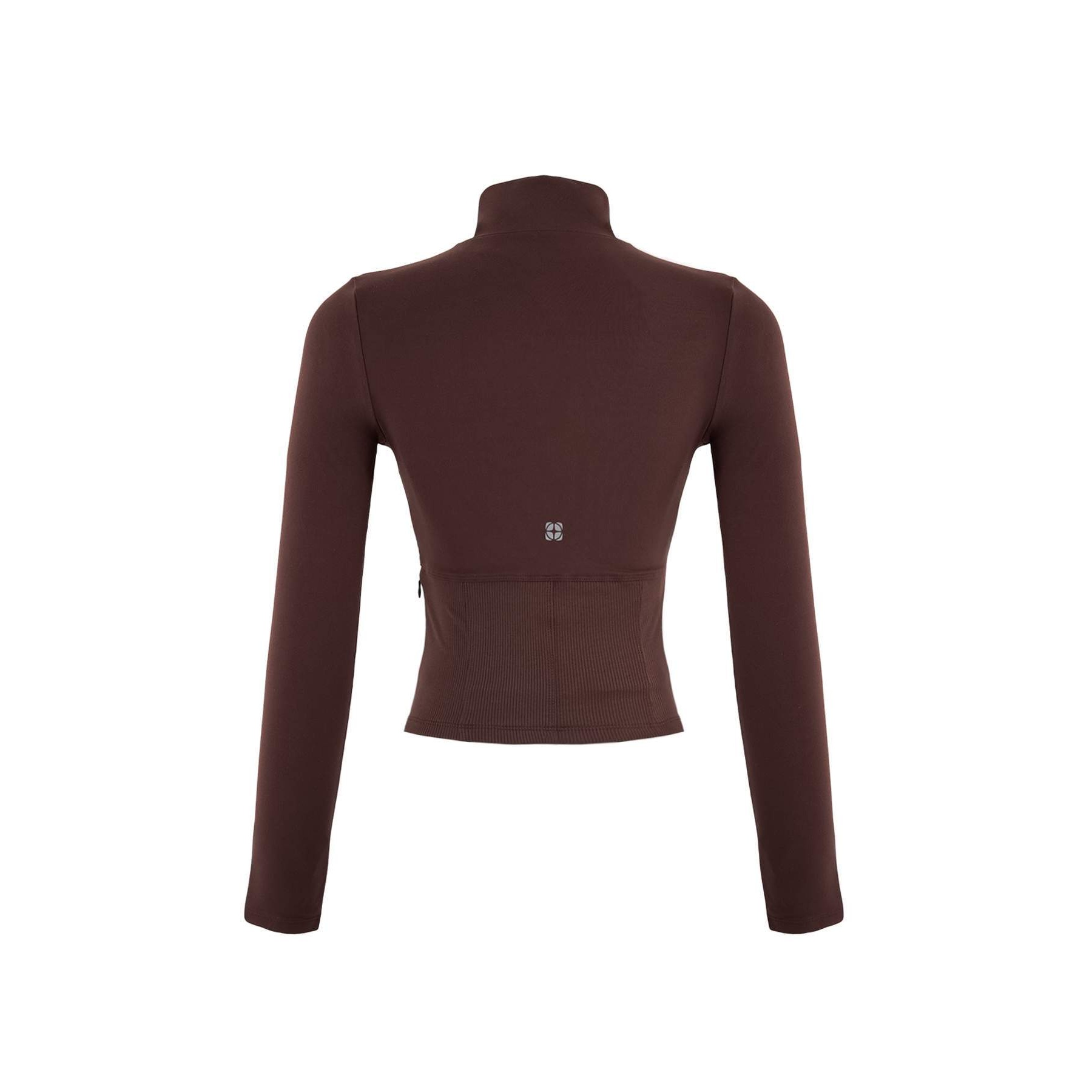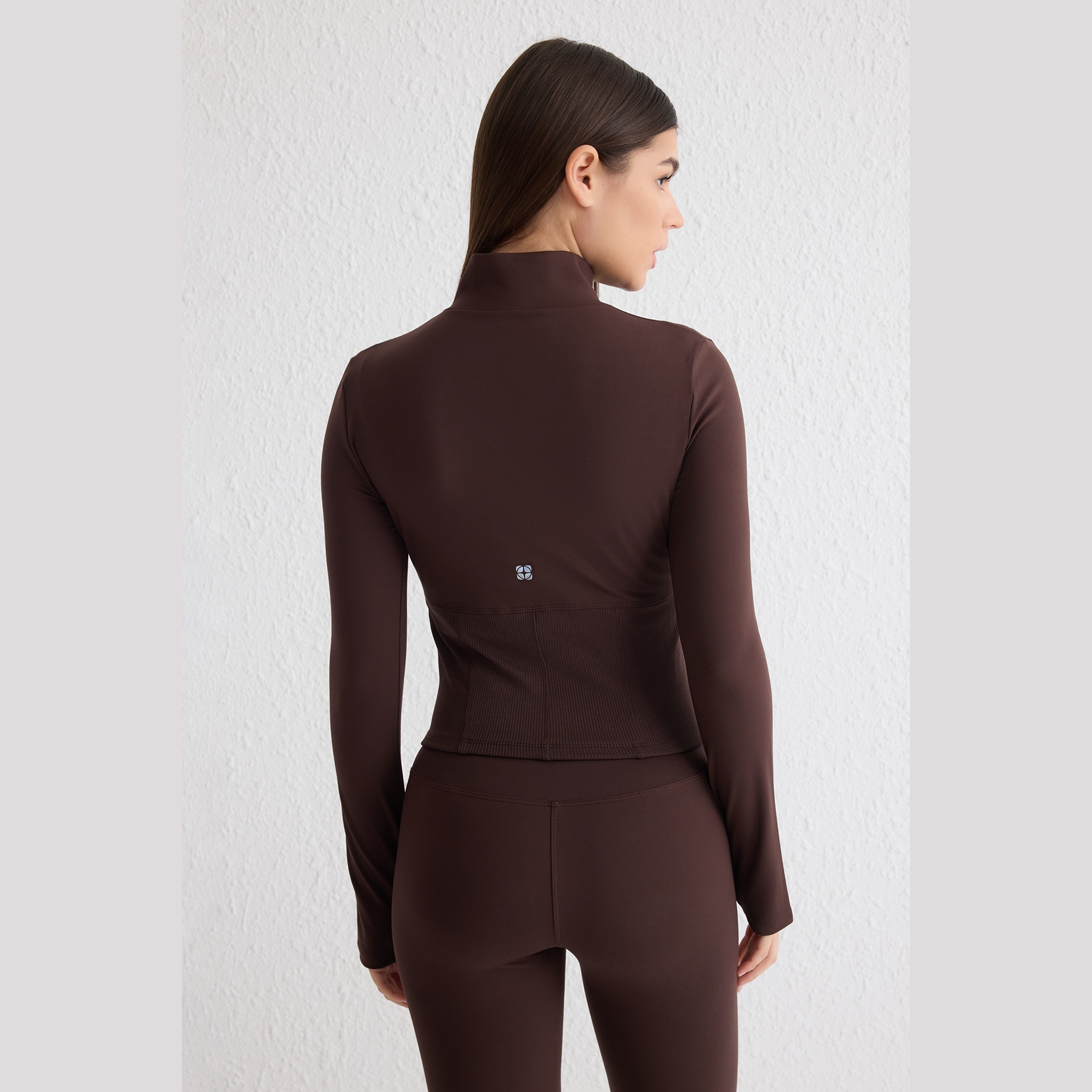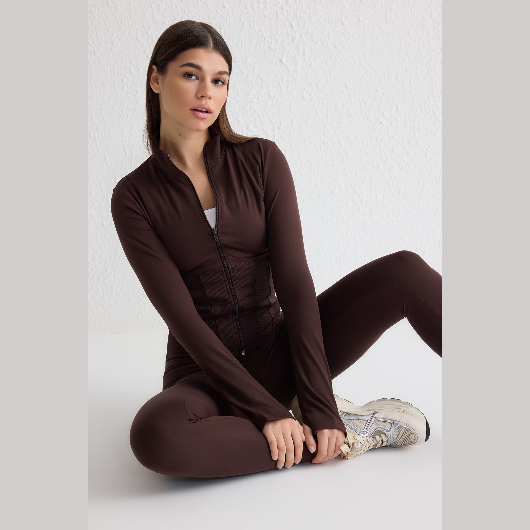 جاكيت رياضي بلون بني دافئ، مصنوع من خامة ناعمة فُرشَت بخفة لتمنحك دفئًا وراحة في جميع المواسم. يتميز بياقة عالية مغلقة، وأكمام طويلة مزودة بفتحة للإبهام لتثبيت الكم أثناء الحركة، مع قصة منتظمة وخامة محاكة مرنة، ما يجعله مثاليًا للأنشطة الرياضية أو الإطلالات اليومية المريحة.