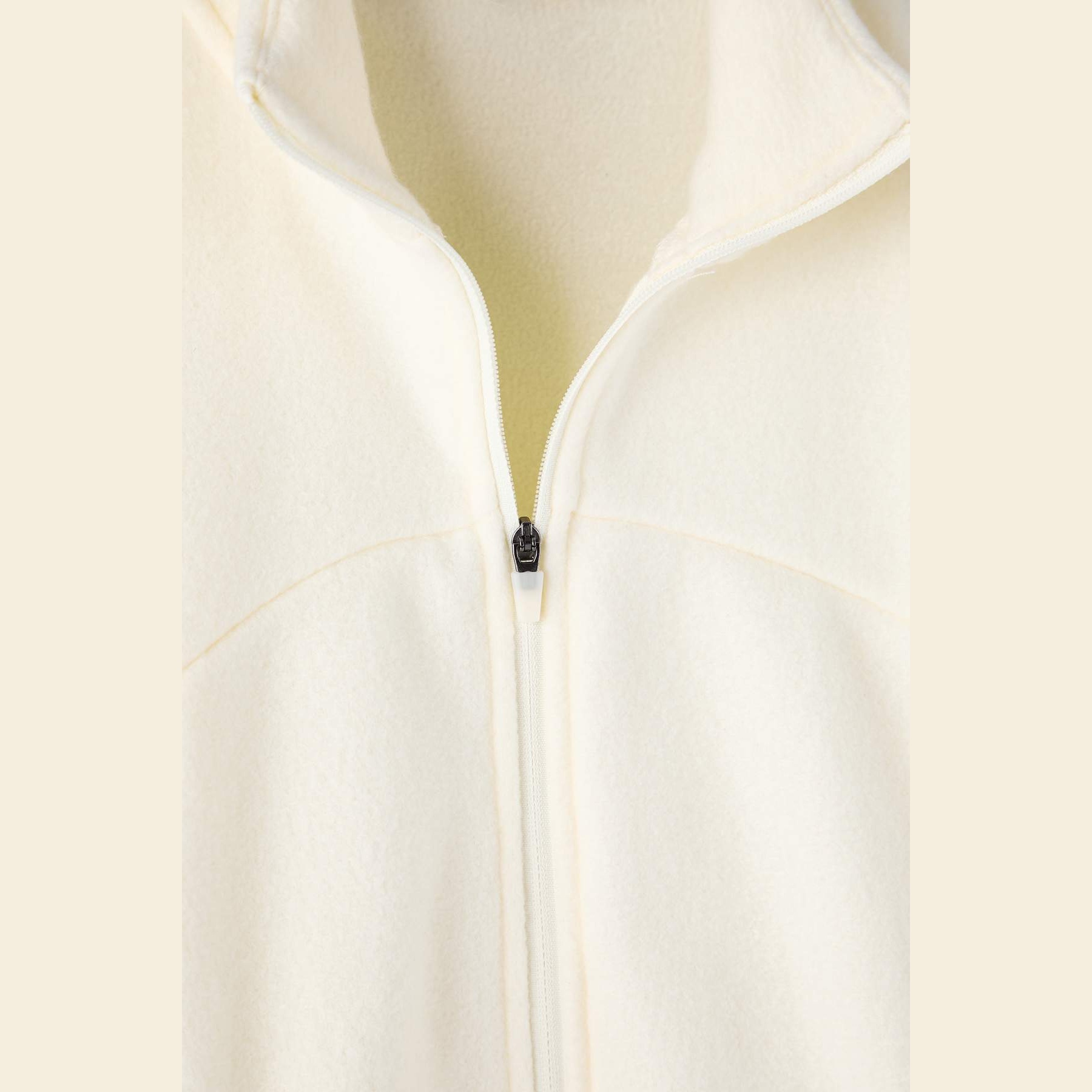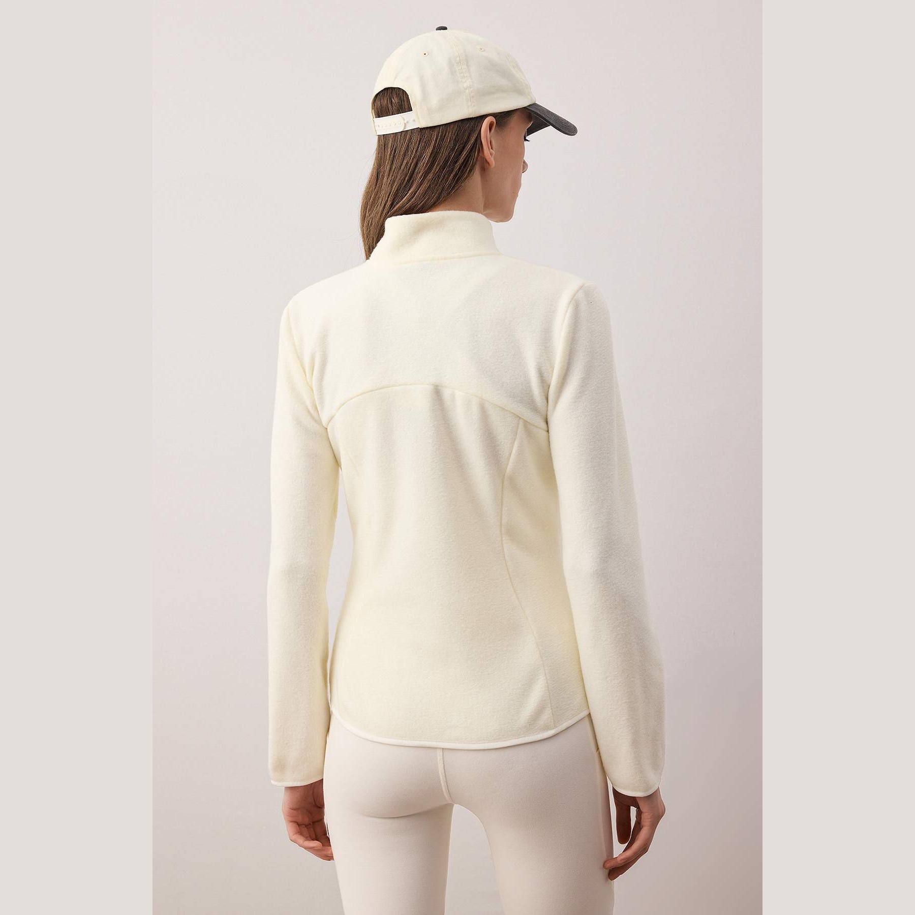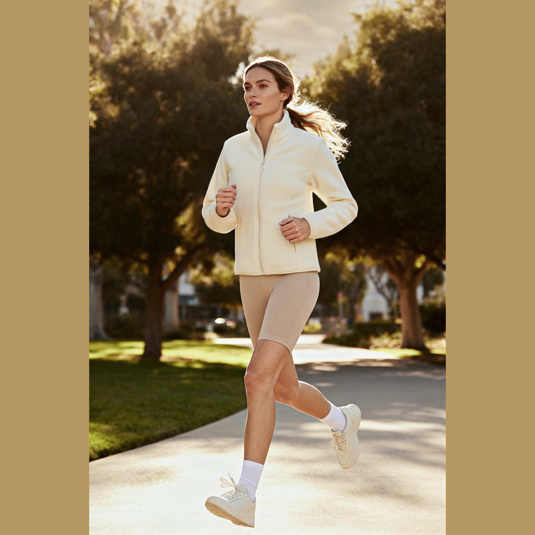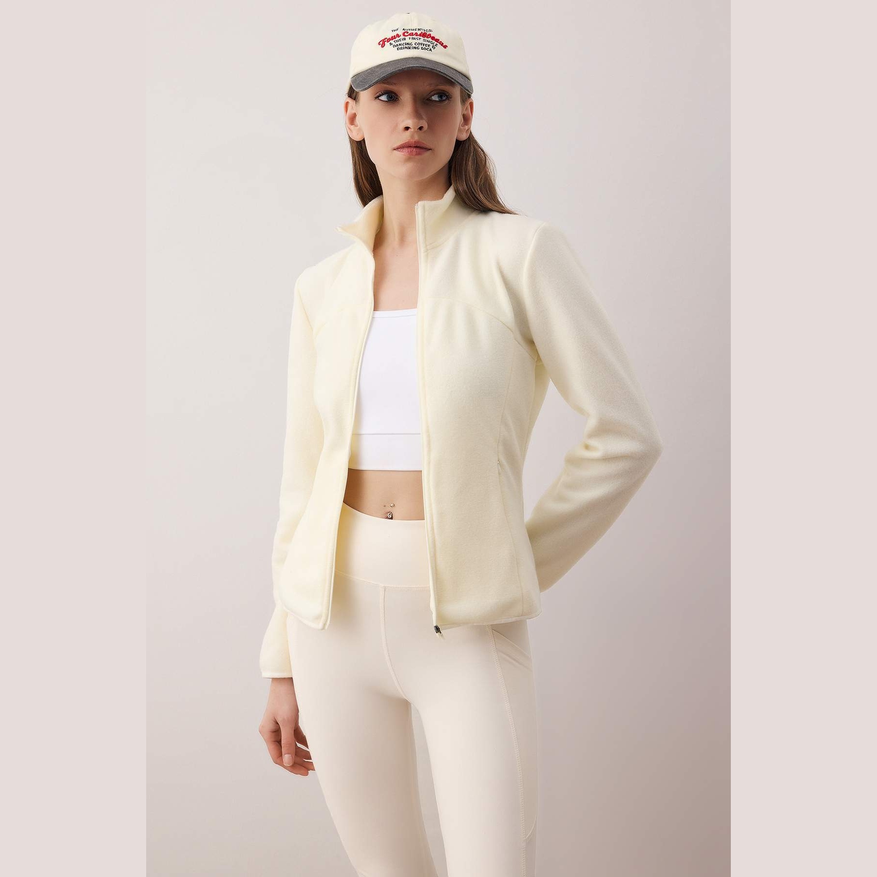 جاكيت رياضي بلون إكرُو هادئ، مصنوع من خامة بولار محاكة تمنحك دفئًا ناعمًا وملمسًا مريحًا في الأيام الباردة. يتميز بياقة عالية مغلقة، وأكمام طويلة، وقصة منتظمة تتيح حرية الحركة، ما يجعله مثاليًا للإطلالات اليومية أو التمارين الخفيفة في الطقس البارد.