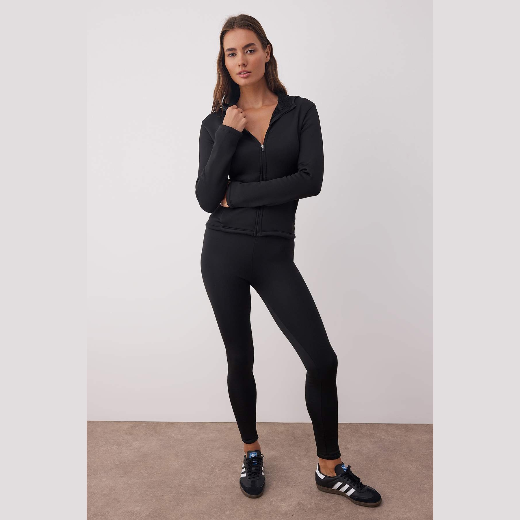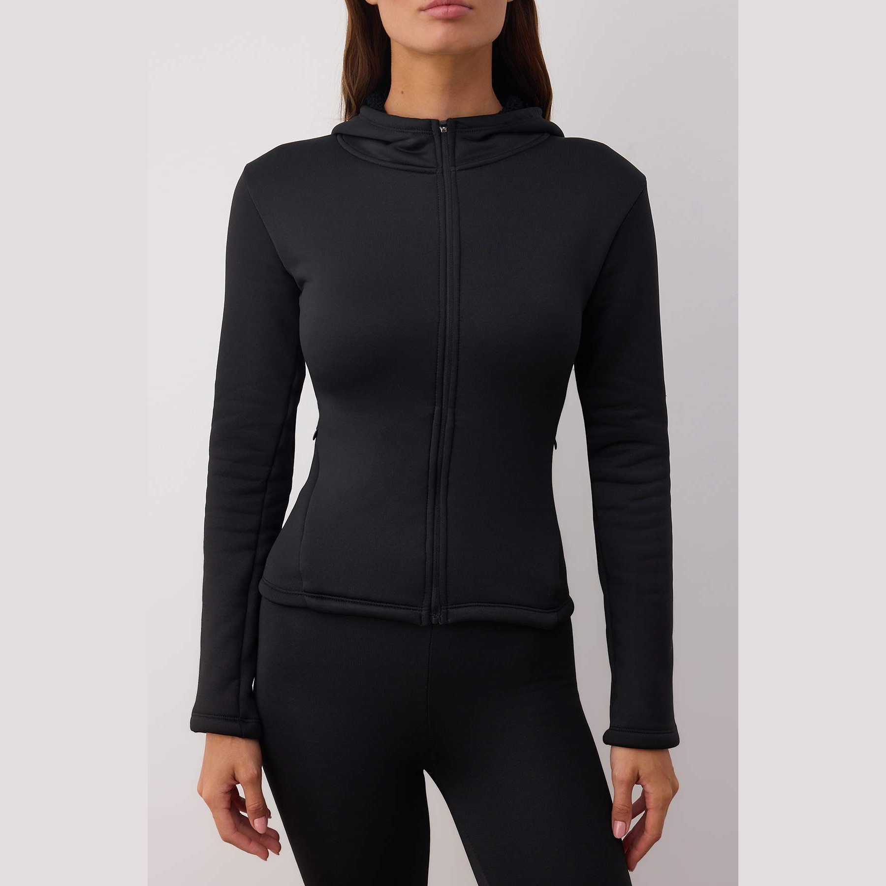 جاكيت رياضي بلون أسود عملي، مصنوع من قماش سكوبا المرن، ومبطن من الداخل بطبقة بولار ناعمة تمنحك دفئًا إضافيًا في الطقس البارد. يتميز بسحاب أمامي كامل، وقبعة مريحة للحماية من الرياح، مع قصة ضيقة تبرز القوام وخامة محاكة مرنة. مثالي للأنشطة الخارجية أو الإطلالات اليومية في الشتاء.