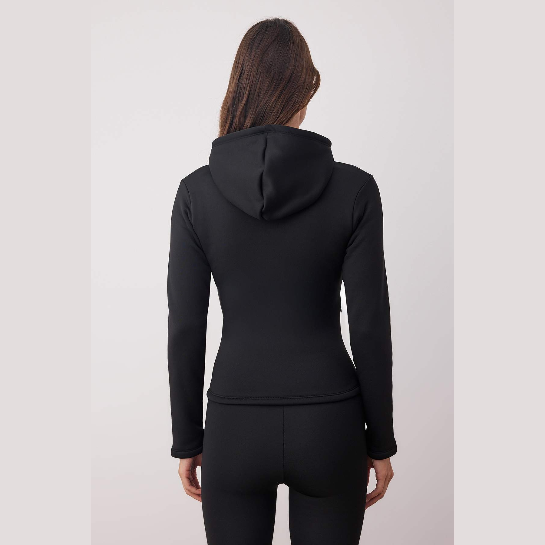 جاكيت رياضي نسائي – أسود من قماش سكوبا ببطانة بولار وقبعة (دفء وأداء في تصميم أنيق)