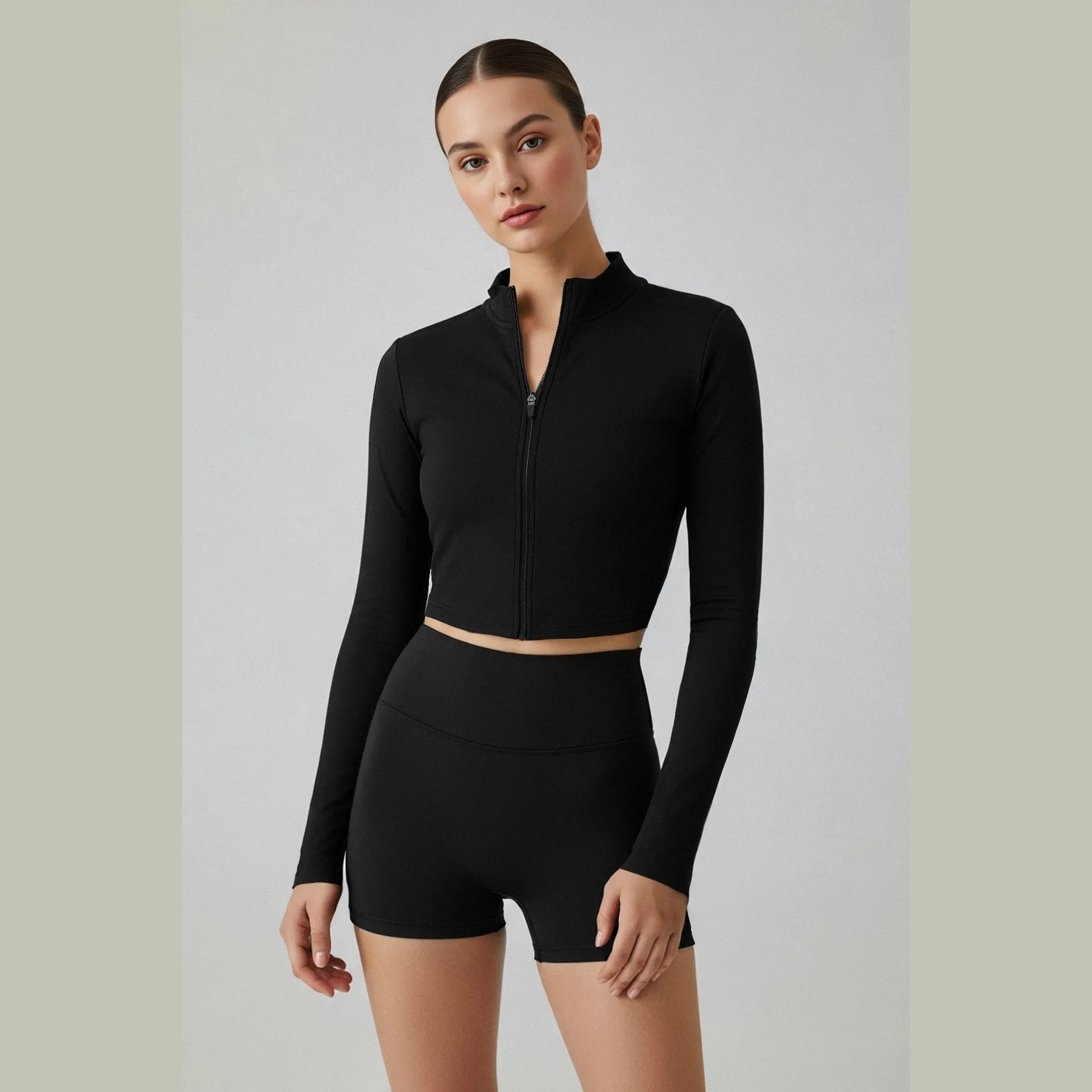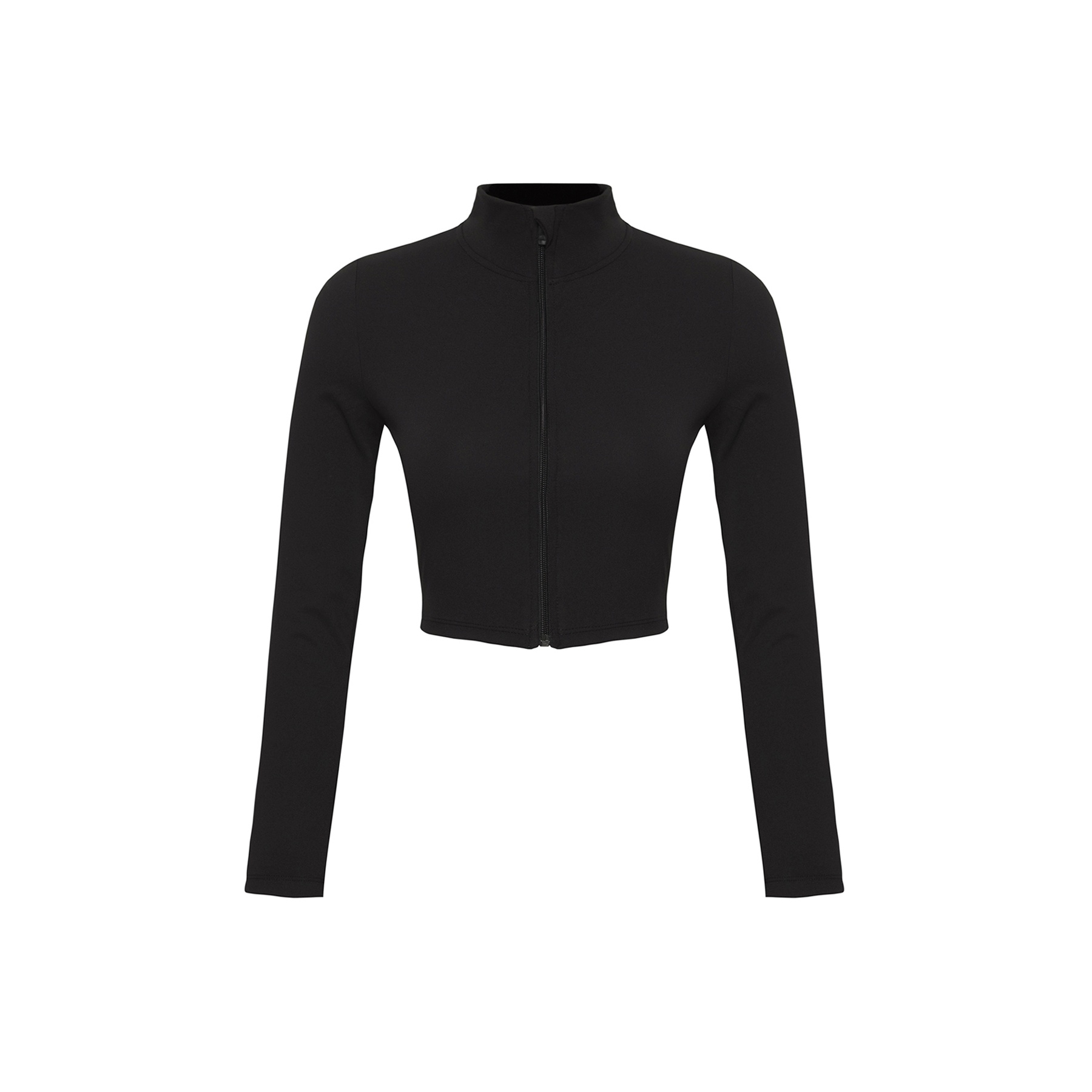 جاكيت رياضي بلون أسود أنيق، مصنوع من خامة ناعمة فُرشَت بخفة لتمنحك ملمسًا مريحًا ودفئًا معتدلًا. يتميز بسحاب أمامي كامل لسهولة الارتداء، وياقة عالية مغلقة، مع قصة ضيقة تبرز القوام وخامة محاكة مرنة، ما يجعله مثاليًا للأنشطة الرياضية أو الإطلالات اليومية العملية.