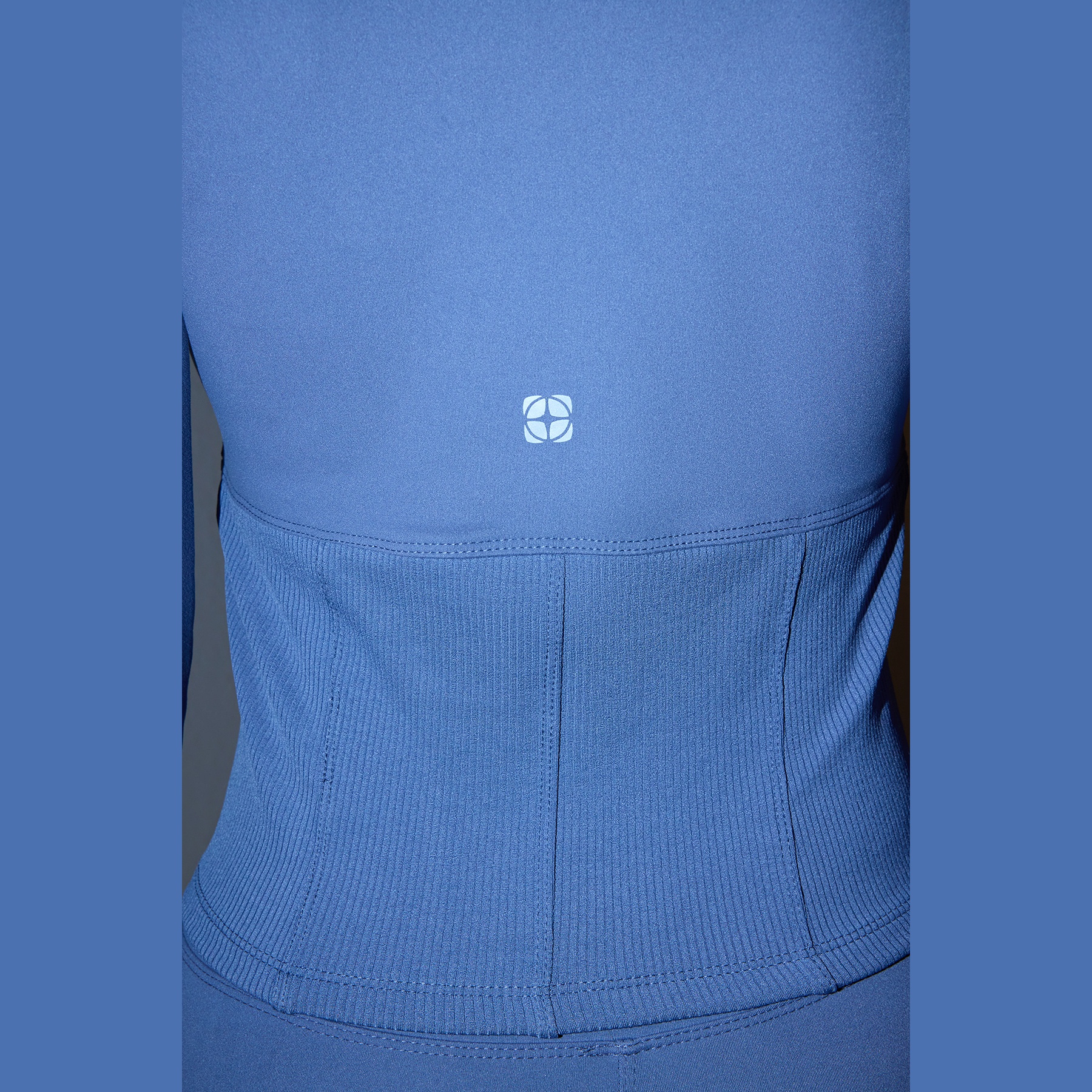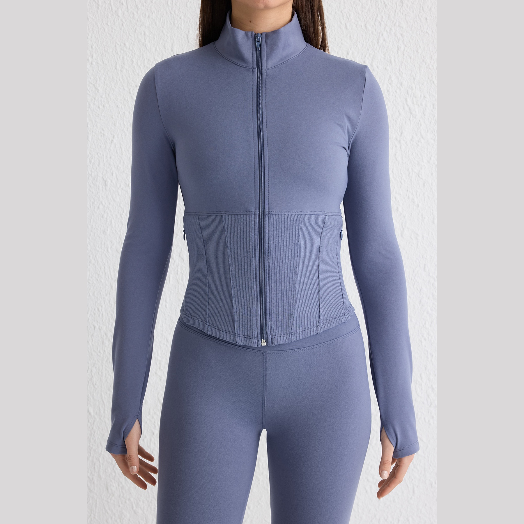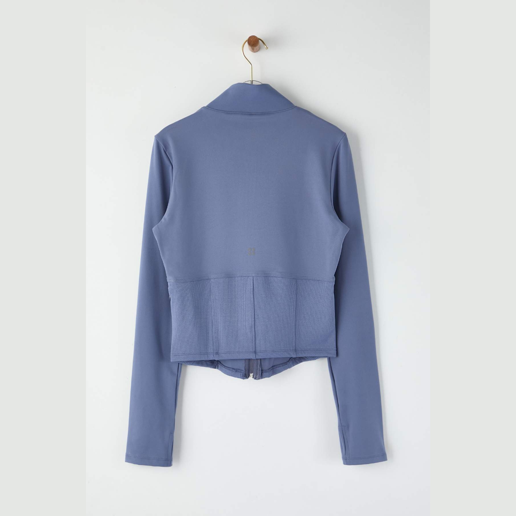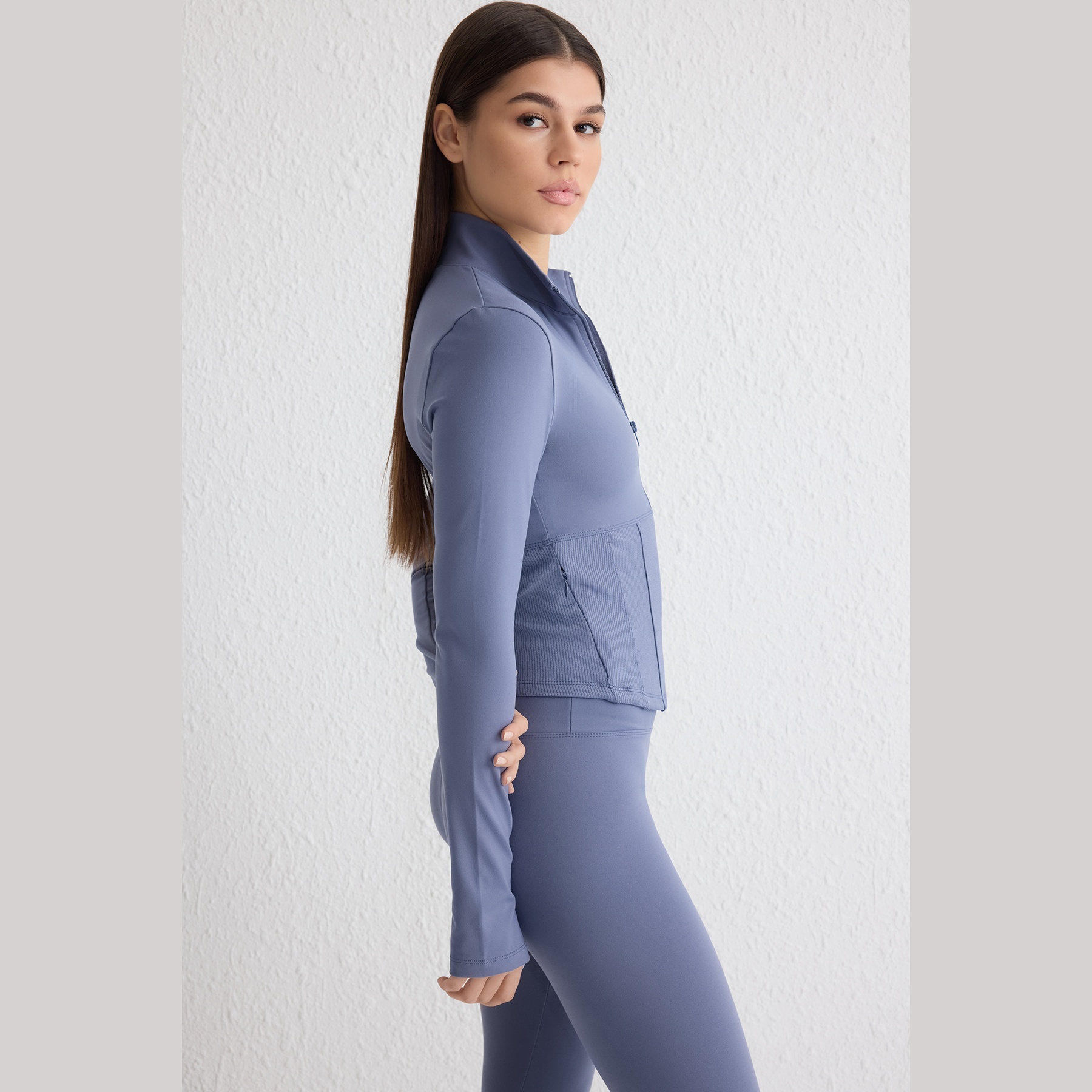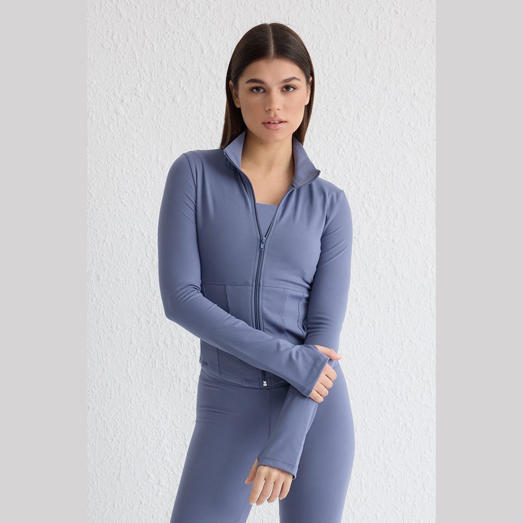 جاكيت رياضي نسائي – نيلي من خامة ناعمة بفتحة للإبهام (راحة وأناقة في كل موسم)