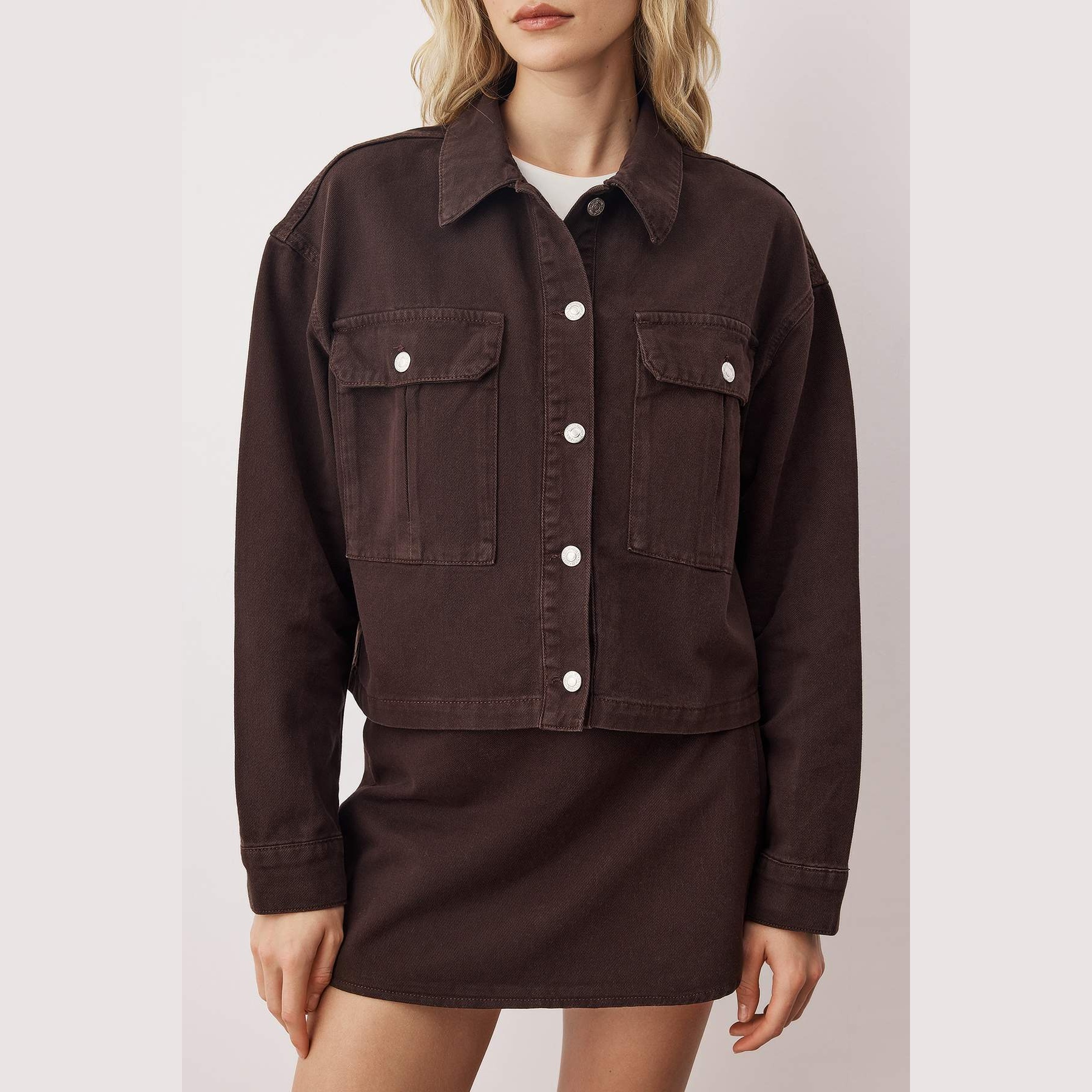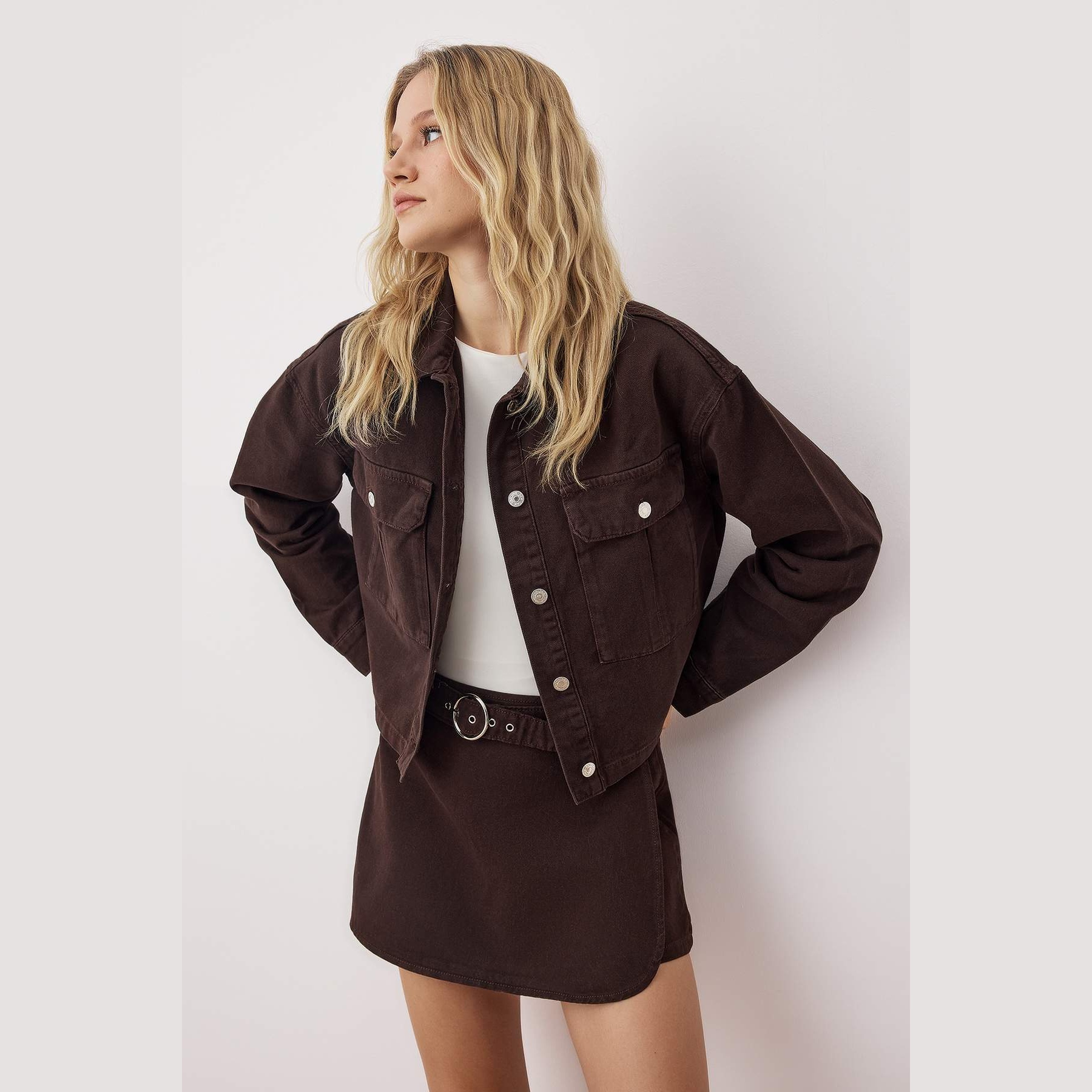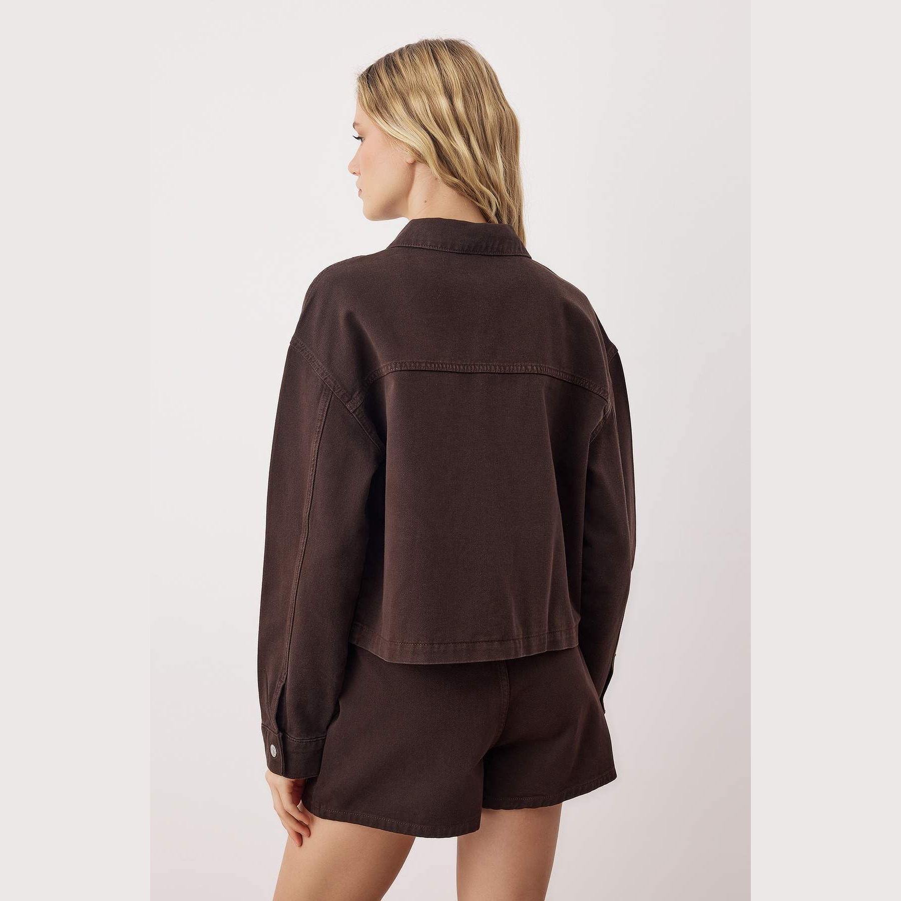 جاكيت دنيم نسائي – بني بتفاصيل جيوب وقصة منتظمة (أسلوب كلاسيكي بلمسة عصرية)
