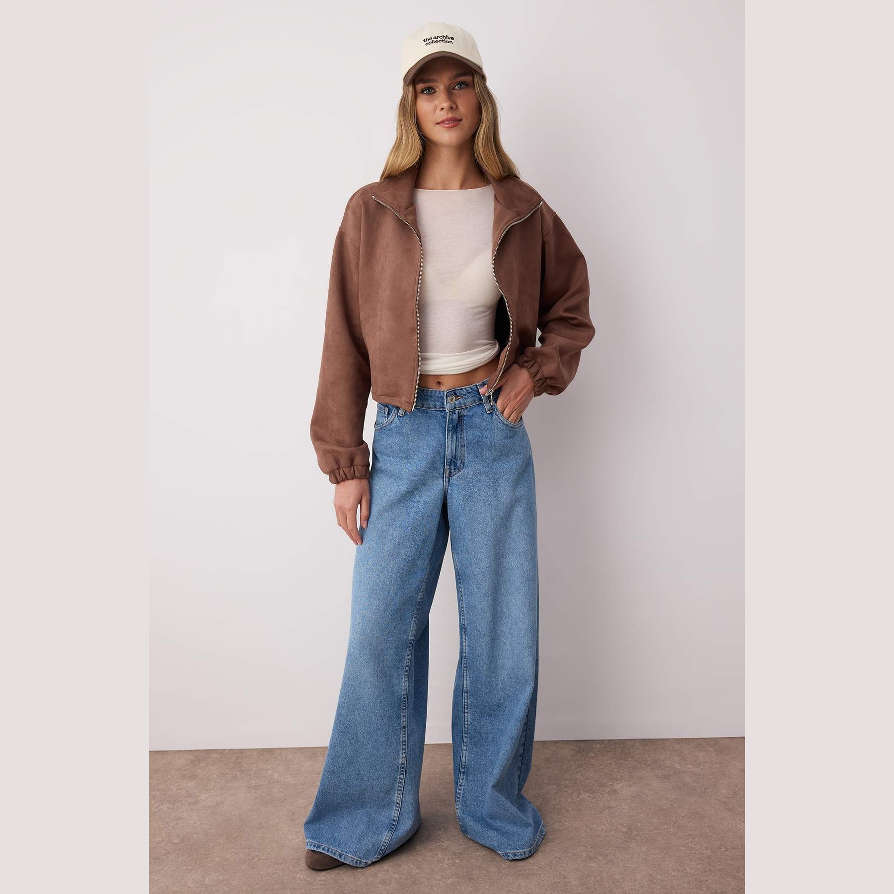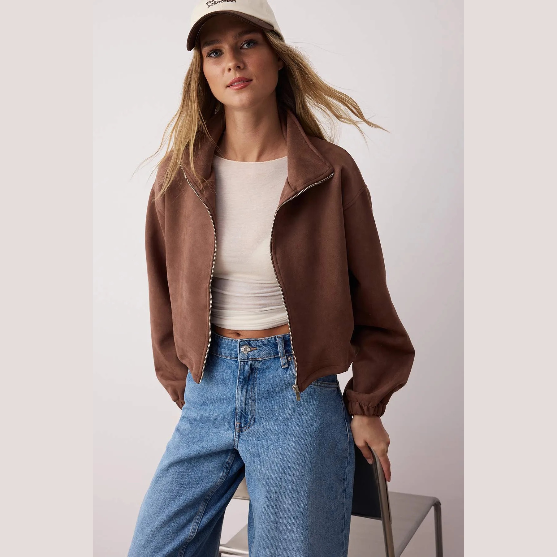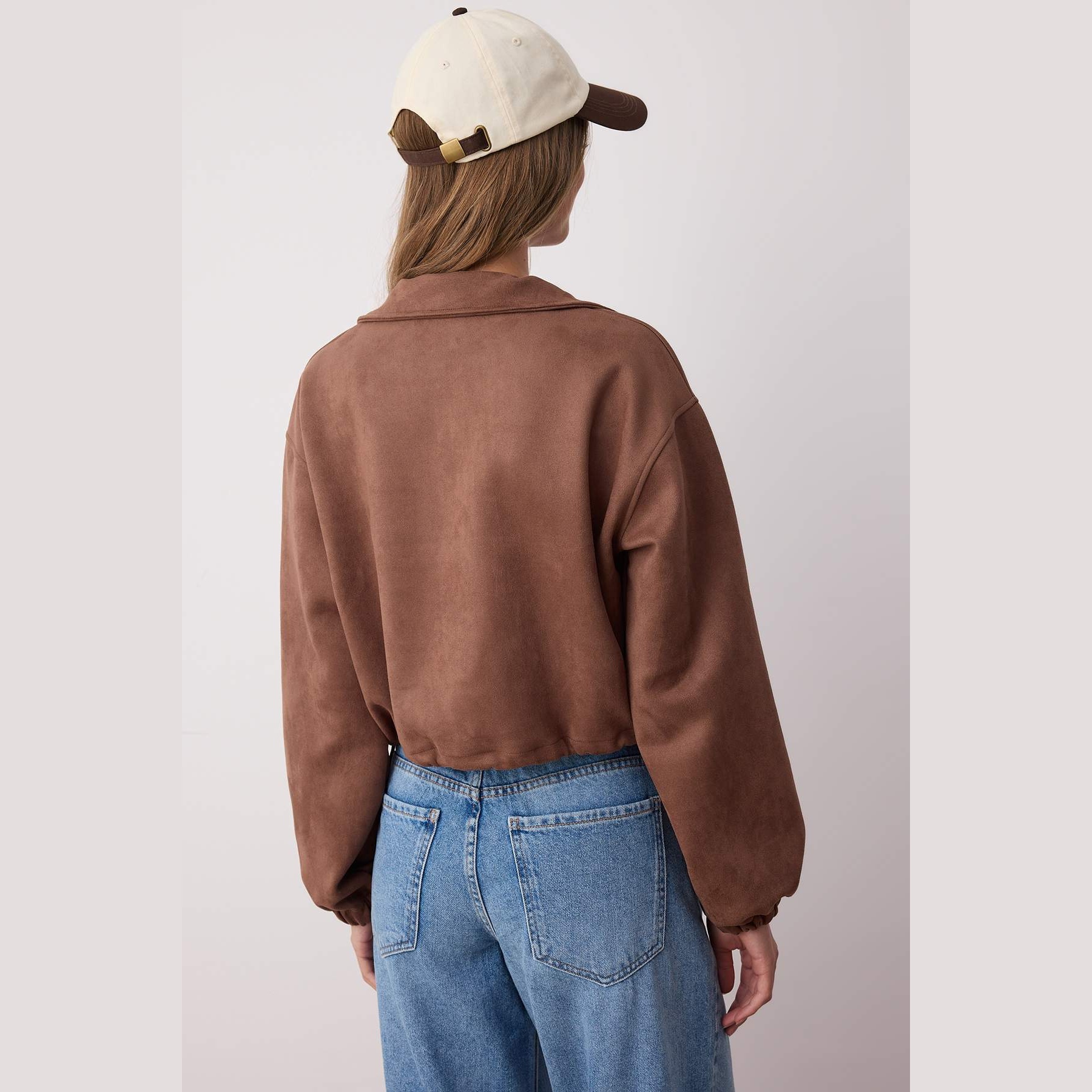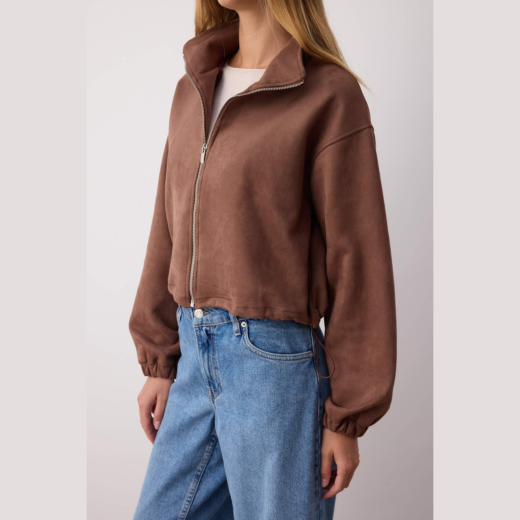 جاكيت بلون بني داكن أنيق، مصنوع من خامة سويد محاكة ناعمة الملمس، يتميز بسحاب أمامي كامل لسهولة الارتداء، وياقة عالية مغلقة تضيف لمسة عصرية. يأتي بقصة منتظمة وأكمام طويلة بكتف منخفض، ما يجعله خيارًا مثاليًا للإطلالات اليومية في الأجواء المعتدلة.