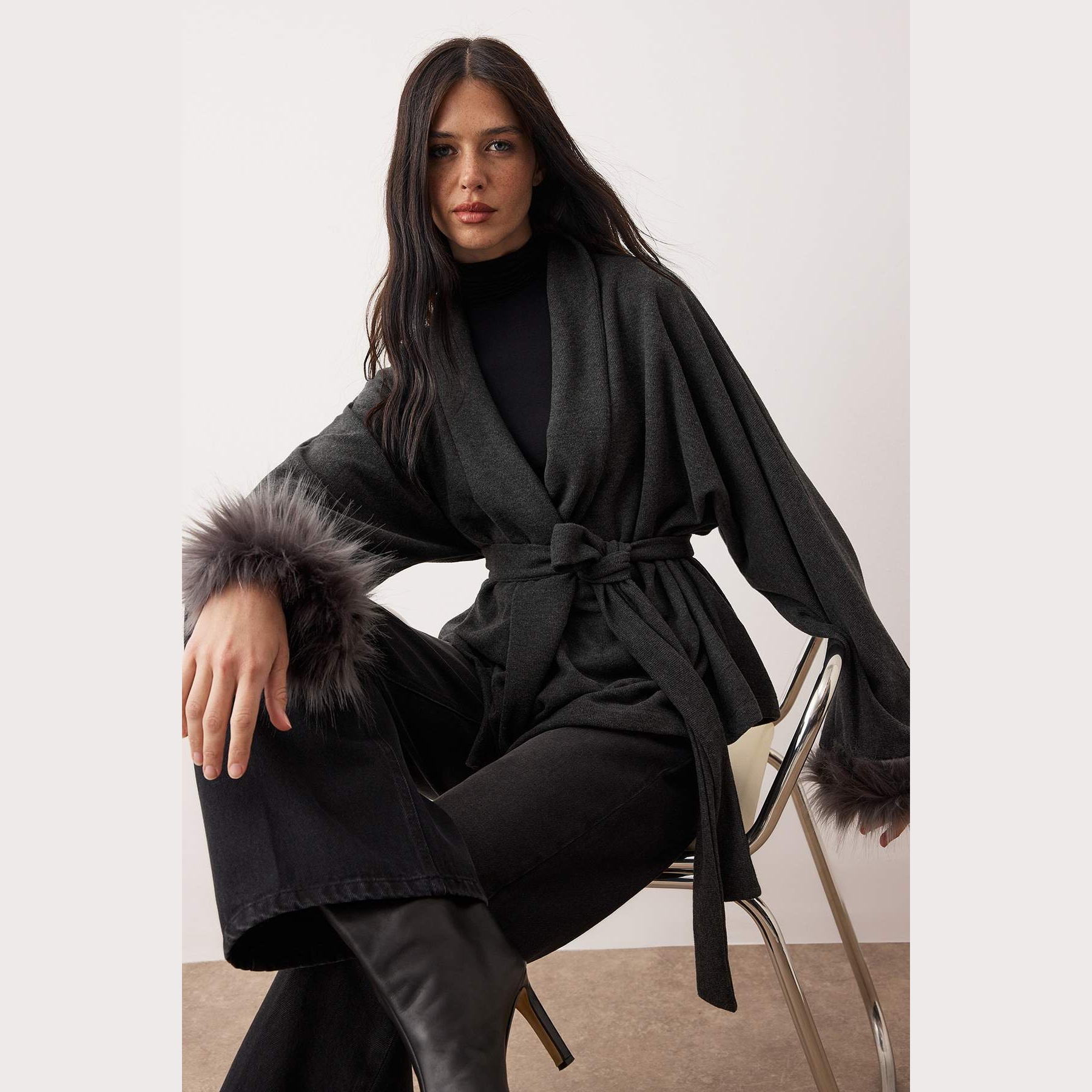 جاكيت شتوي بلون أنْتراسيت أنيق، مصنوع من خامة سيلانيك محاكة مرنة تمنحك راحة ودفئًا في الأيام الباردة. يتميز بتفاصيل فرو ناعمة تضيف لمسة فاخرة، مع قصة واسعة (Oversize) وأكمام طويلة، وياقة شال أنيقة، ما يجعله مثاليًا للإطلالات اليومية الشتوية.