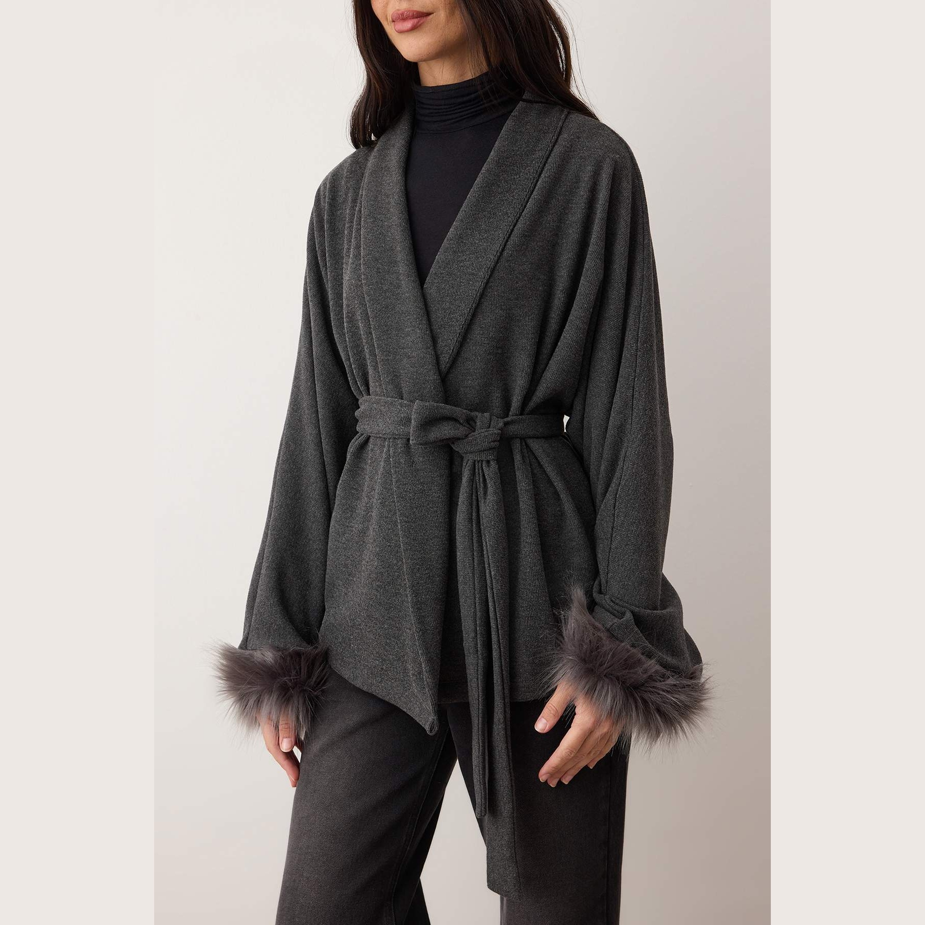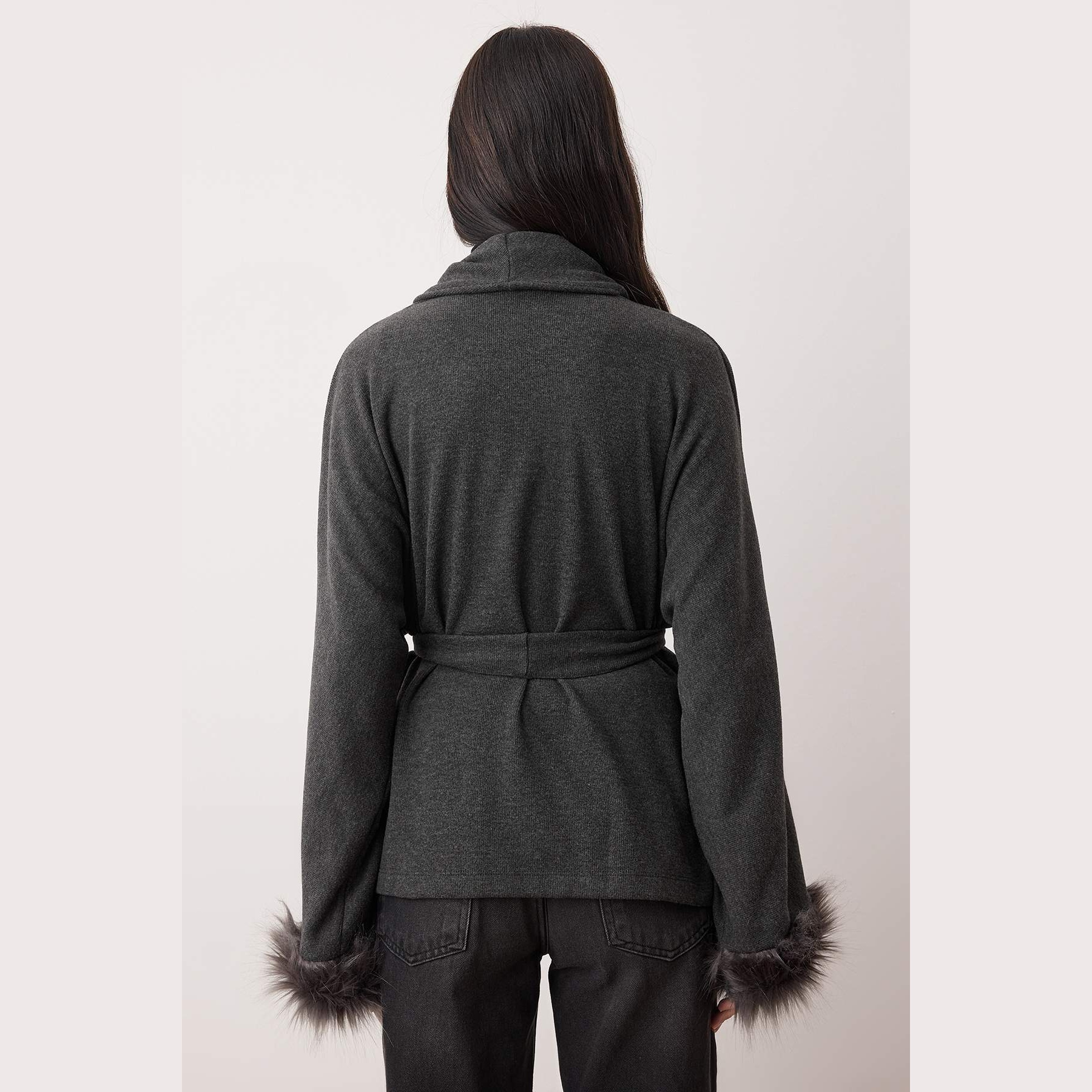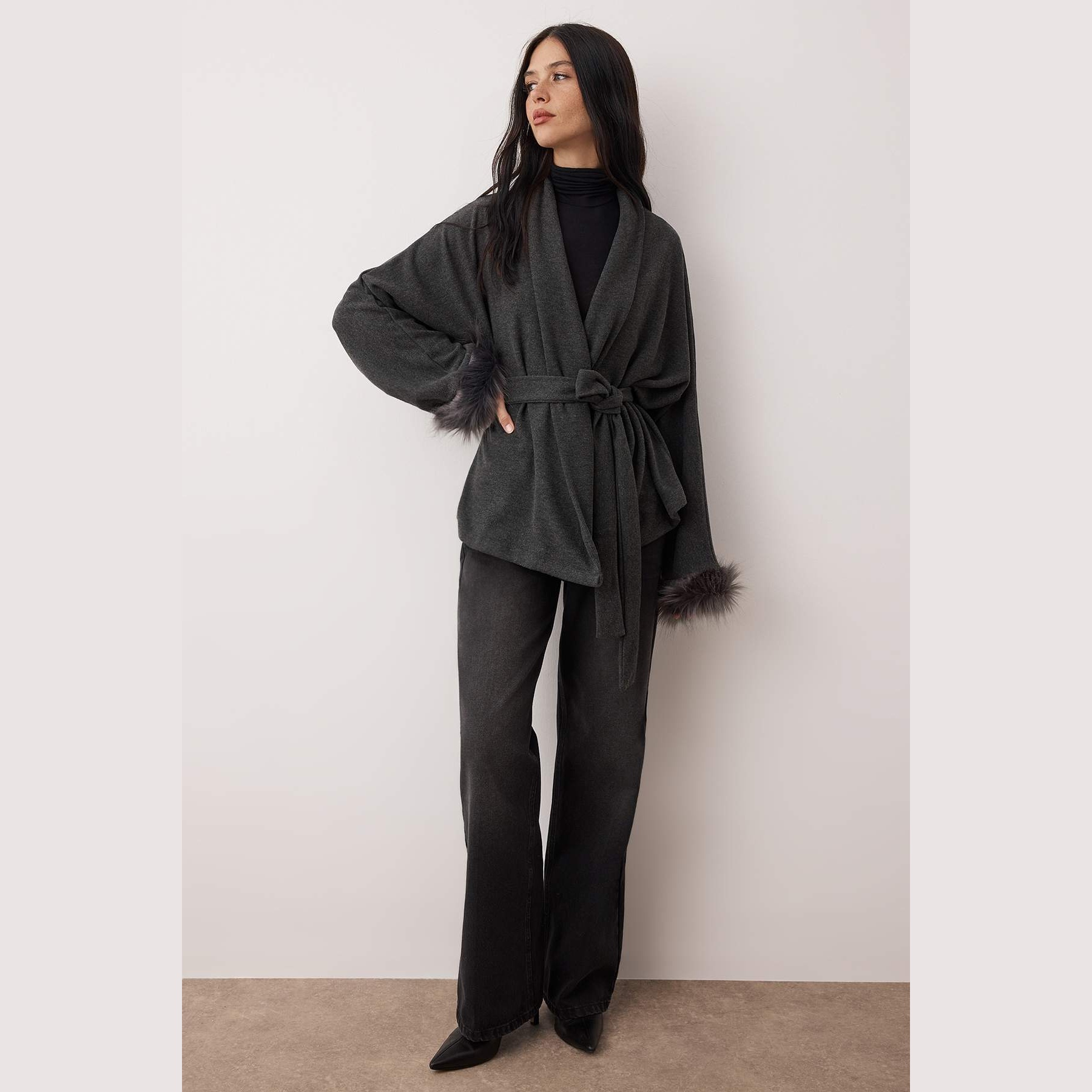 جاكيت نسائي – أنْتراسيت بتفاصيل فرو وقصة واسعة من خامة سيلانيك مرنة (دفء وأناقة في تصميم عصري)