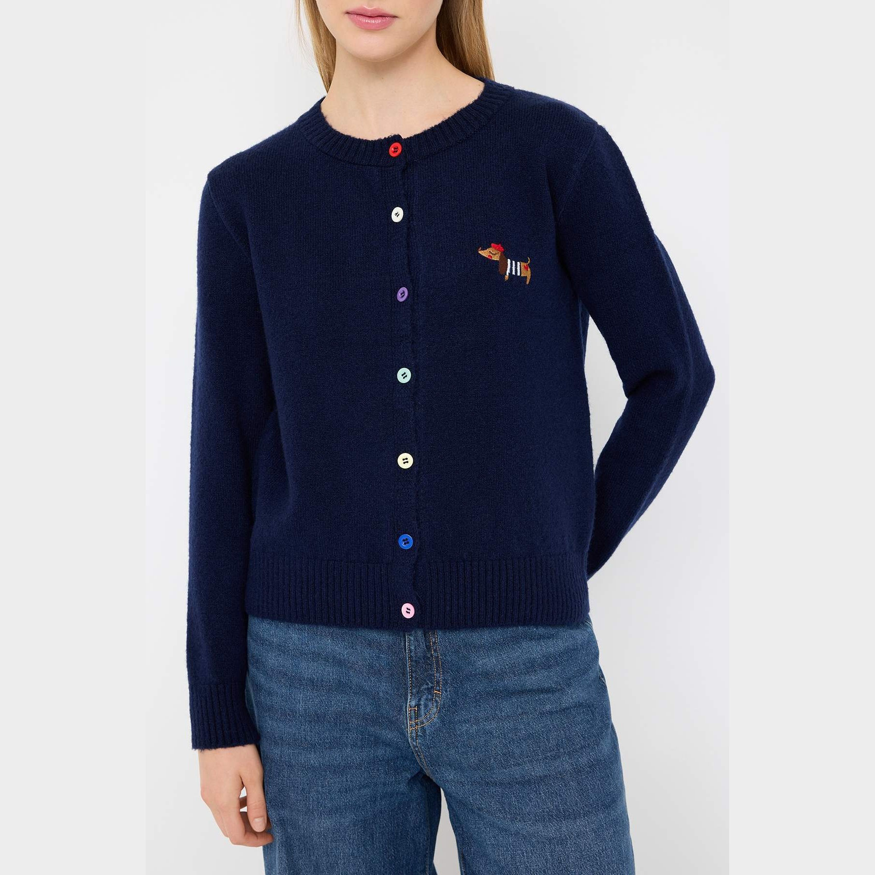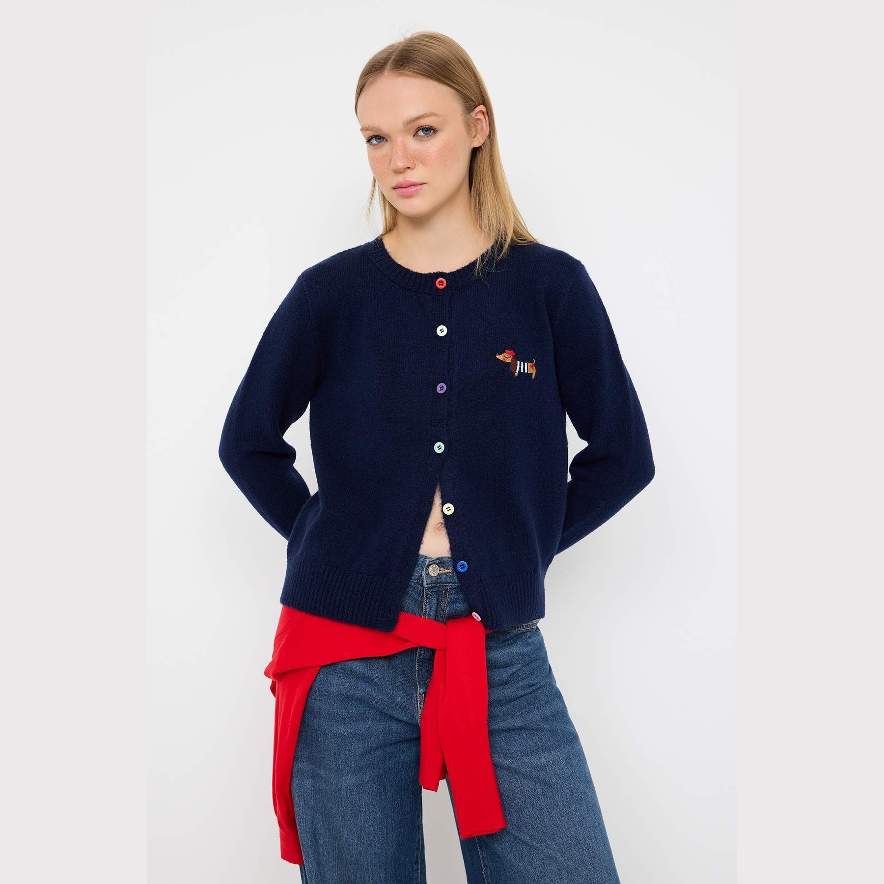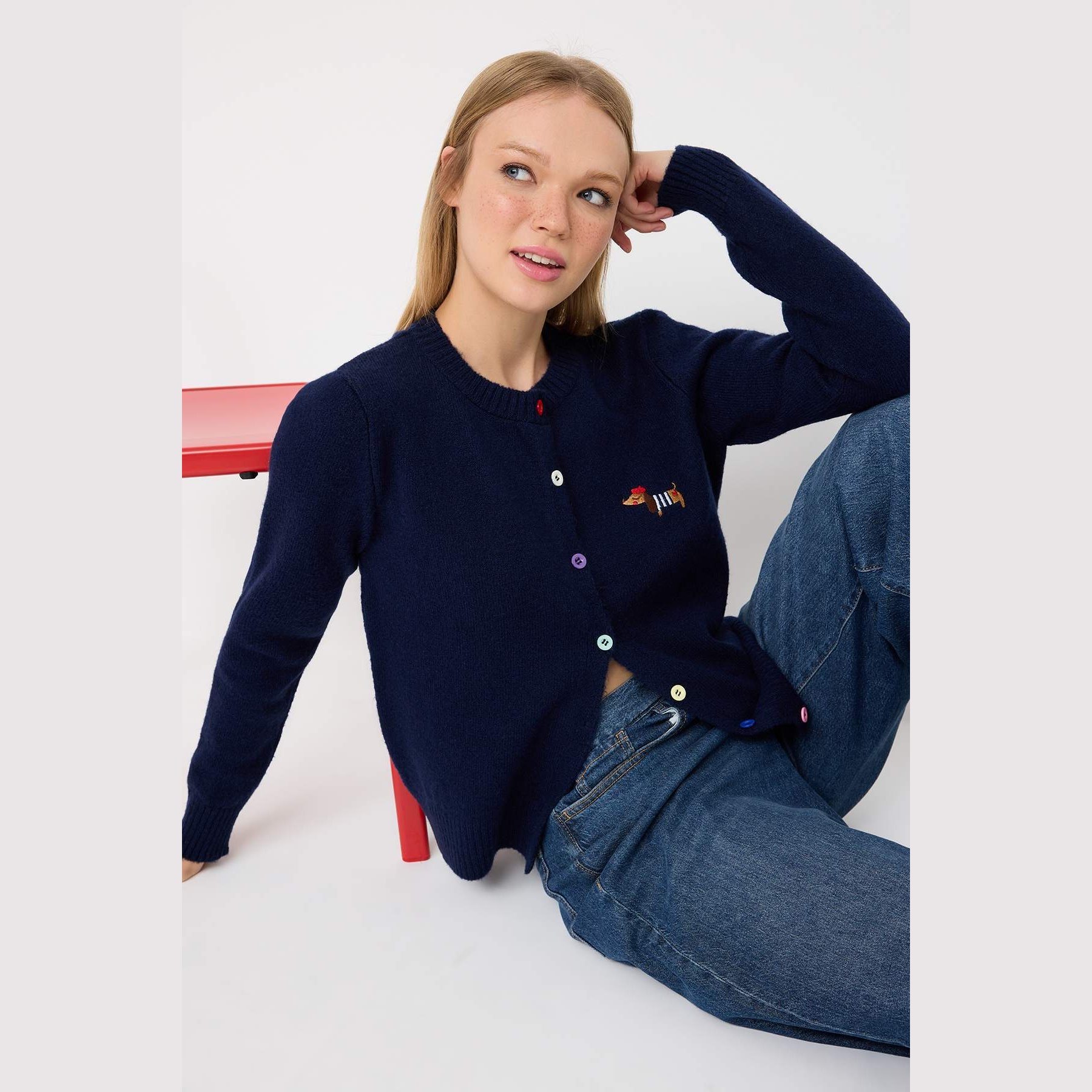 كارديغان نسائي – كحلي بملمس ناعم ونقشة كلب مطرزة (دفء لطيف بلمسة مرحة)