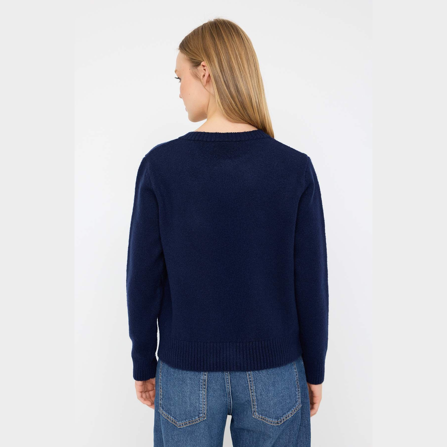 كارديغان نسائي بلون كحلي أنيق، مصنوع من خامة تريكو محاكة بتركيبة مزدوجة من الأكريليك والبوليستر، يتميز بملمس ناعم ونقشة كلب مطرزة تضيف لمسة مرحة. يأتي بقصة منتظمة (Regular) وياقة دائرية (Bisiklet Yaka) وأكمام طويلة، ما يجعله مثاليًا للإطلالات اليومية في فصل الشتاء.