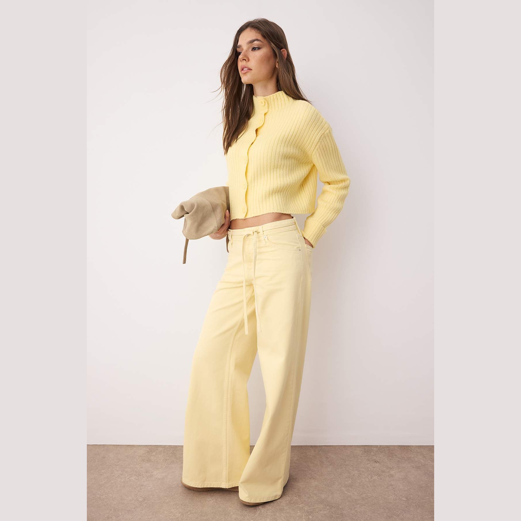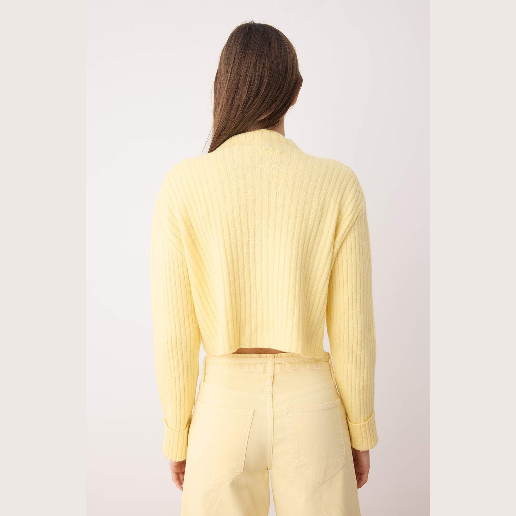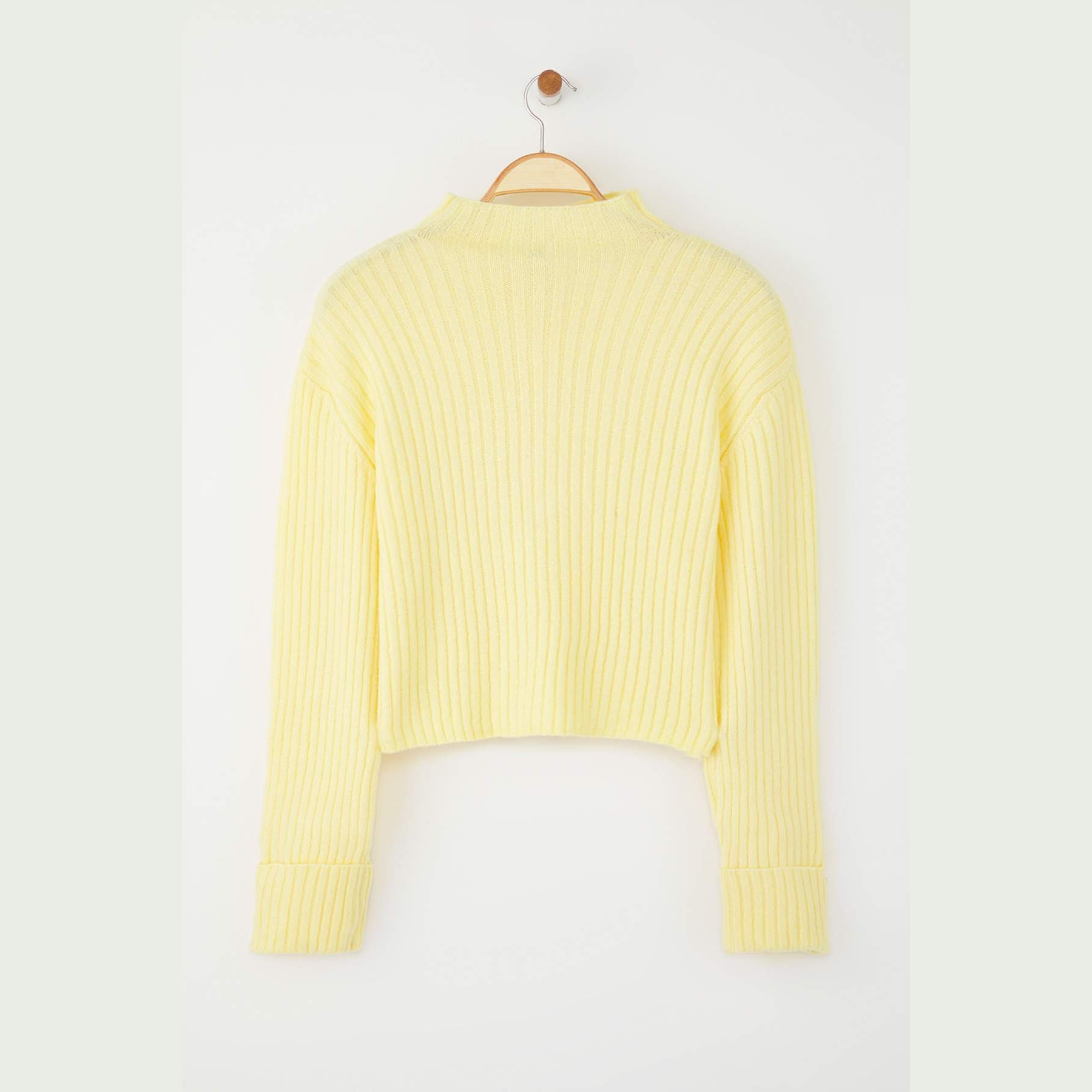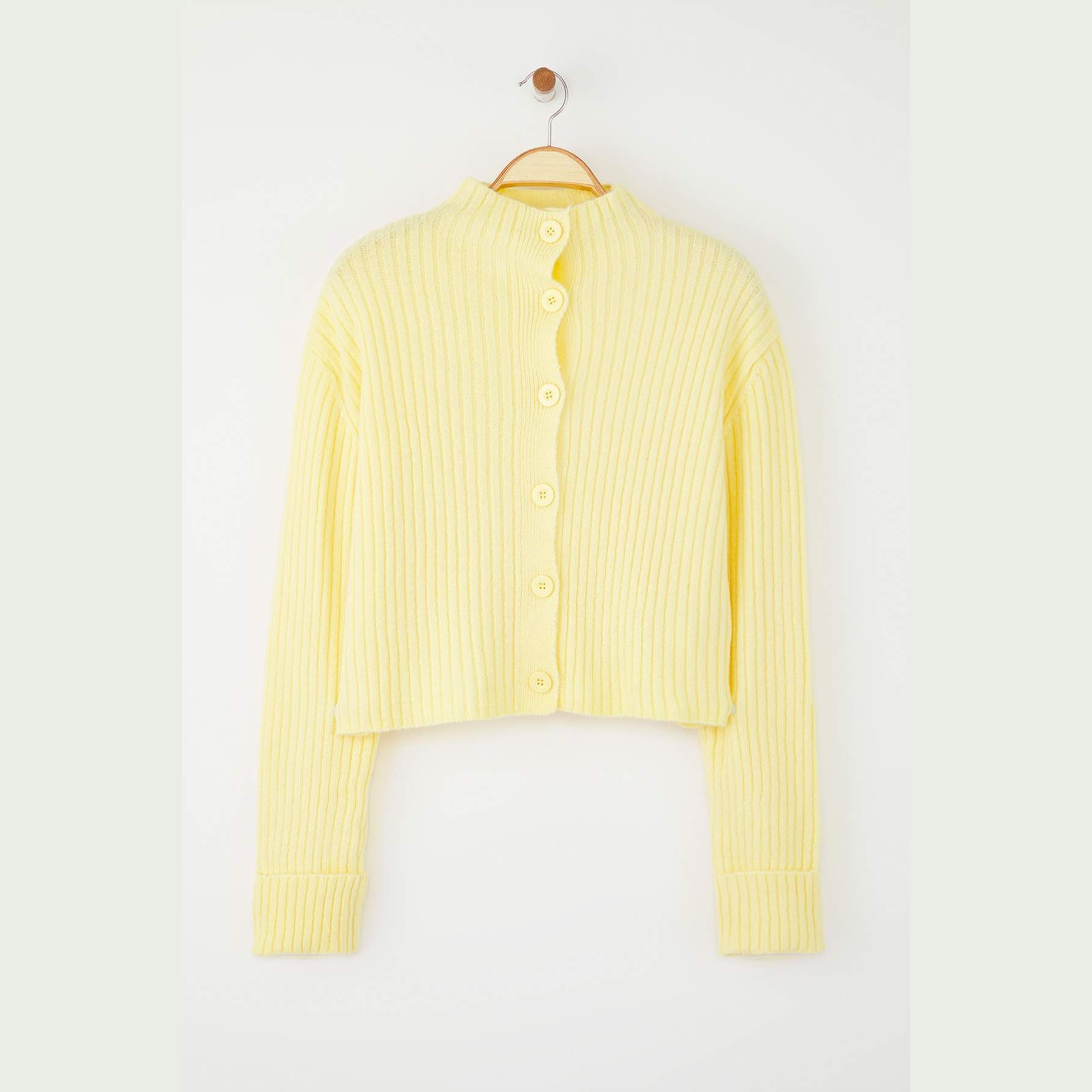 كارديغان نسائي بلون أصفر ليموني ناعم، مصنوع من خامة تريكو محاكة بتركيبة مزدوجة من الأكريليك والبوليستر، يمنح ملمسًا مريحًا ودفئًا مثاليًا للمواسم الانتقالية. يتميز بقصة قصيرة (Crop) وياقة عالية (Dik Yaka) وأكمام طويلة بتصميم كتف منخفض، ما يجعله خيارًا عصريًا للإطلالات اليومية.