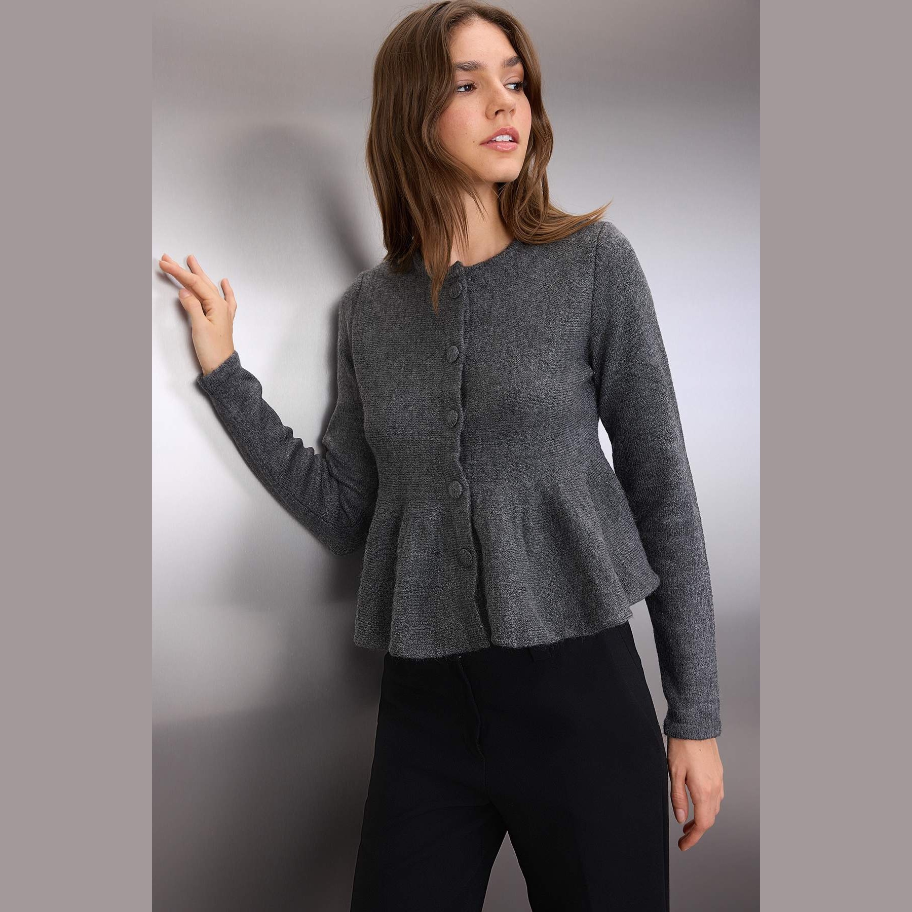 كارديغان نسائي بلون أنtrasit أنيق، مصنوع من خامة تريكو محاكة بتركيبة مزدوجة من الأكريليك والبوليستر، يتميز بملمس متوسط السماكة وقصة أنثوية ناعمة. يأتي بياقة دائرية (Bisiklet Yaka) وأكمام طويلة، مع حافة سفلية بكسرات (Volanlı) تضيف حركة وانسيابية ناعمة للمظهر.