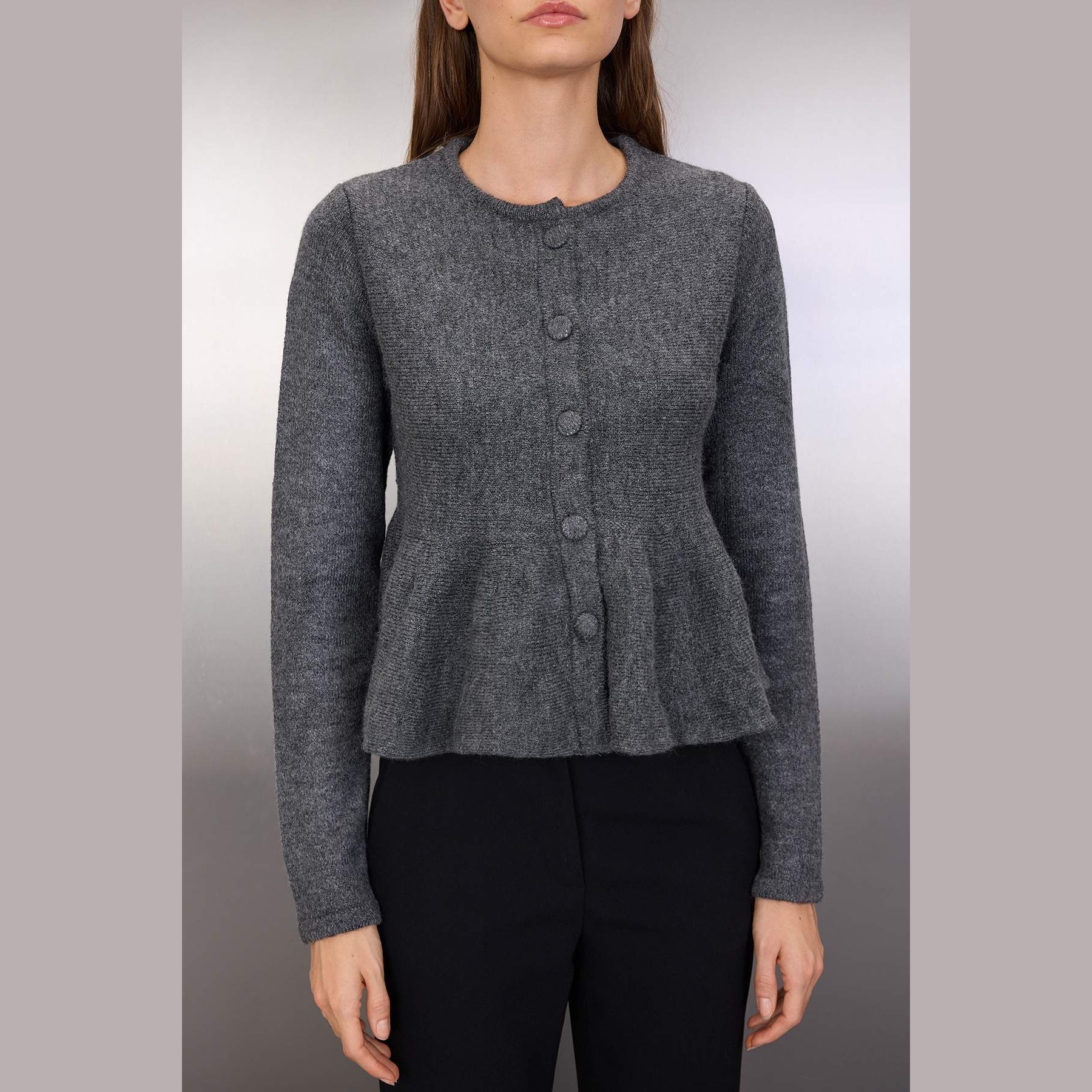 كارديغان نسائي – أنtrasit بياقة دائرية وحافة سفلية بكسرات (أنوثة ناعمة بلمسة شتوية)