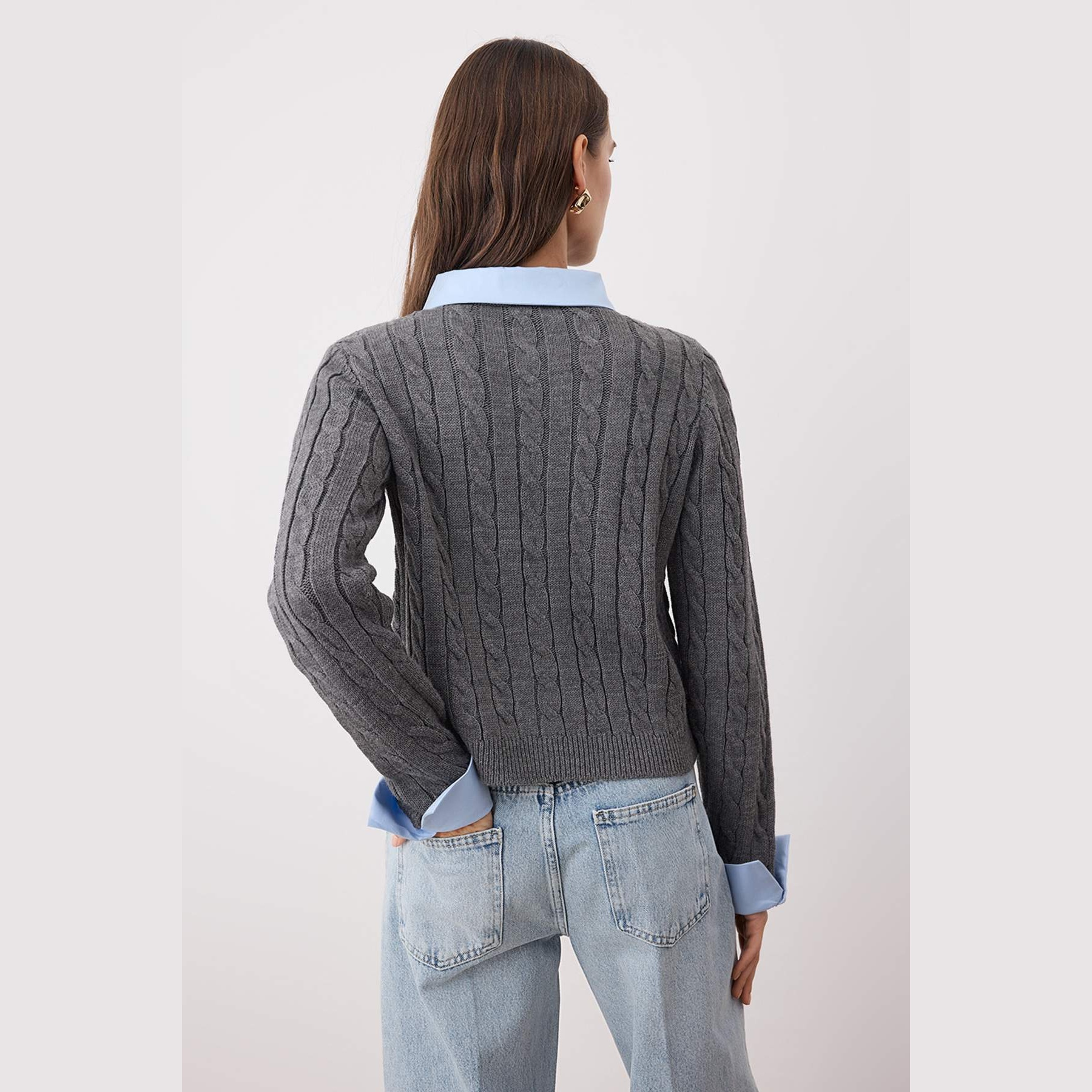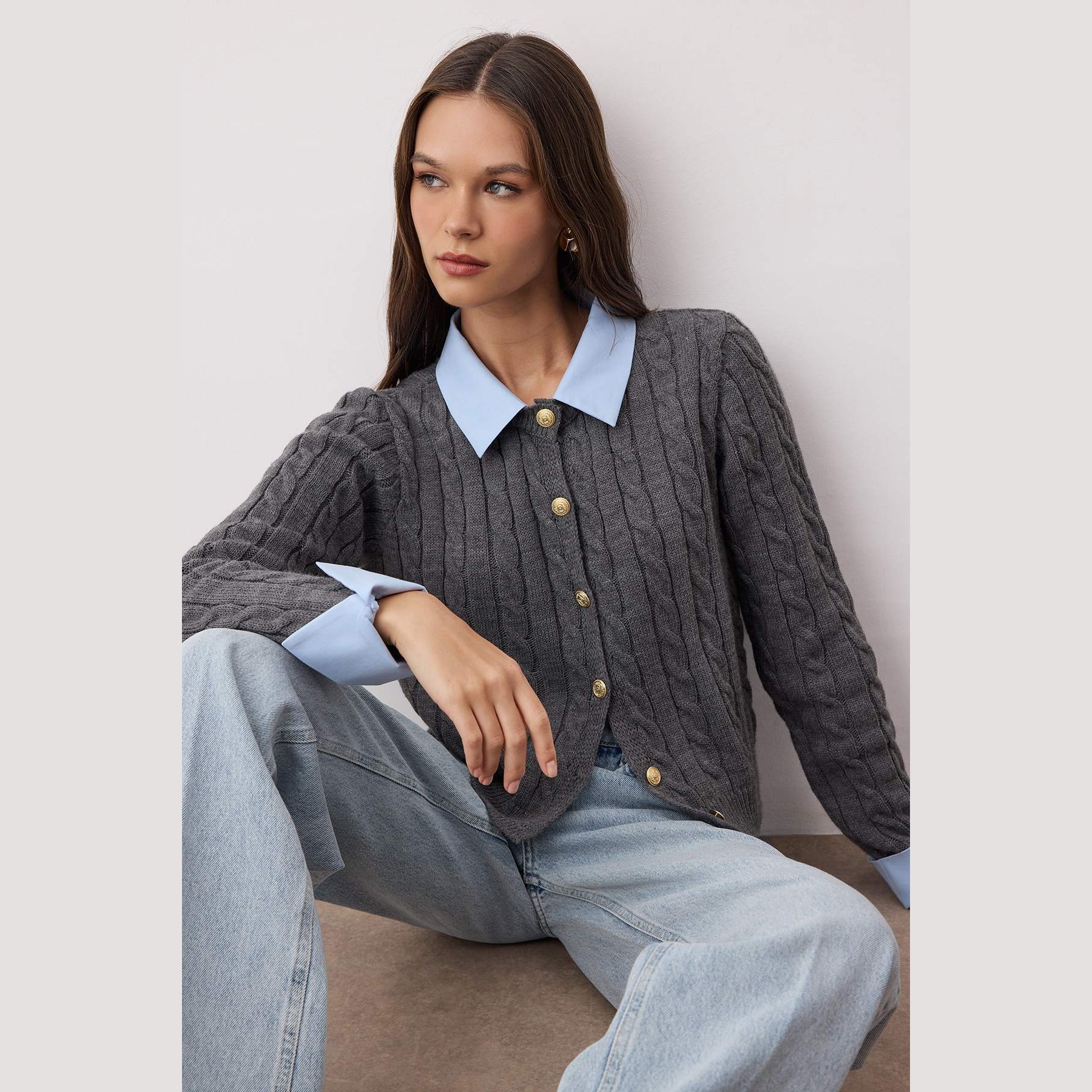 كارديغان نسائي بلون أنtrasit أنيق، مصنوع من خامة تريكو محاكة بالكامل من الأكريليك، يتميز بنقشة ضفائر مزدوجة تضيف عمقًا بصريًا وملمسًا دافئًا. يأتي بقصة منتظمة (Regular) وياقة دائرية (Bisiklet Yaka) وأكمام طويلة، ما يجعله خيارًا مثاليًا للإطلالات اليومية في فصل الشتاء.