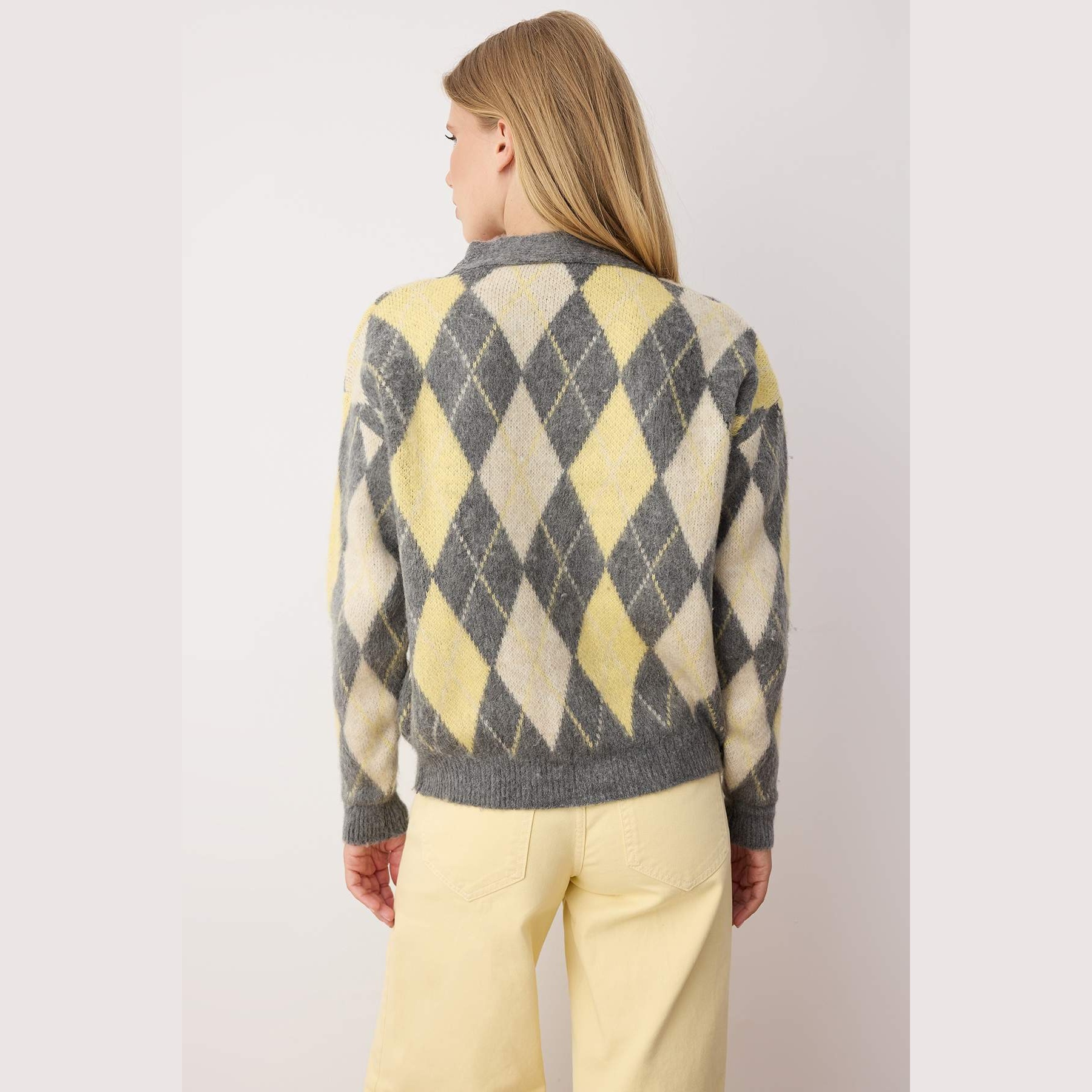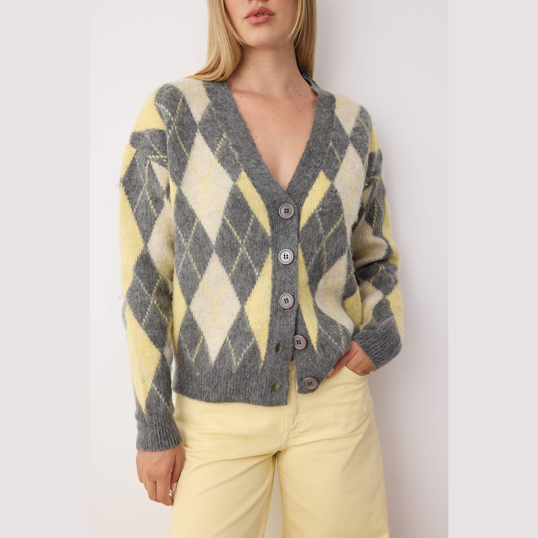 كارديغان نسائي بلون أنtrasit أنيق، مصنوع من خامة تريكو محاكة بتركيبة مزدوجة من الأكريليك والبوليستر، يتميز بملمس ناعم ونقشة إكوزيه (Baklava/Ekose) تضيف طابعًا كلاسيكيًا. يأتي بقصة منتظمة (Regular) وياقة V وأكمام طويلة بتصميم كتف منخفض، ما يجعله خيارًا مثاليًا للإطلالات اليومية في فصل الشتاء.