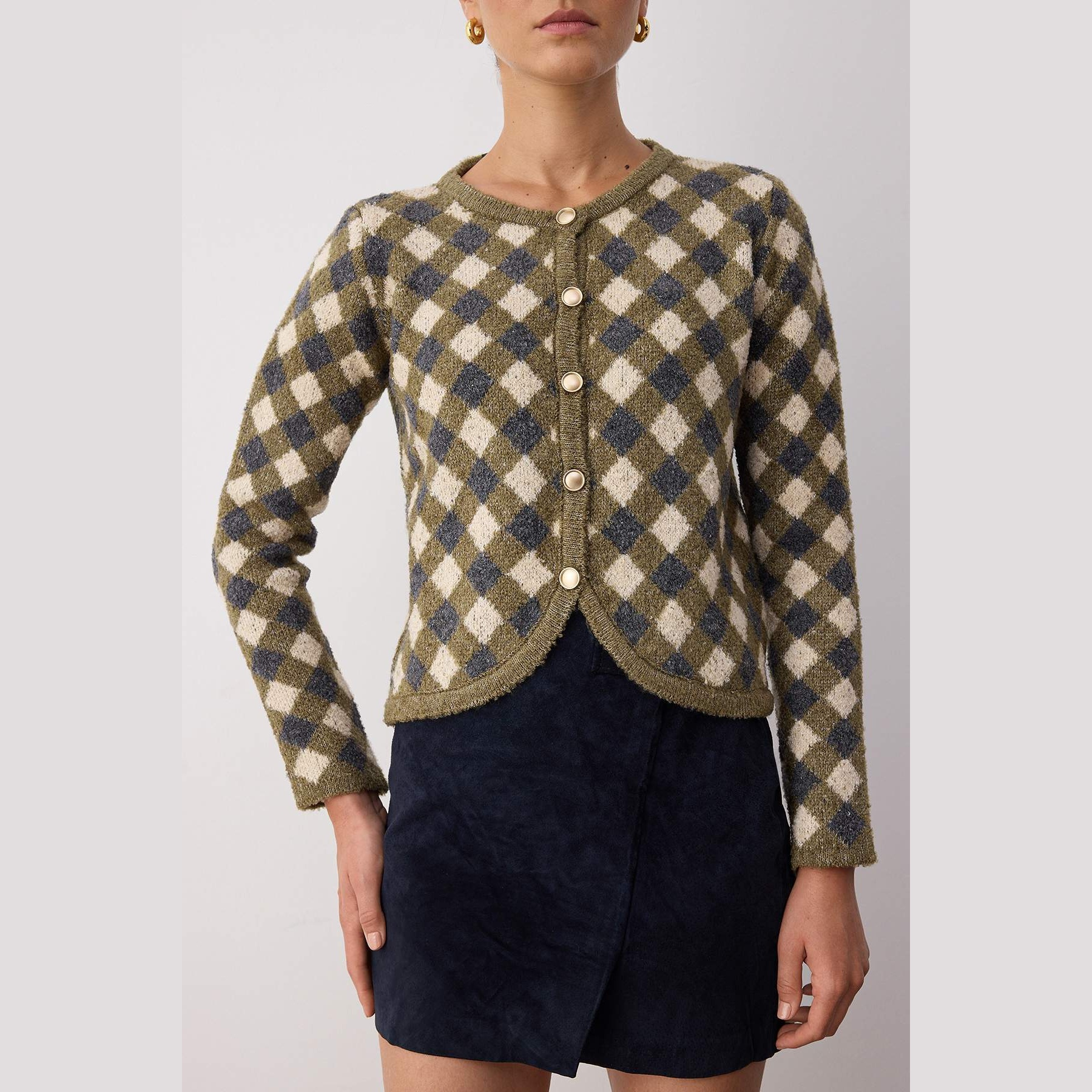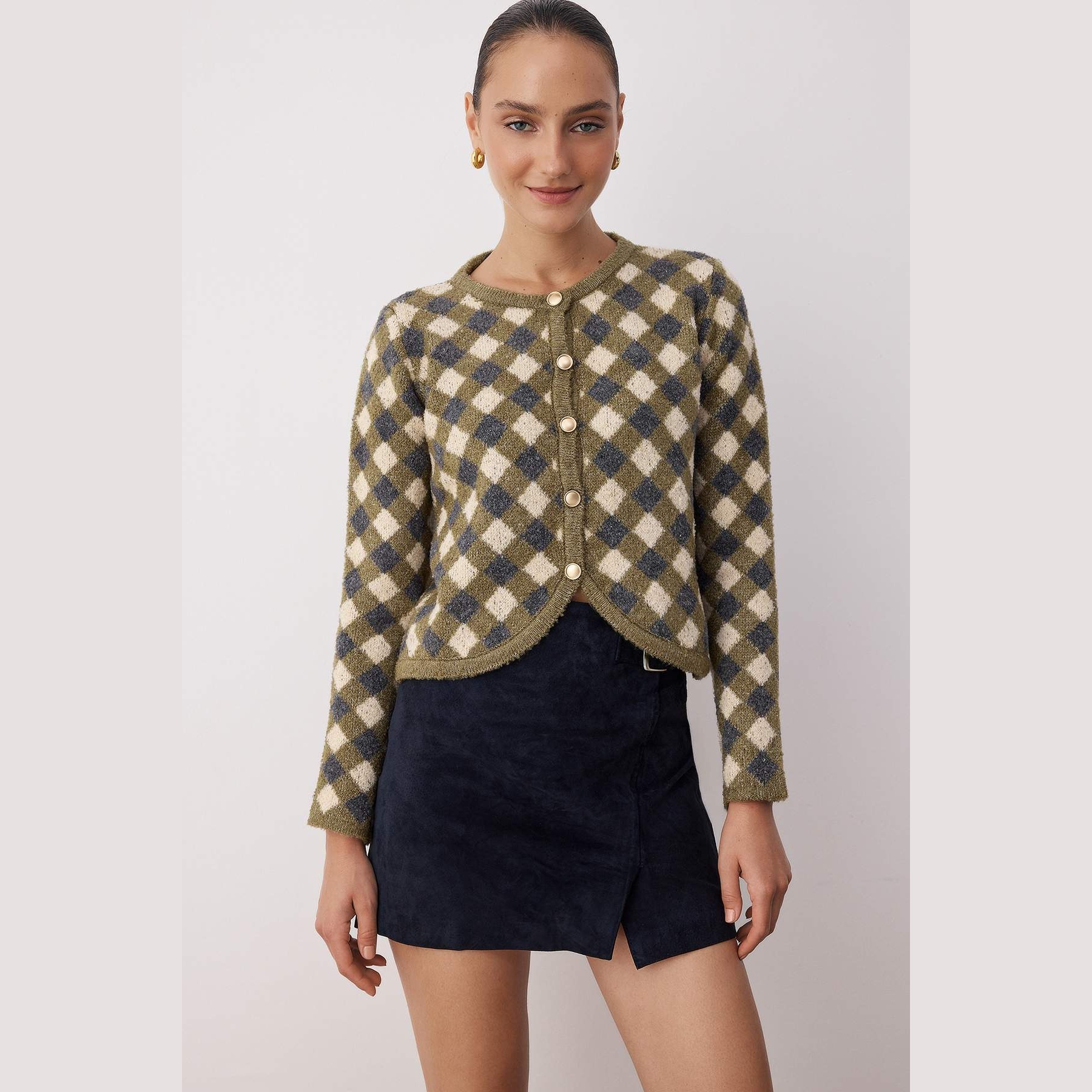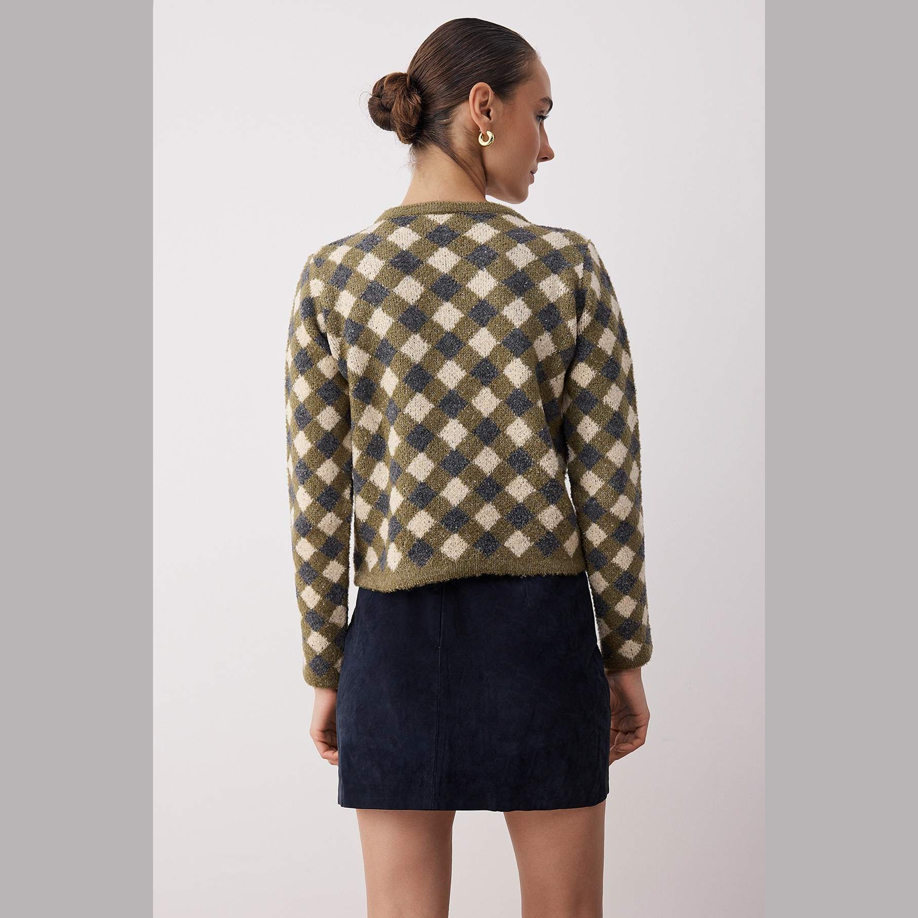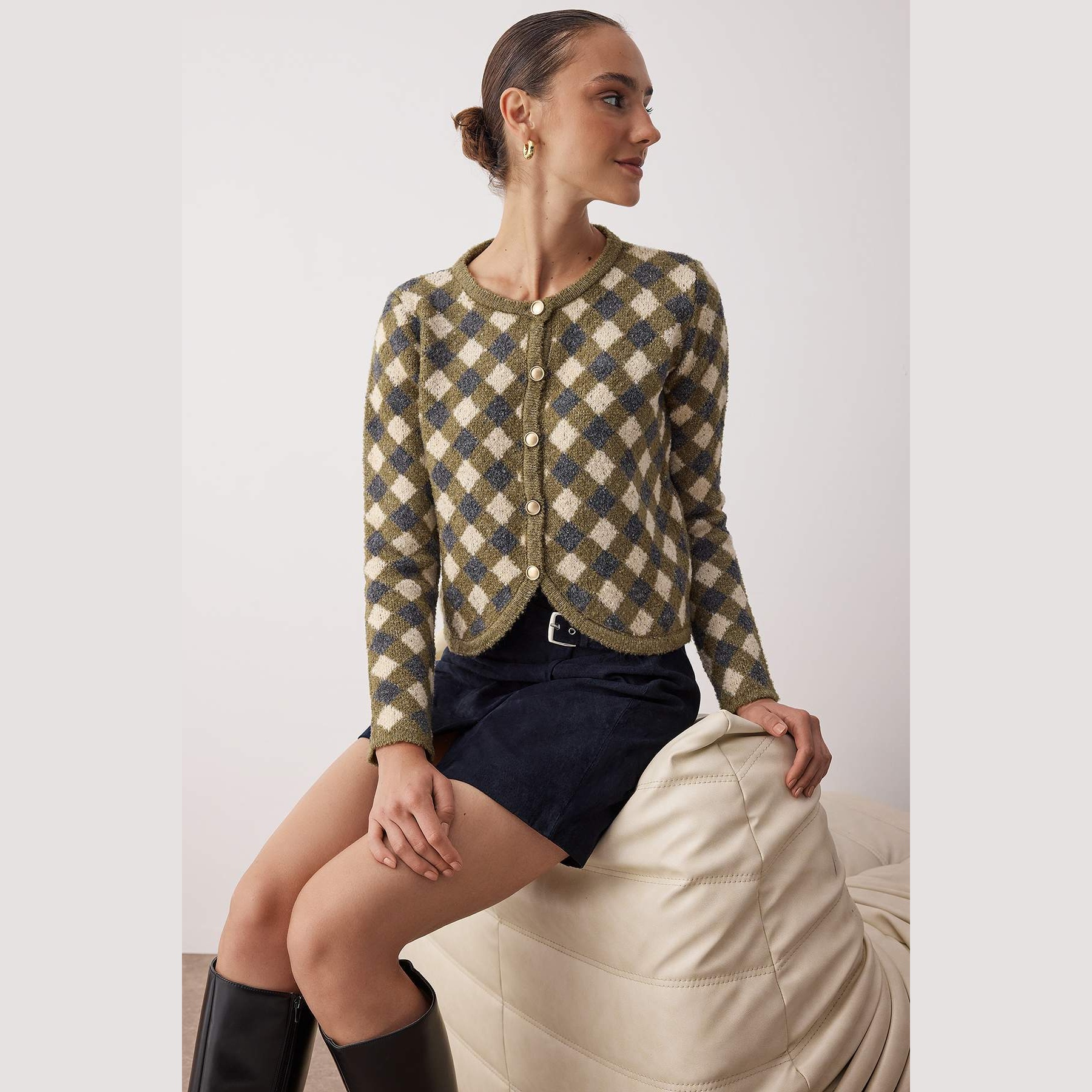 كارديغان نسائي – زيتي بنقشة إكوزيه وياقة دائرية وقصة قصيرة (دفء عصري بلمسة كلاسيكية)