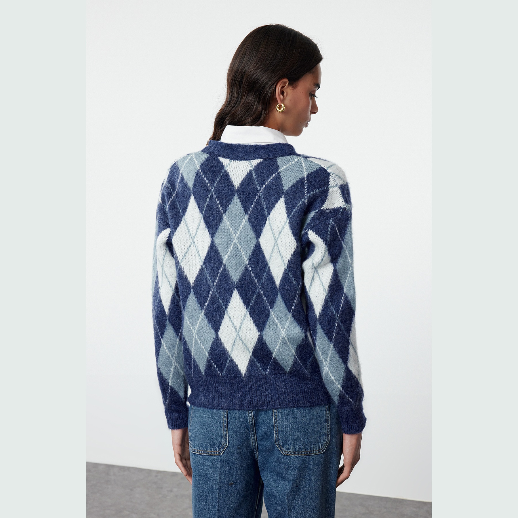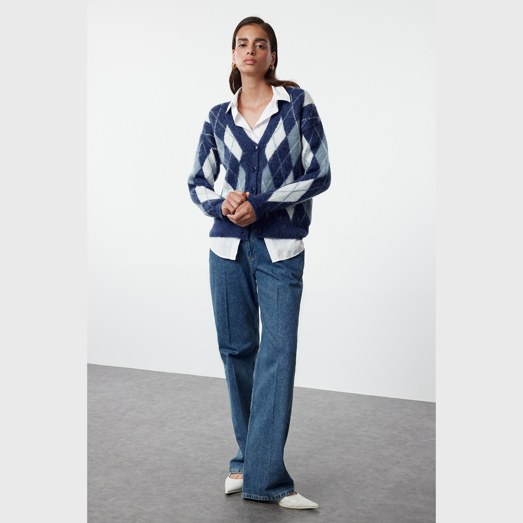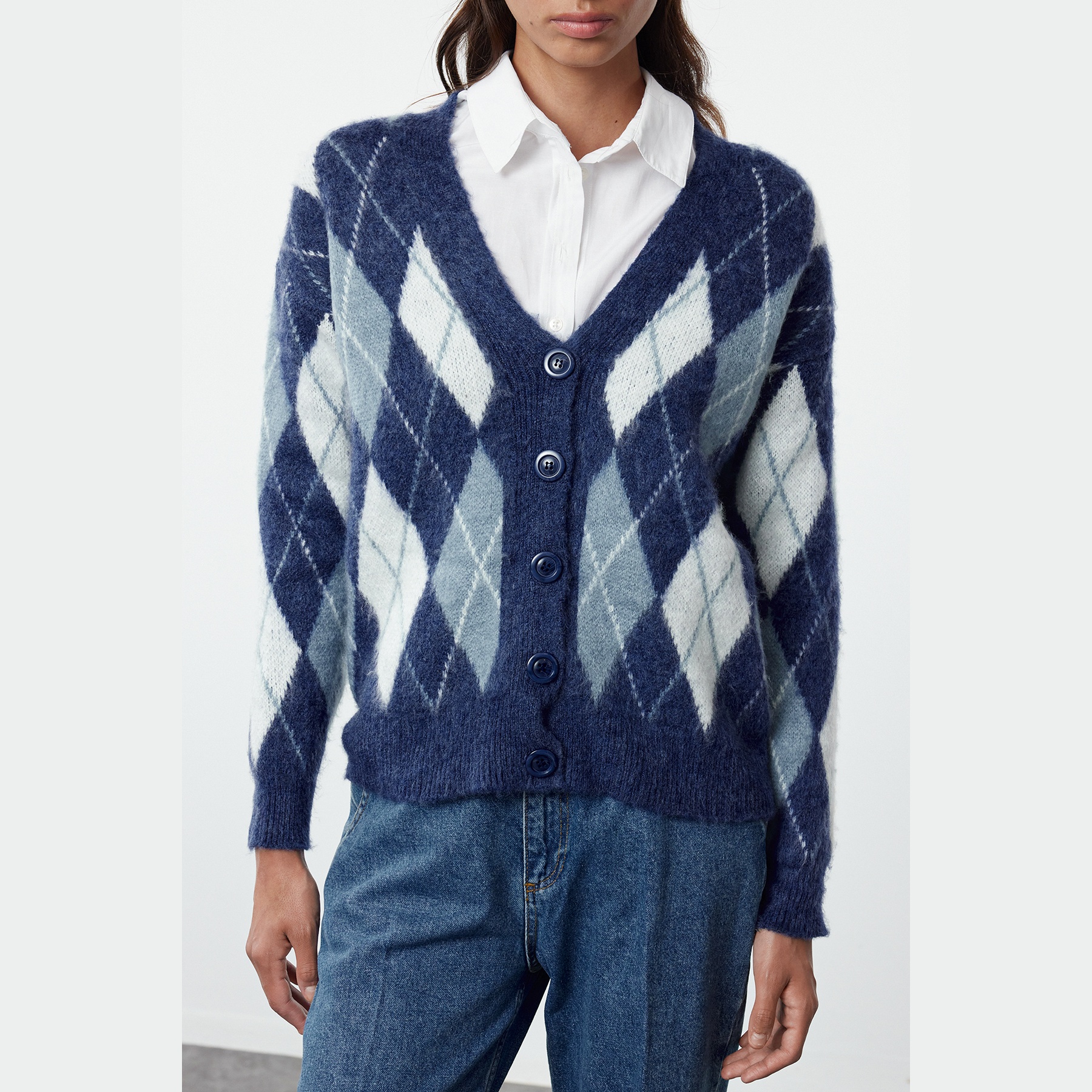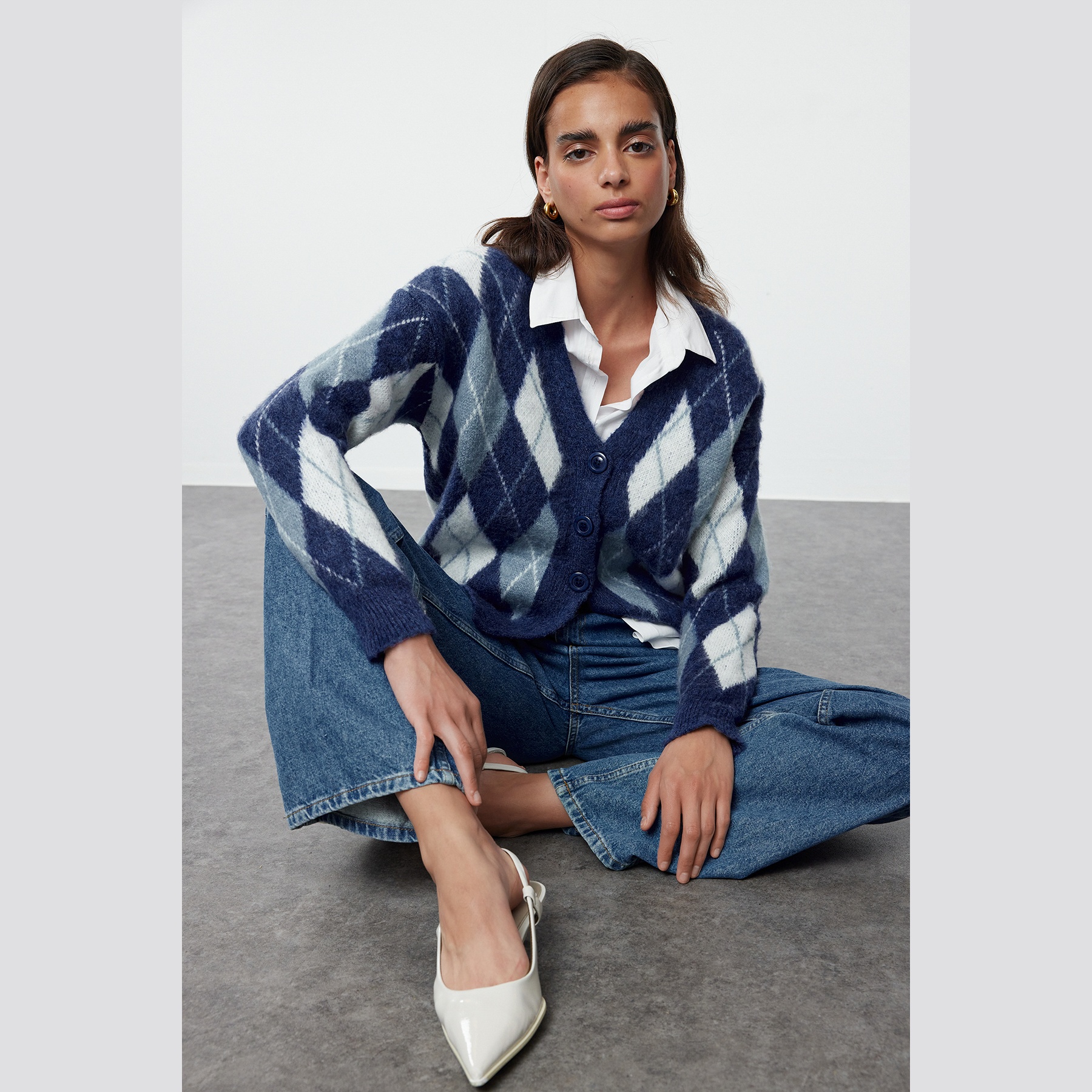 كارديغان نسائي بلون كحلي أنيق، مصنوع من خامة تريكو محاكة بتركيبة مزدوجة من الأكريليك والبوليستر، يتميز بملمس ناعم ونقشة إكوزيه (Baklava/Ekose) تضيف طابعًا كلاسيكيًا. يأتي بقصة منتظمة (Regular) وياقة V وأكمام طويلة بتصميم كتف منخفض، ما يجعله خيارًا مثاليًا للإطلالات اليومية في فصل الشتاء.
