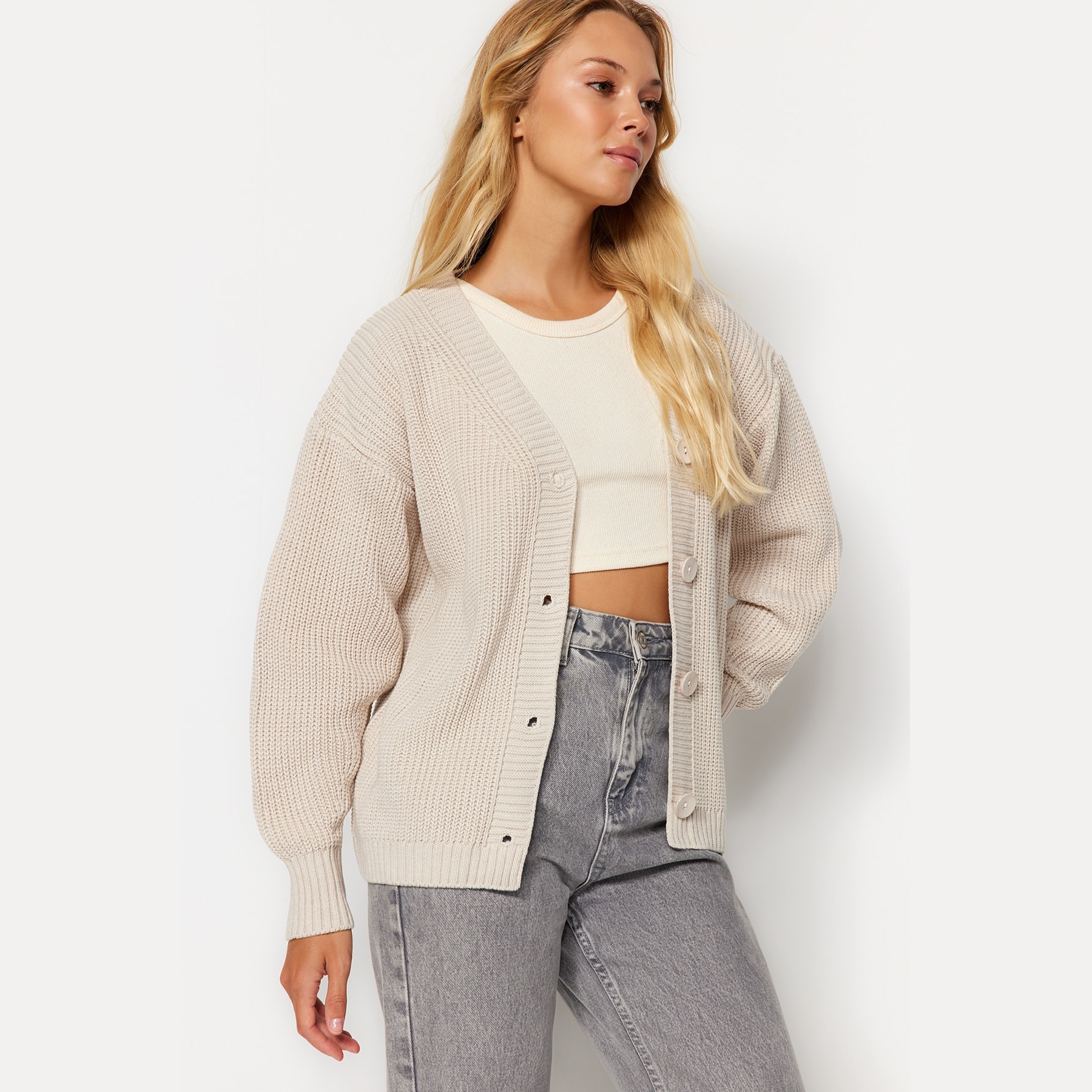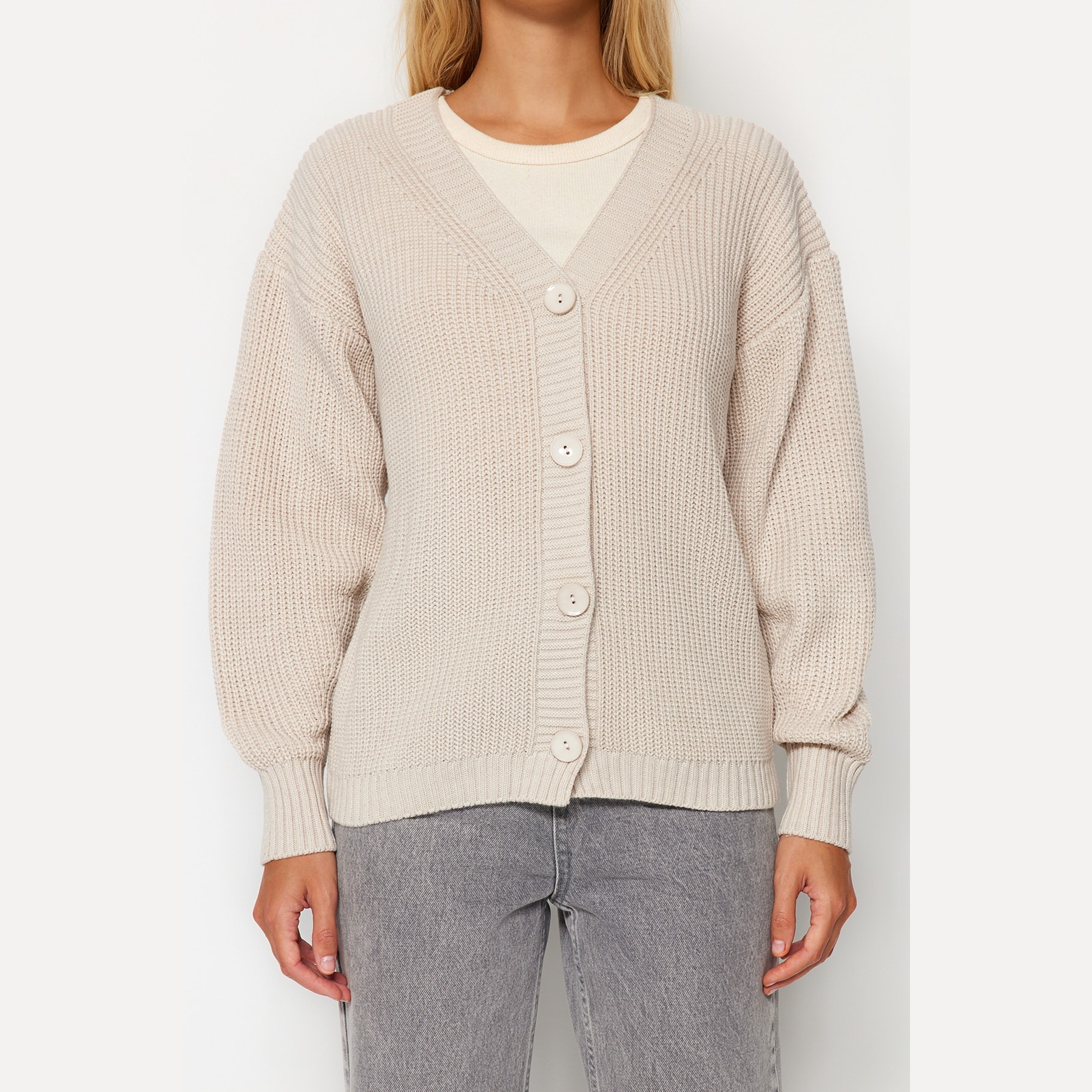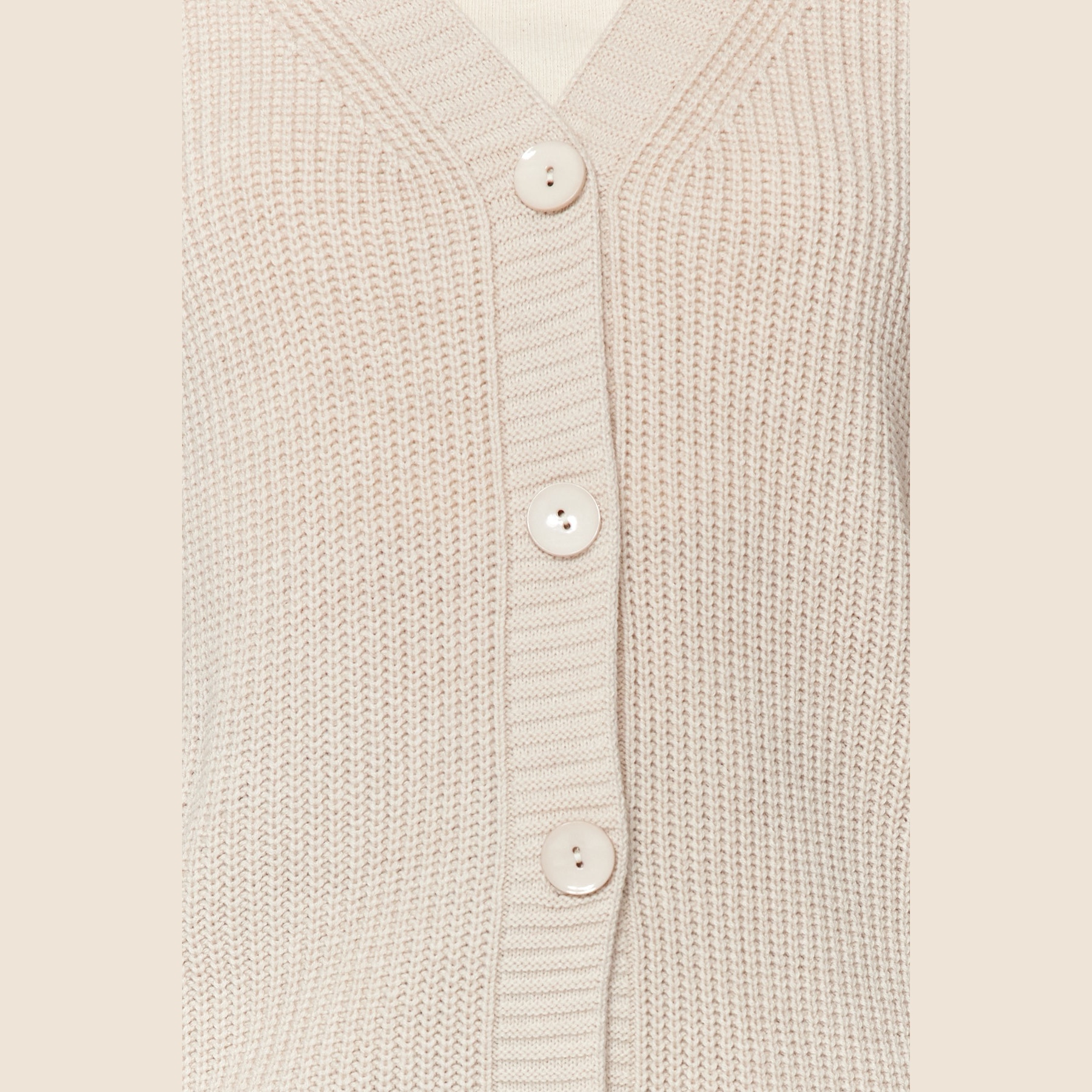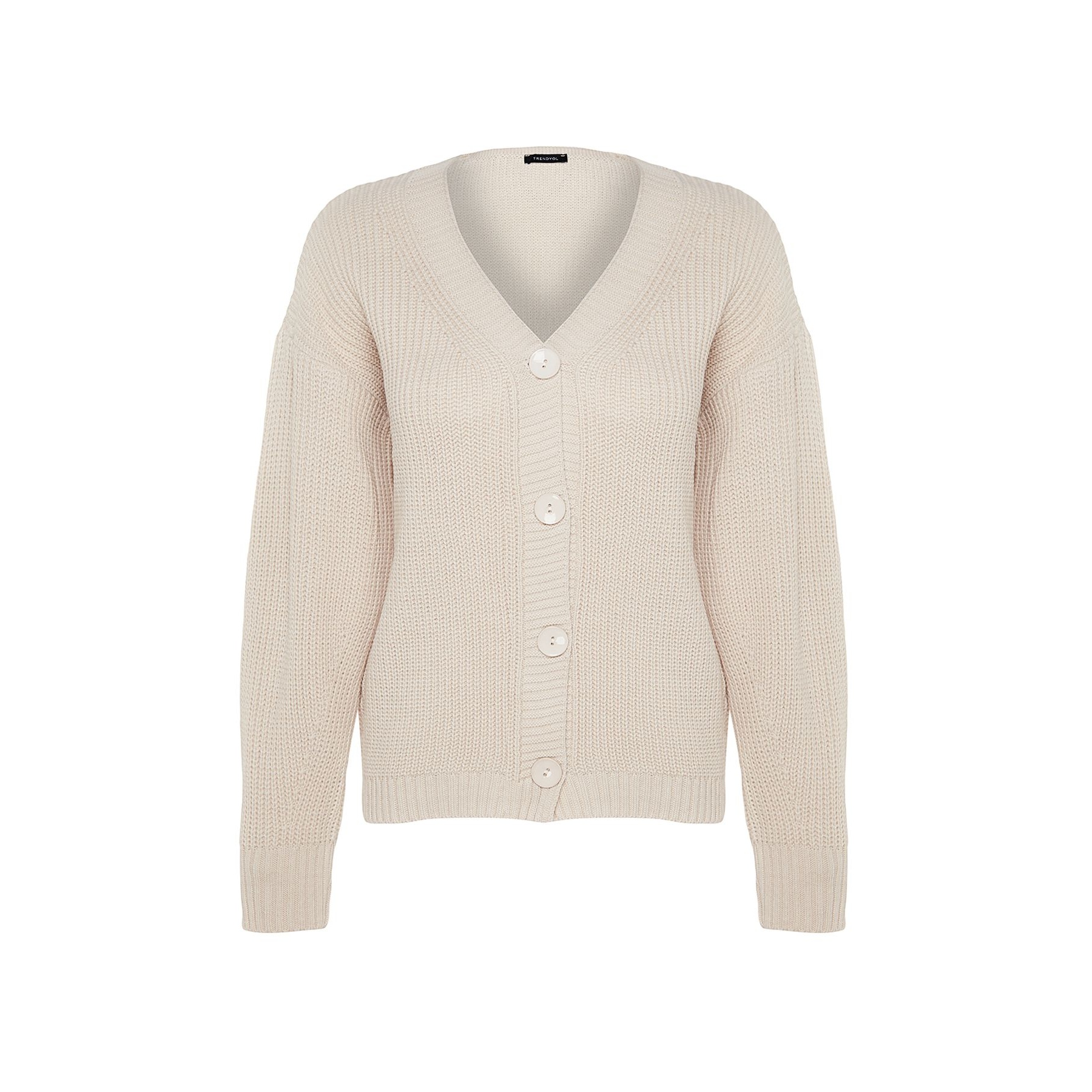 كارديغان نسائي بلون بيج هادئ، مصنوع من خامة تريكو محاكة بالكامل من الأكريليك، يتميز بملمس متوسط السماكة وتصميم أساسي سهل التنسيق. يأتي بقصة منتظمة (Regular) وياقة V وأكمام طويلة بتصميم كتف منخفض، ما يجعله خيارًا مثاليًا للإطلالات اليومية في الأجواء الباردة.