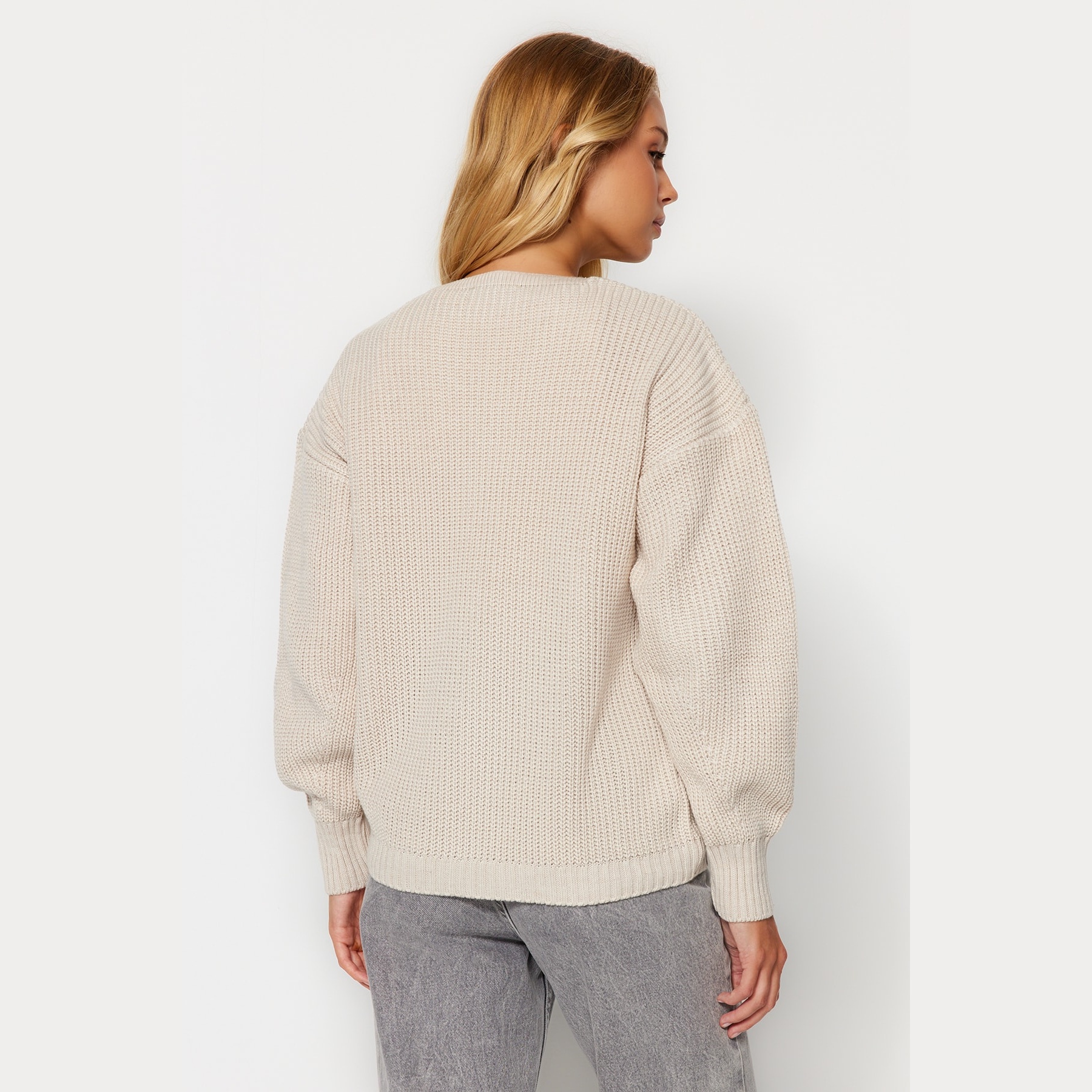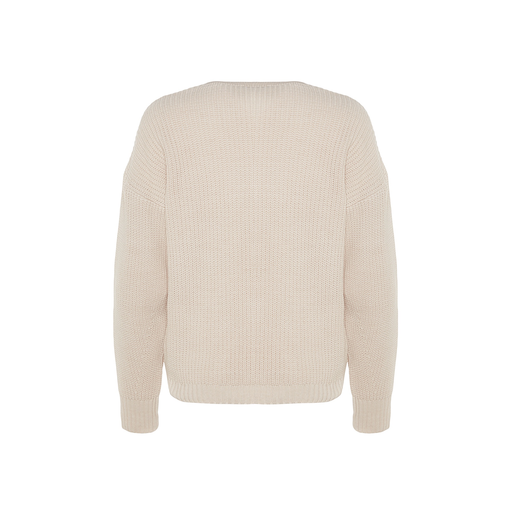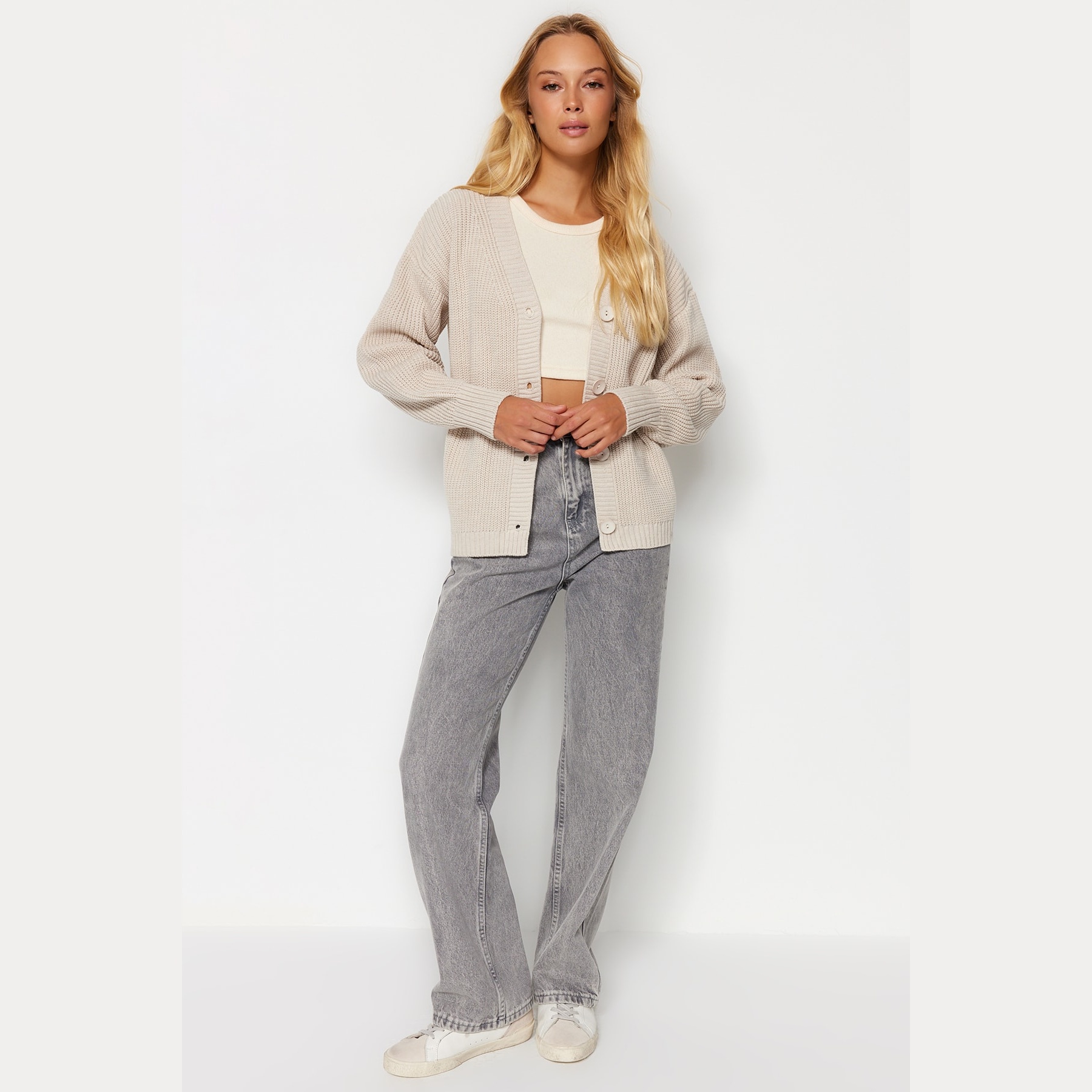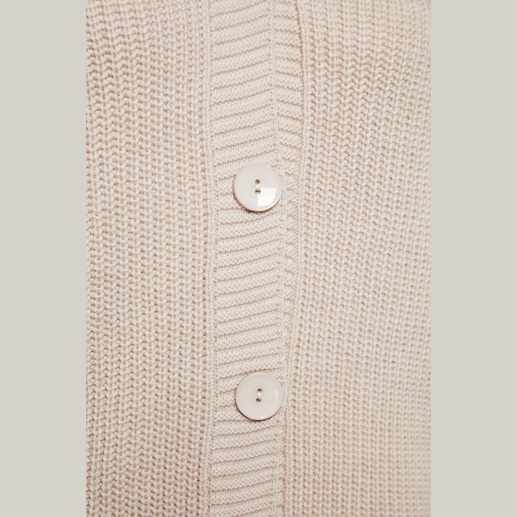كارديغان نسائي بلون بيج هادئ، مصنوع من خامة تريكو محاكة بالكامل من الأكريليك، يتميز بملمس متوسط السماكة وتصميم أساسي سهل التنسيق. يأتي بقصة منتظمة (Regular) وياقة V وأكمام طويلة بتصميم كتف منخفض، ما يجعله خيارًا مثاليًا للإطلالات اليومية في الأجواء الباردة.