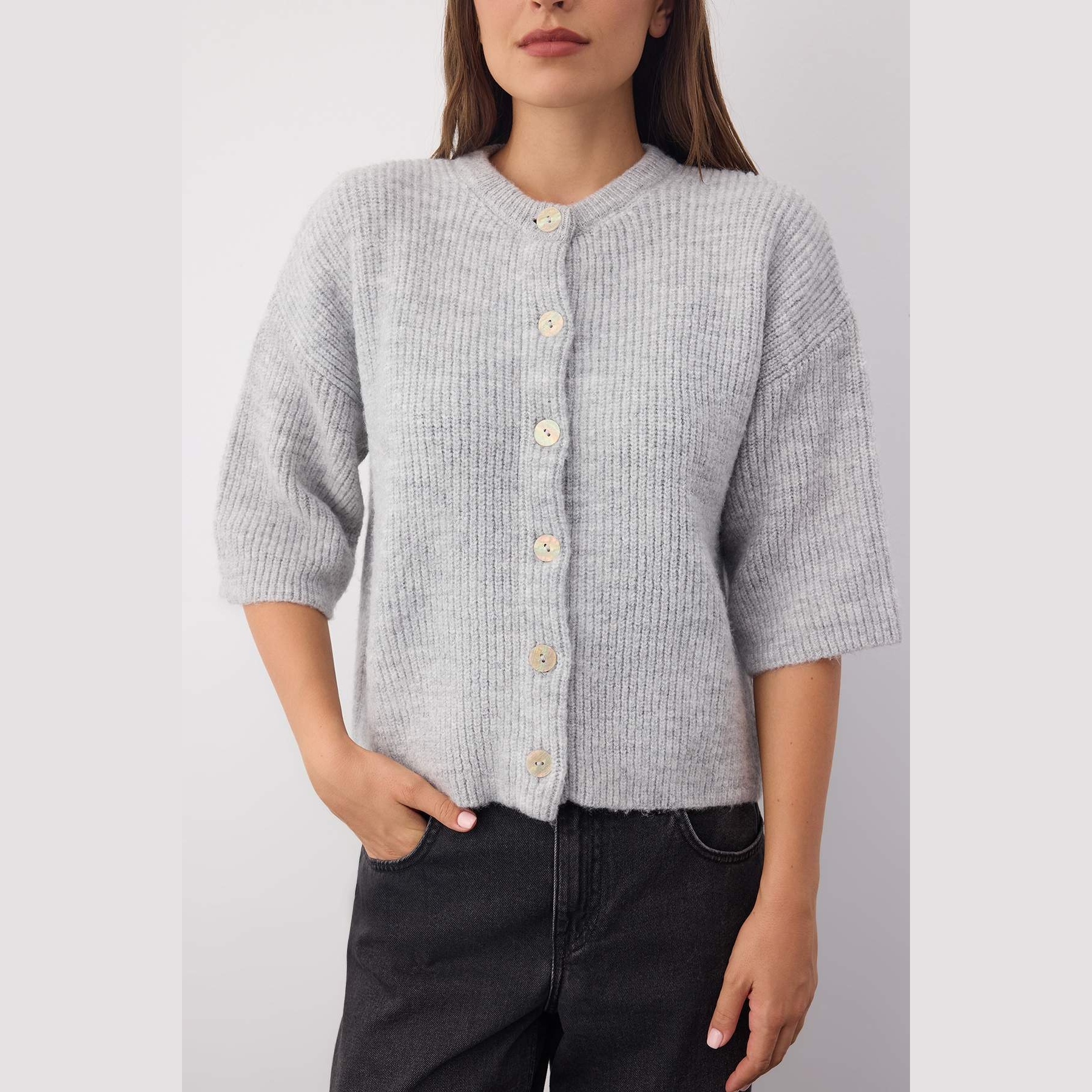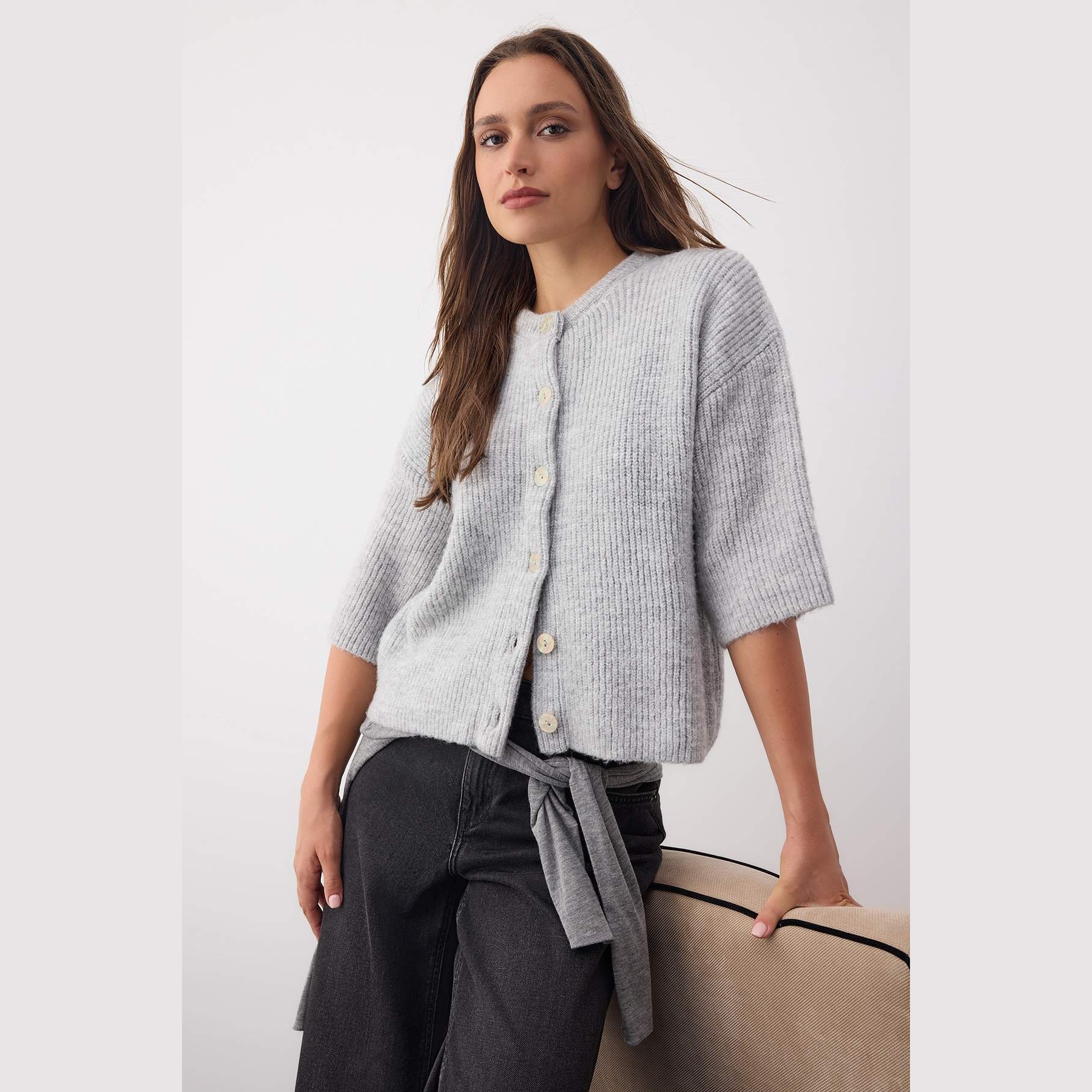 كارديغان نسائي – رمادي بملمس ناعم وقصة واسعة وأكمام قصيرة (بساطة دافئة بلمسة موسمية)