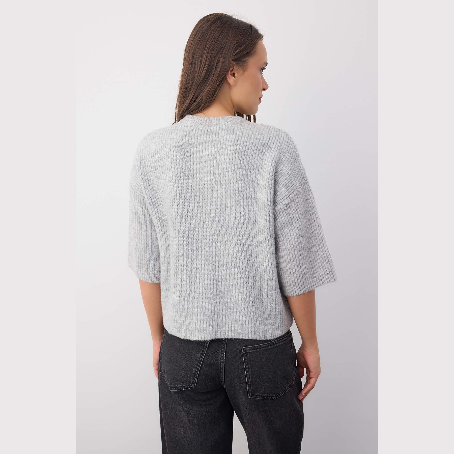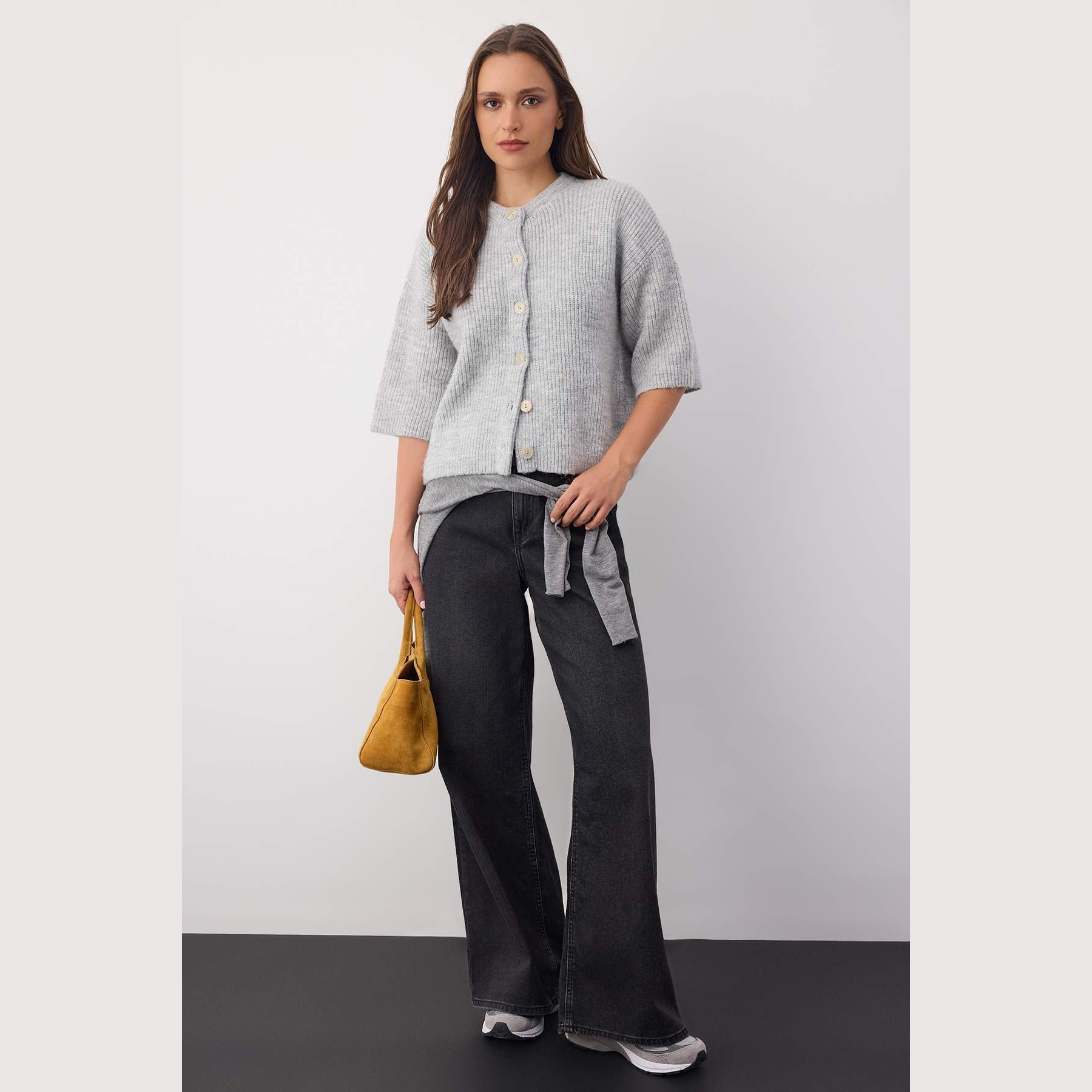 كارديغان نسائي بلون رمادي حيادي، مصنوع من خامة تريكو محاكة بتركيبة مزدوجة من الأكريليك والبوليستر، يتميز بملمس ناعم وسُمك مناسب للأجواء الباردة. يأتي بقصة واسعة (Oversize) وياقة دائرية (Bisiklet Yaka) وأكمام قصيرة بتصميم كتف منخفض، ما يجعله خيارًا مثاليًا للإطلالات اليومية في المواسم الانتقالية.
