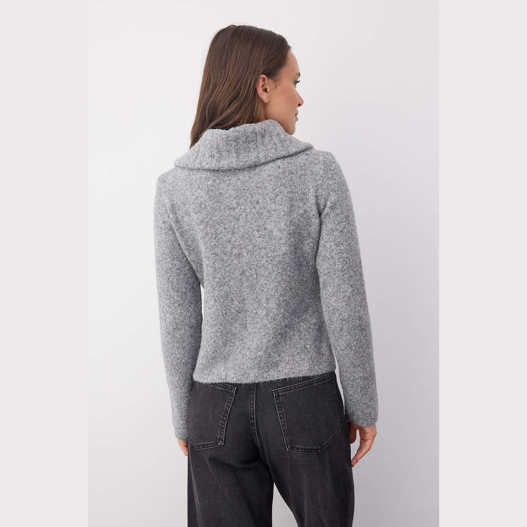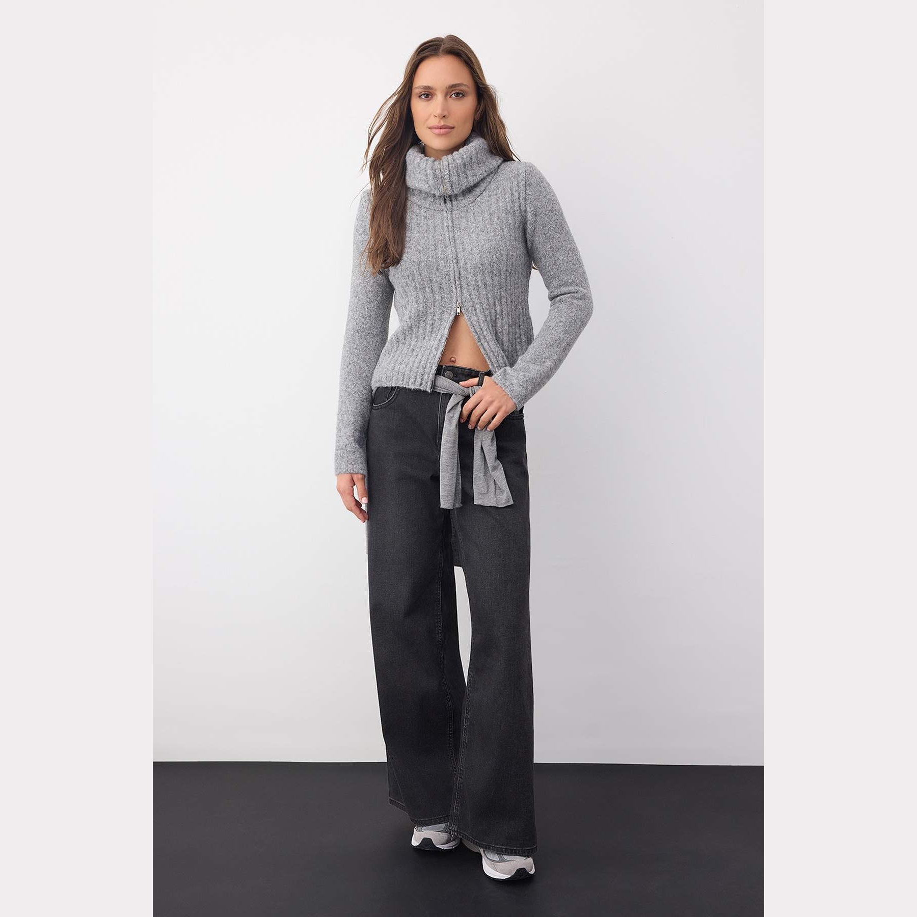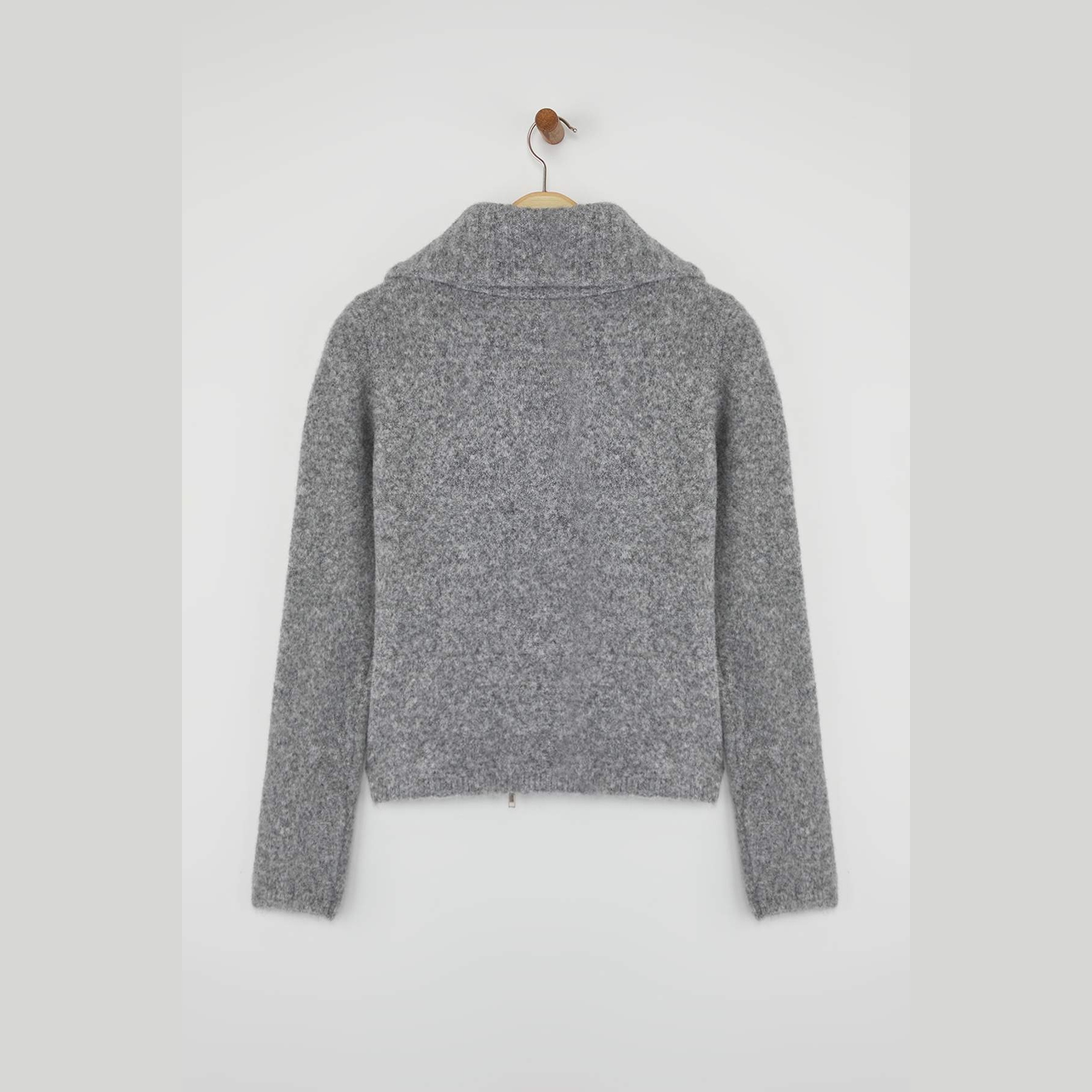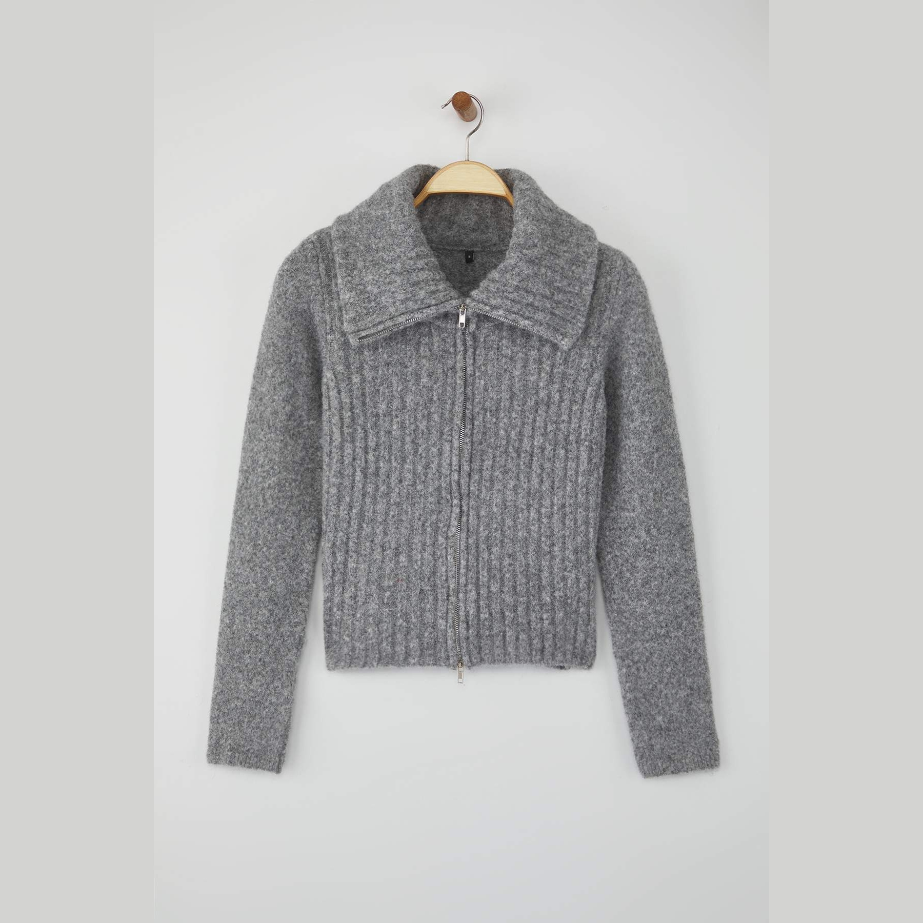 كارديغان نسائي بلون رمادي داكن، مصنوع من خامة تريكو محاكة بتركيبة متعددة تشمل البوليستر والأكريليك والصوف، يتميز بملمس "سَكال/تُيول" ناعم وسُمك متوسط مثالي للأجواء الشتوية. يأتي بقصة منتظمة (Regular) وياقة منسدلة (Devrik Yaka) وسحاب أمامي عملي، مع أكمام طويلة وكتف قياسي، ما يجعله خيارًا مثاليًا للإطلالات اليومية.