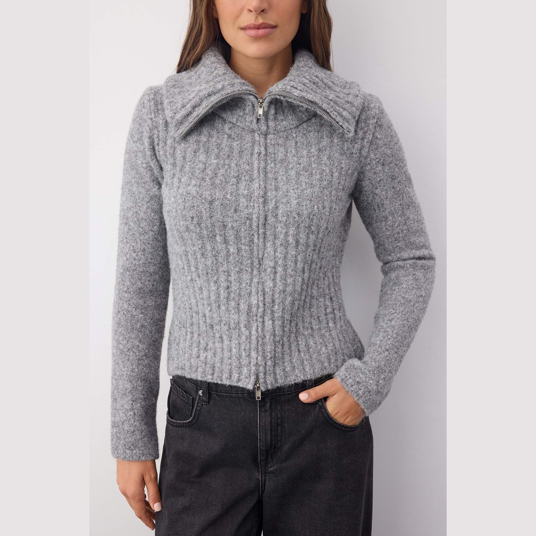 كارديغان نسائي – رمادي داكن بخامة "سَكال/تُيول" وسحاب أمامي (دفء ناعم بلمسة عصرية)
