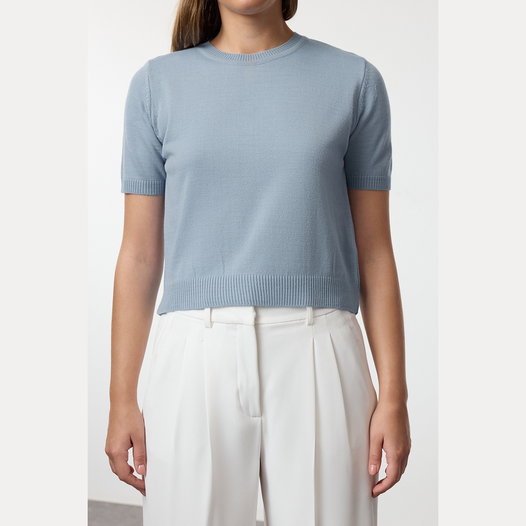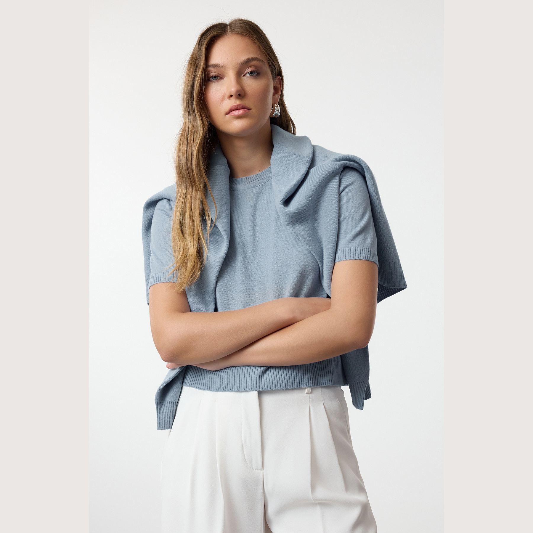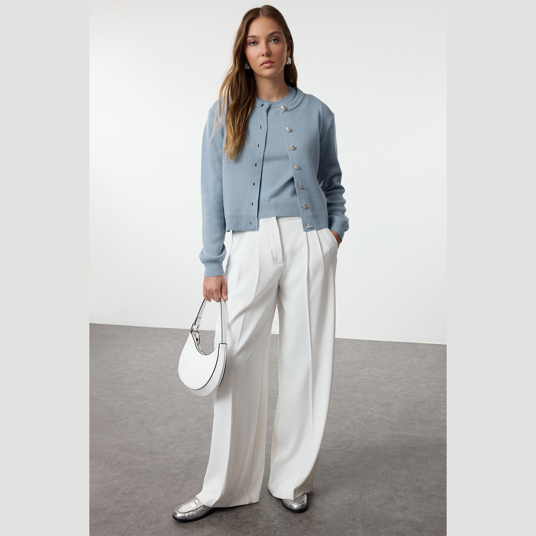 كارديغان نسائي بلون أزرق جذاب، مصنوع من خامة تريكو محاكة بالكامل من الأكريليك، يتميز بملمس متوسط السماكة وتصميم أساسي سهل التنسيق. يأتي بقصة منتظمة (Regular) وياقة دائرية (Bisiklet Yaka) وأكمام طويلة، ما يجعله خيارًا مثاليًا للإطلالات اليومية في الأجواء الباردة.