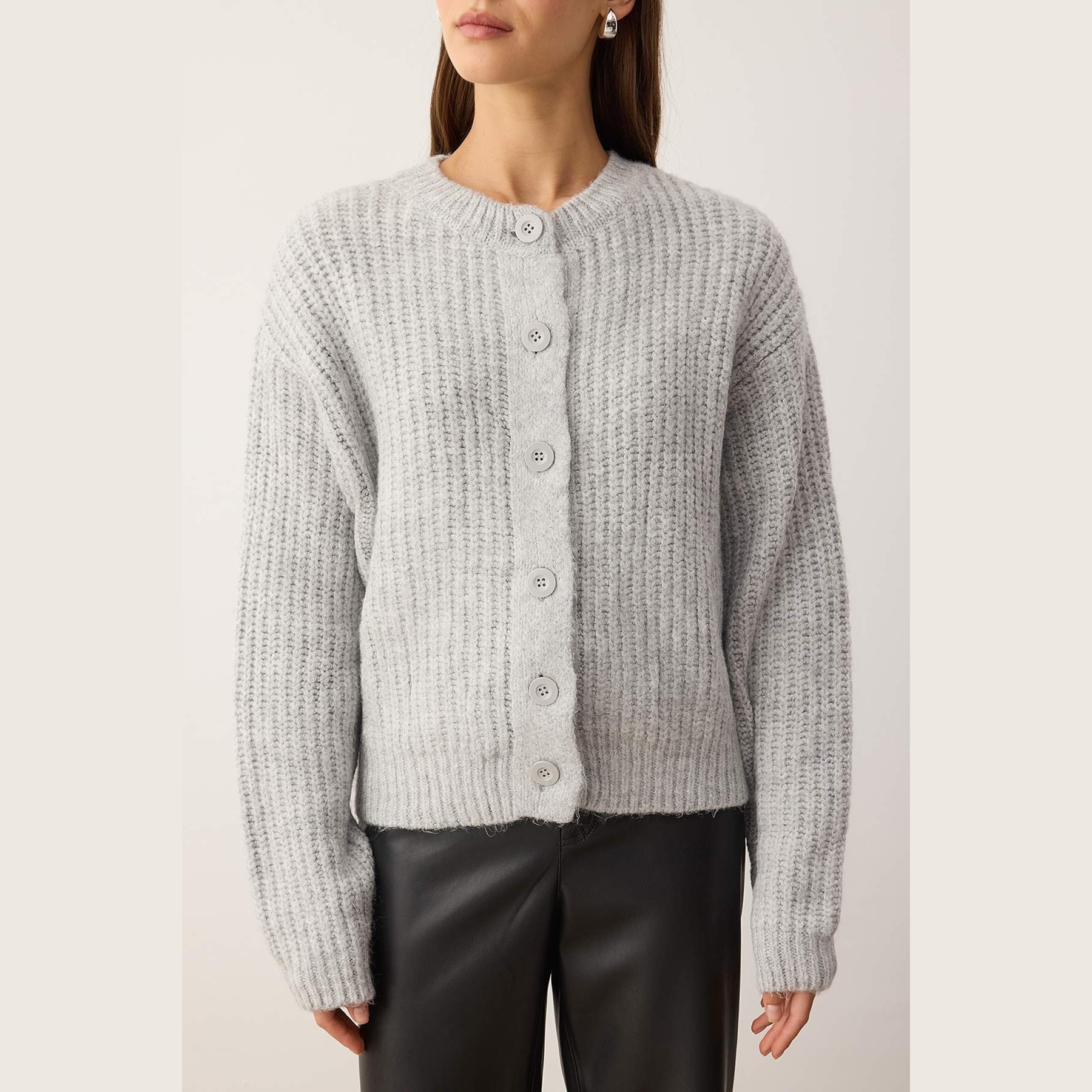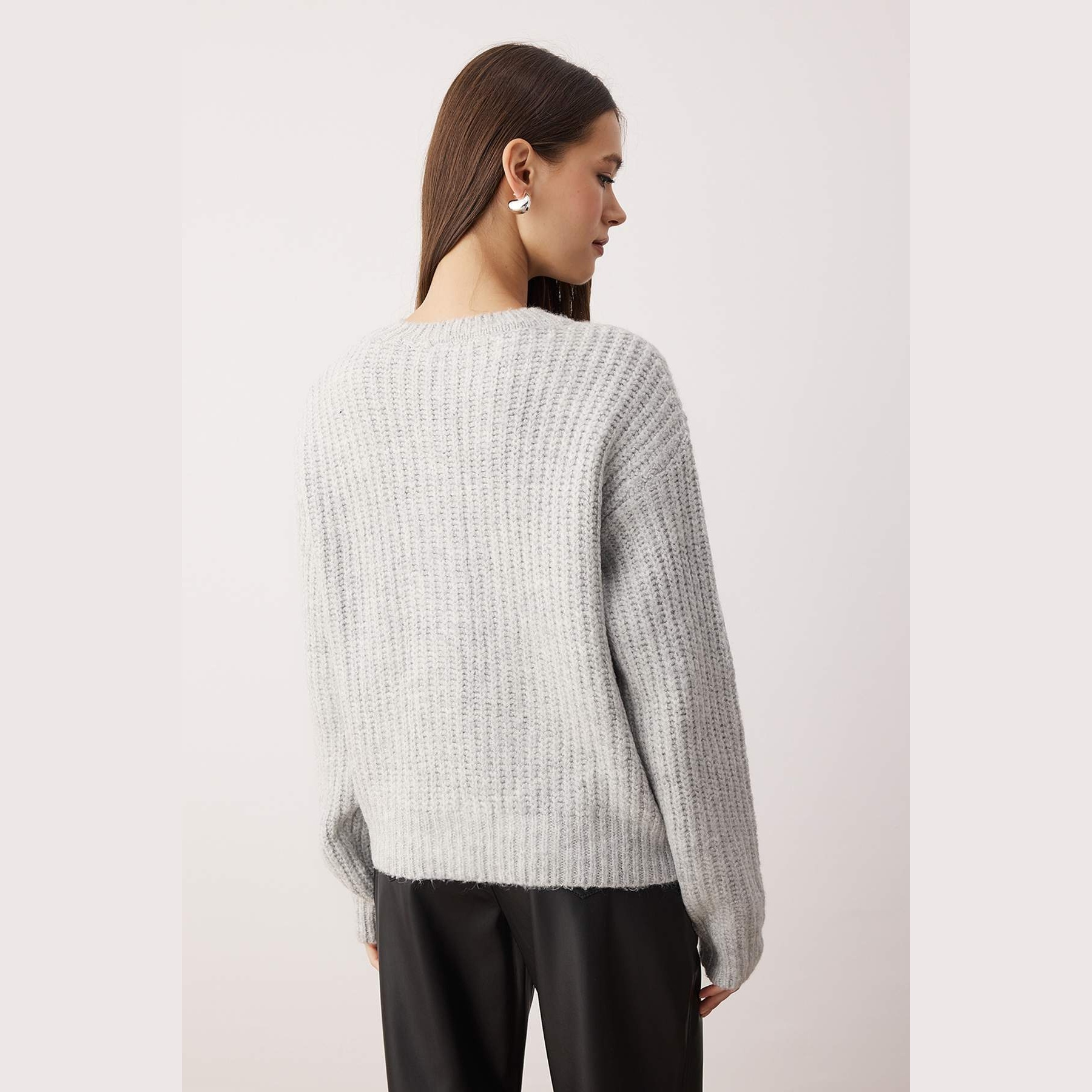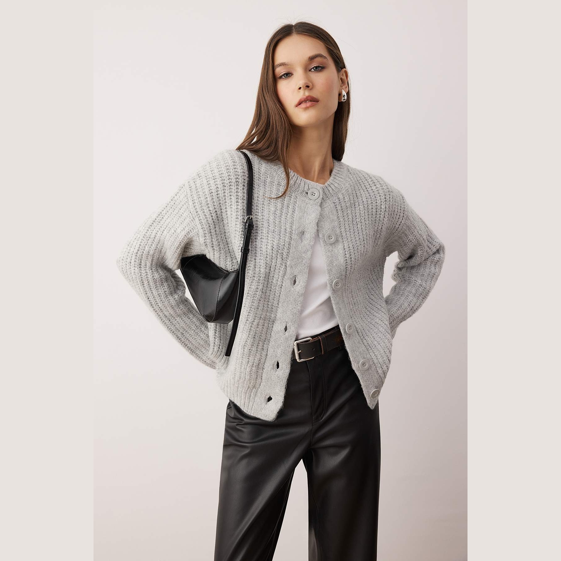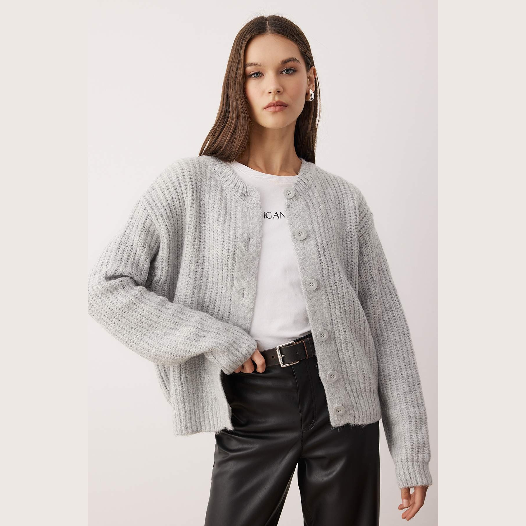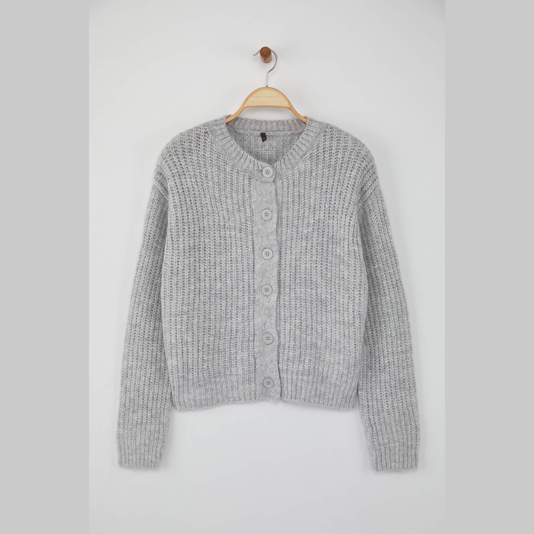 كارديغان نسائي بلون رمادي حيادي، مصنوع من خامة تريكو محاكة بتركيبة مزدوجة من الأكريليك والبوليستر، يتميز بملمس ناعم وسُمك مناسب للأجواء الشتوية. يأتي بقصة منتظمة (Regular) وياقة دائرية (Bisiklet Yaka) وأكمام طويلة، ما يجعله خيارًا مثاليًا للإطلالات اليومية في فصل الشتاء.