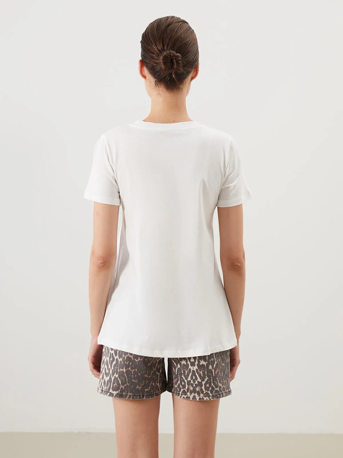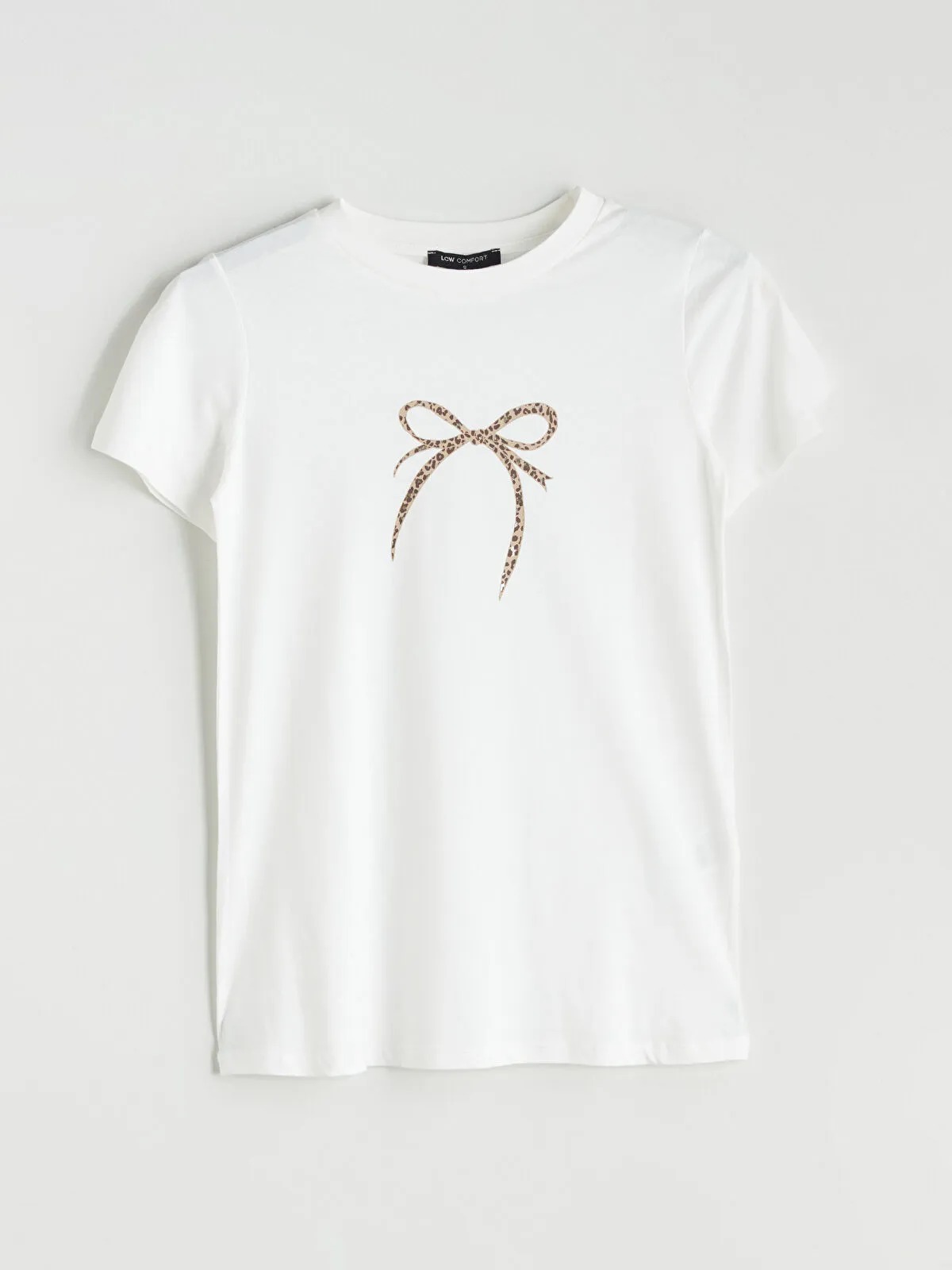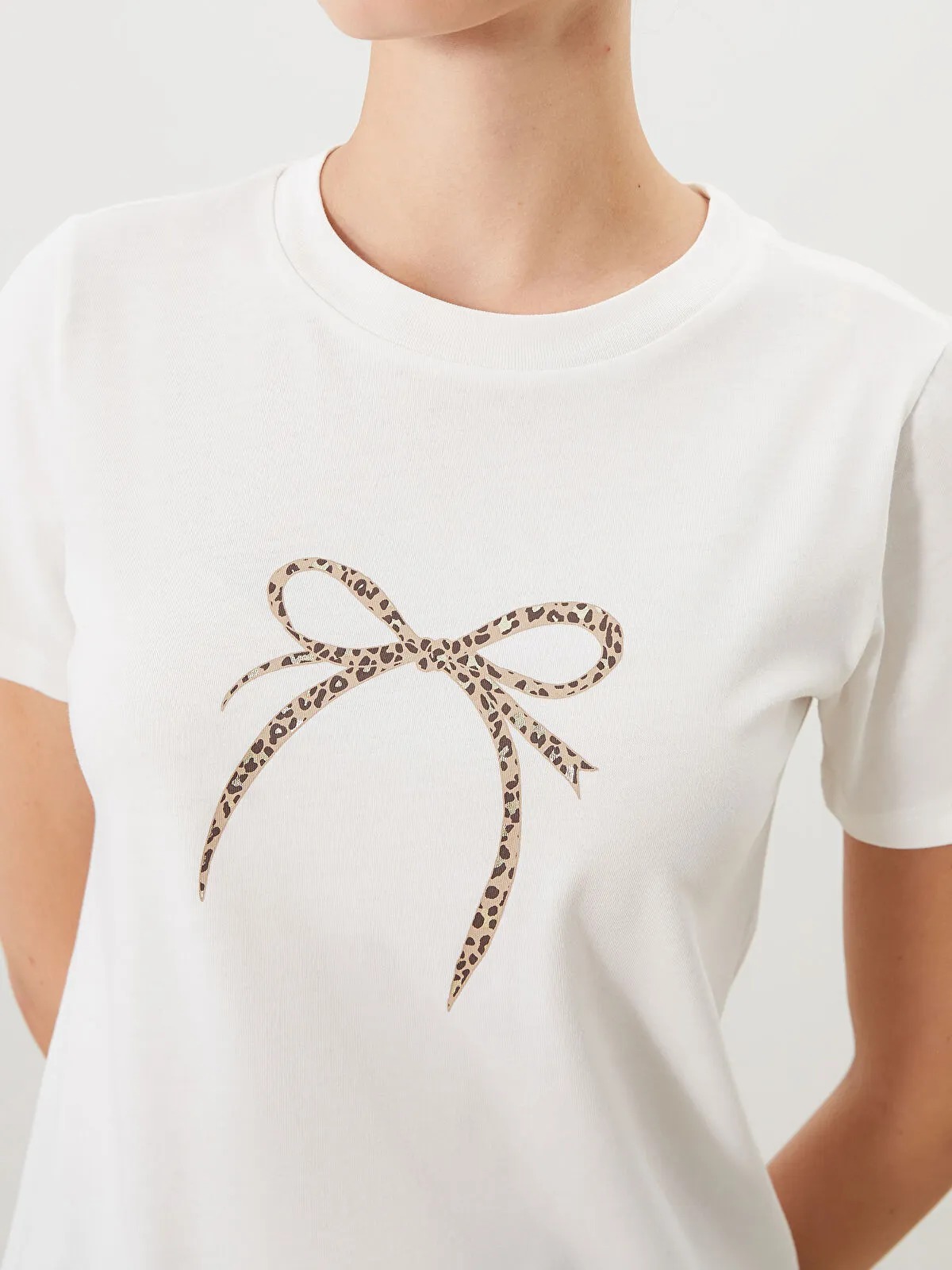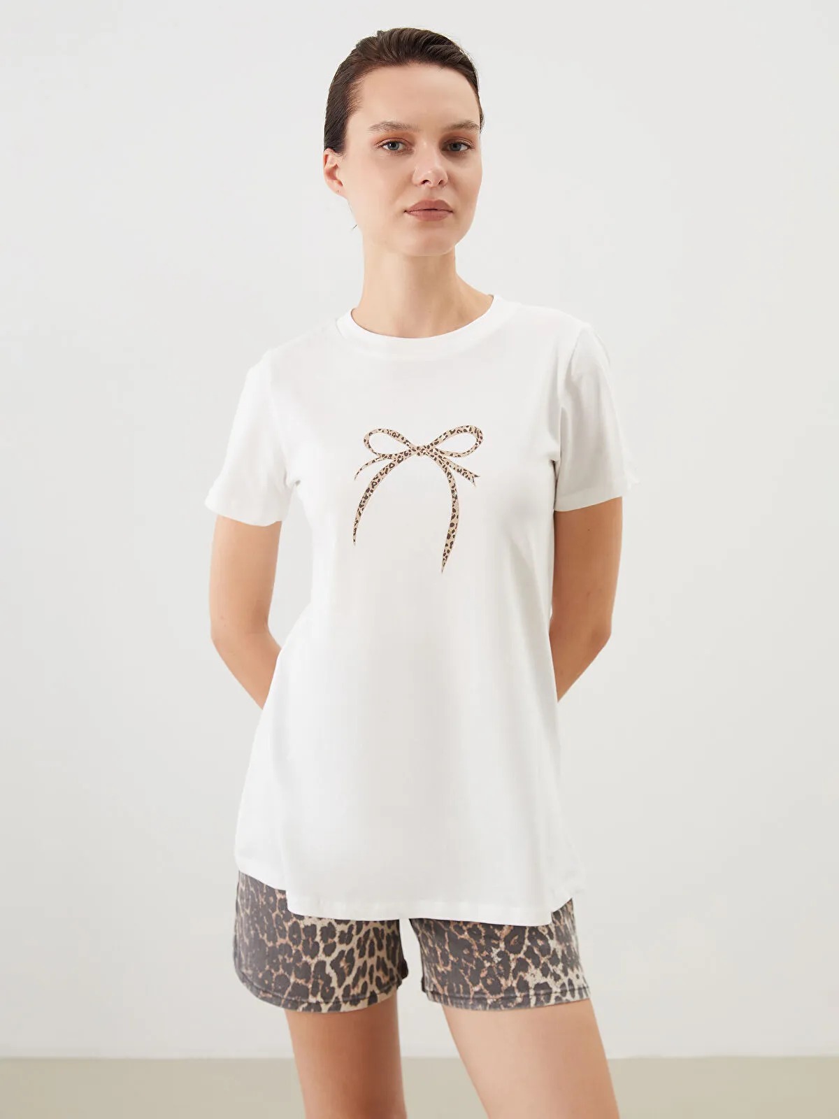 تيشيرت نسائي بلون إكرو ناعم، بياقة دائرية قصيرة وأكمام قصيرة، مزين بطبعة قوس (Bow) مع لمسة من نقش الفهد (Leopard) تعزز الإطلالة الأنثوية الأنيقة. تصميم Regular Fit يمنح حرية حركة وراحة طوال اليوم، مثالي للارتداء الكاجوال بأنوثة راقية.