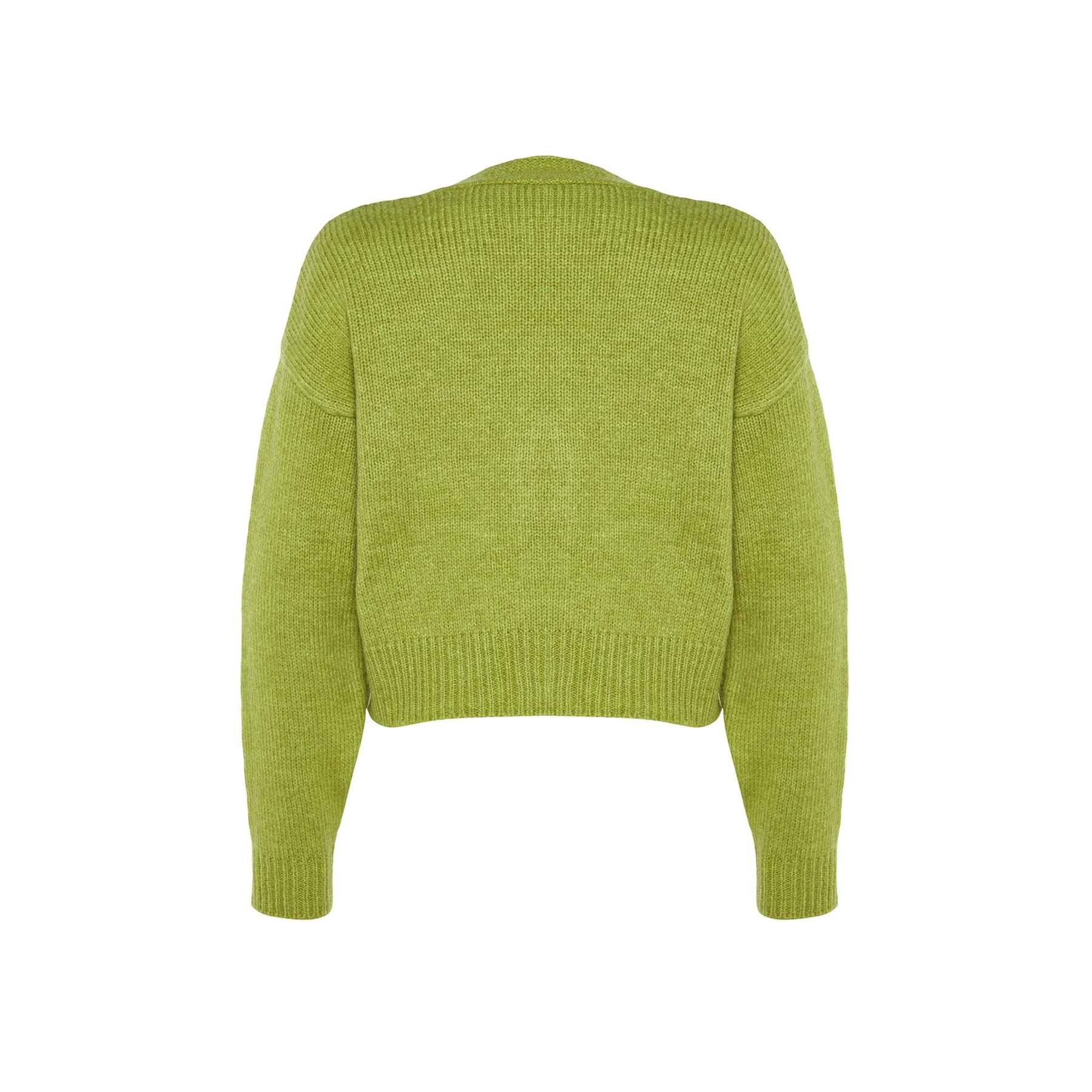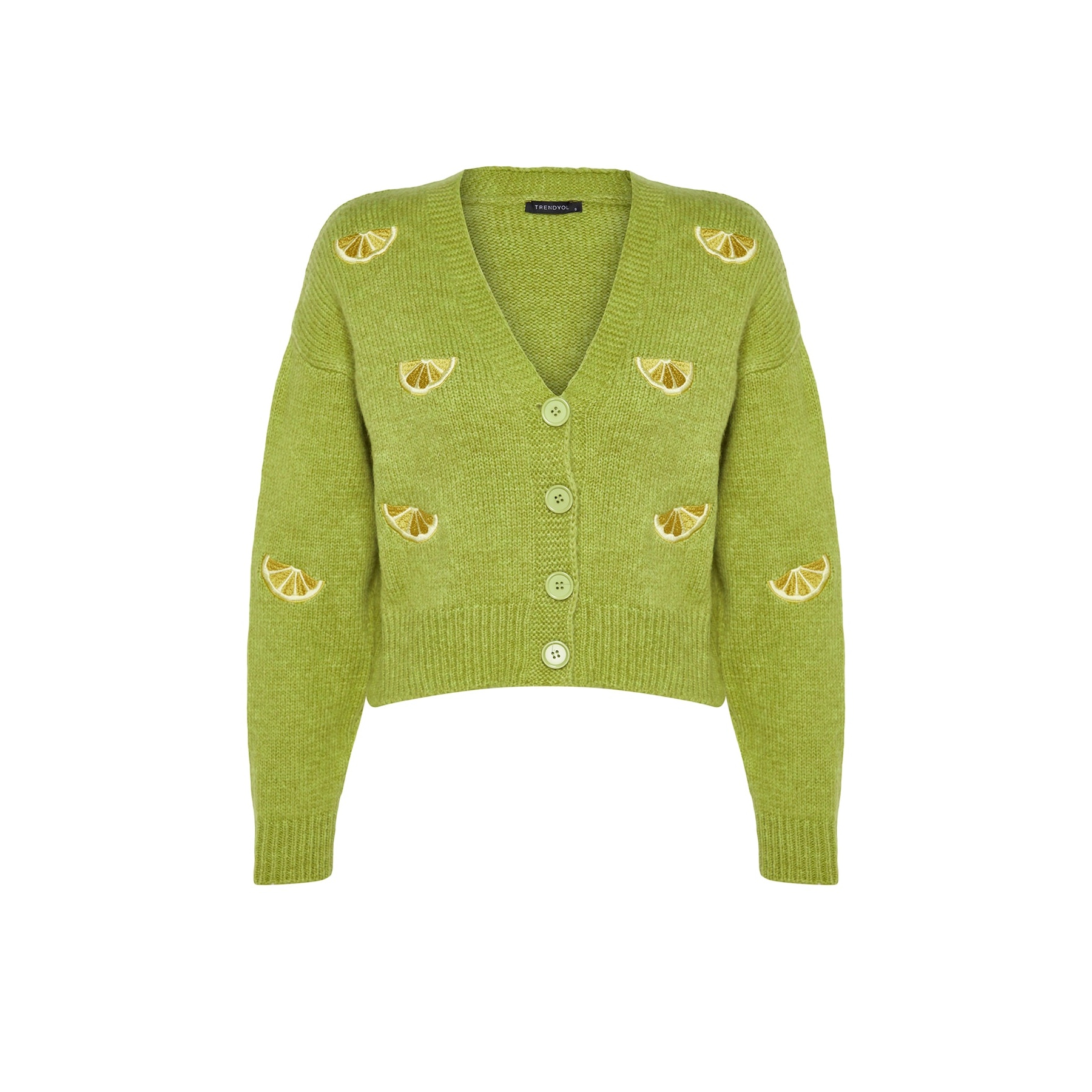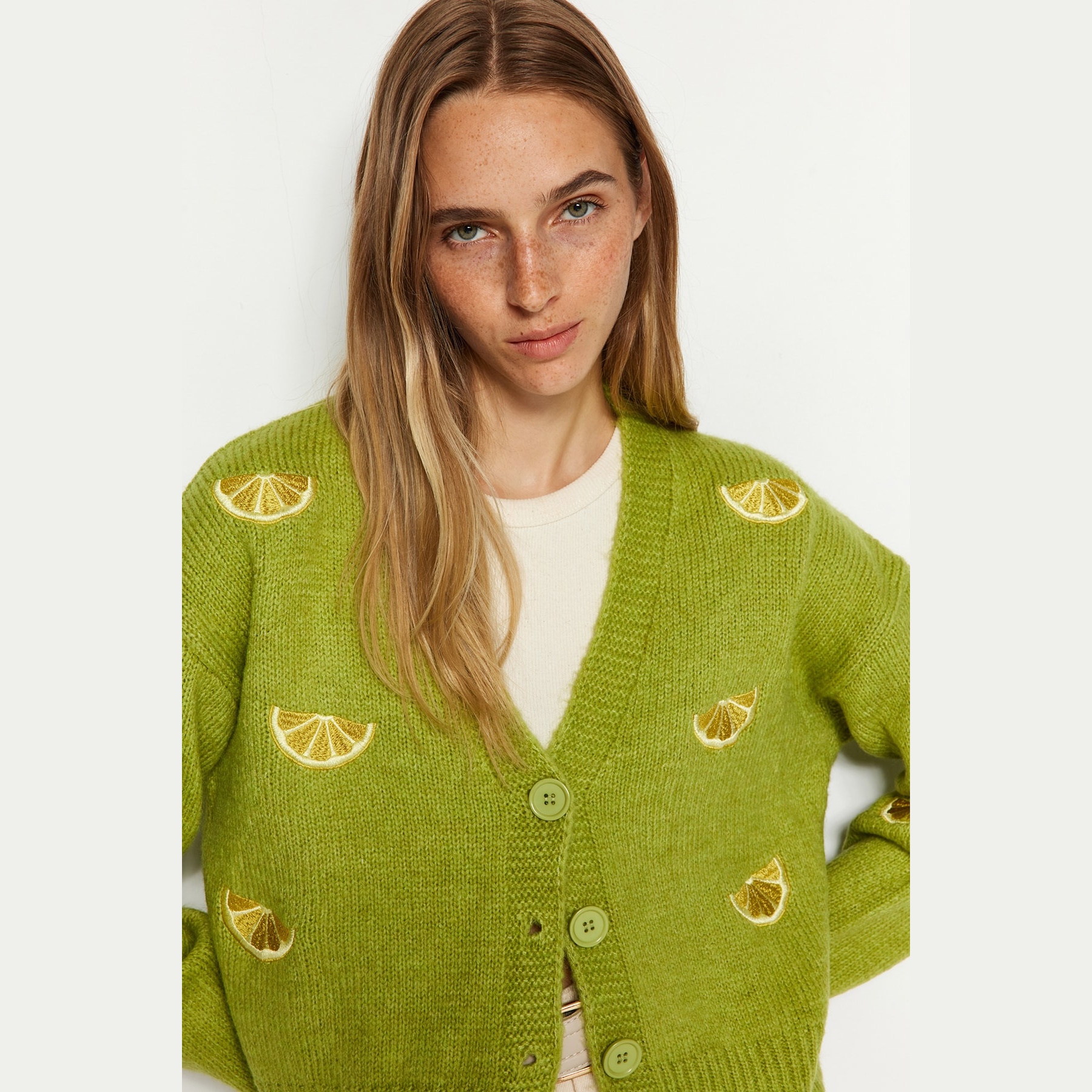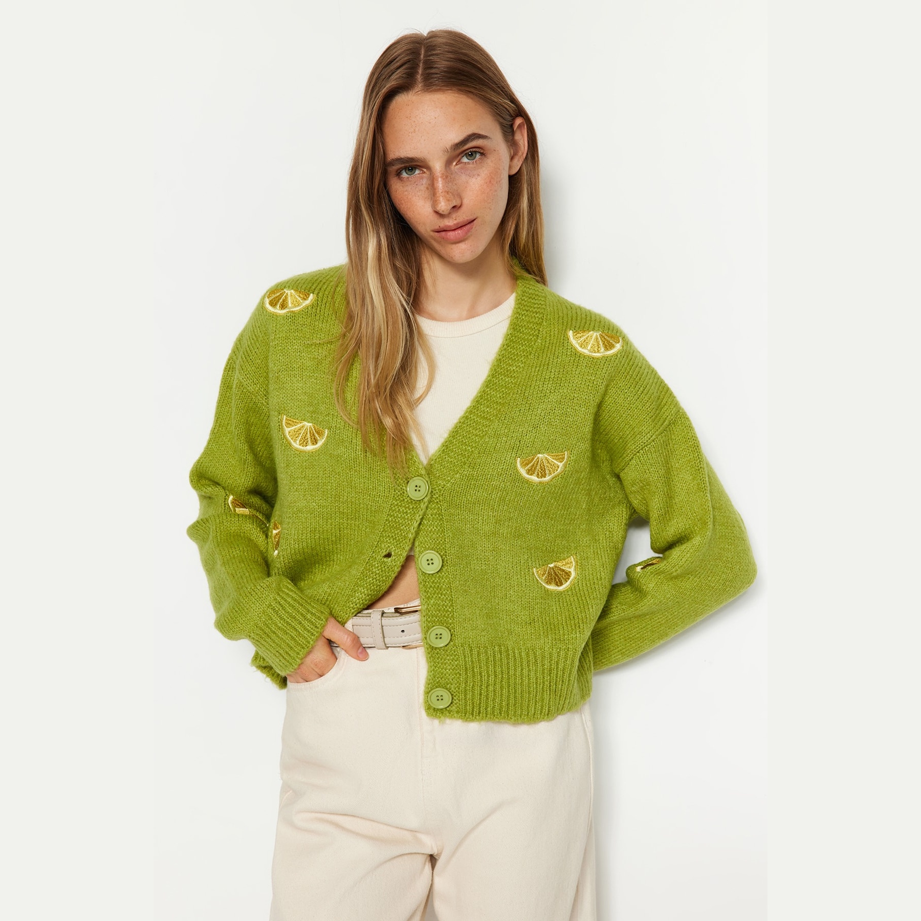 كارديغان نسائي – أخضر بملمس ناعم وتفاصيل تطريز وياقة V (دفء أنثوي بلمسة مرحة)