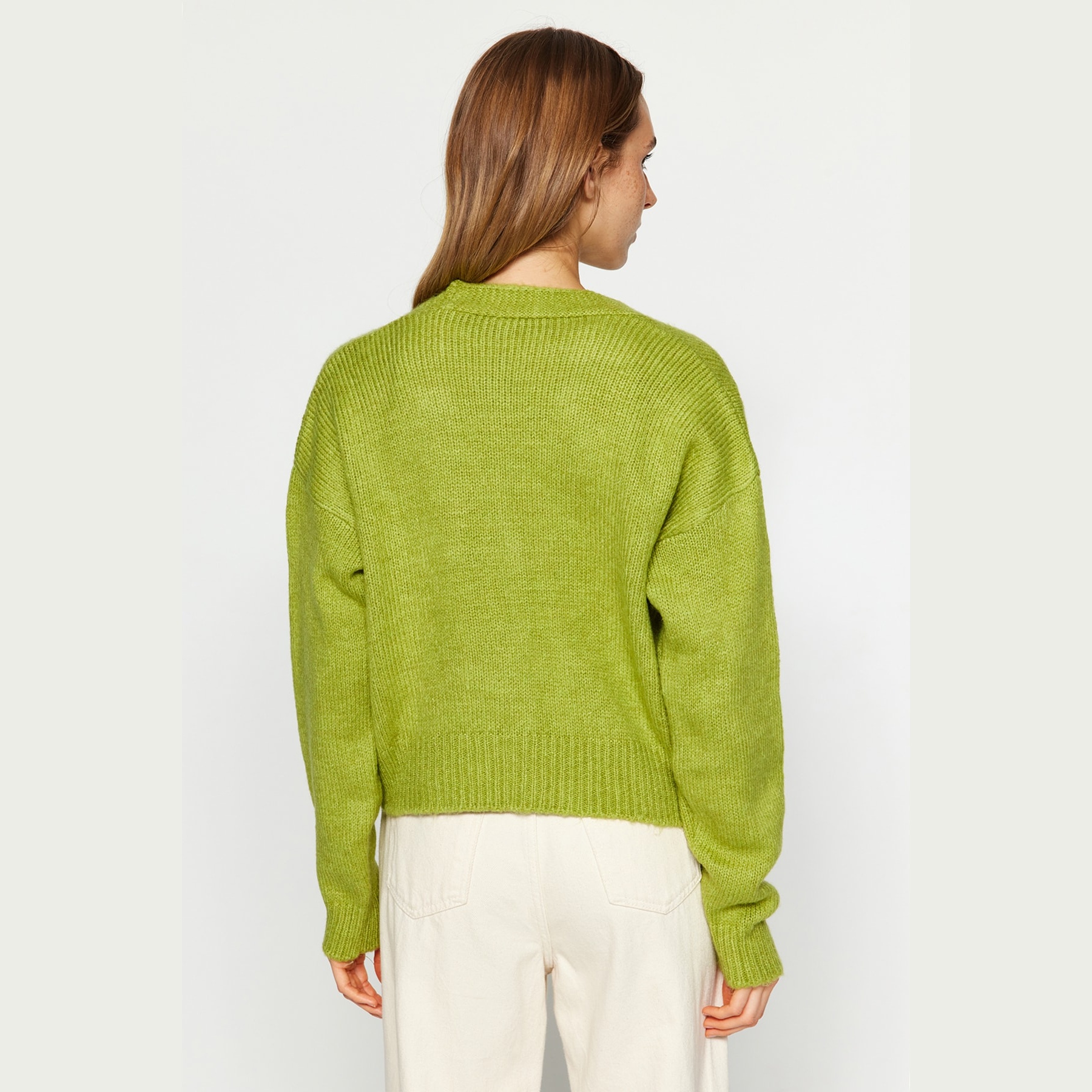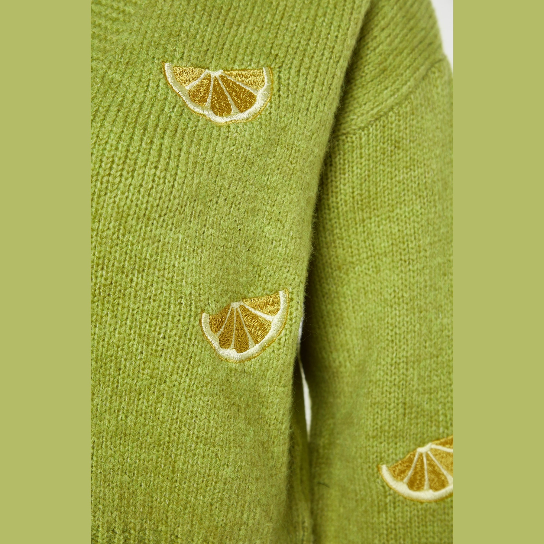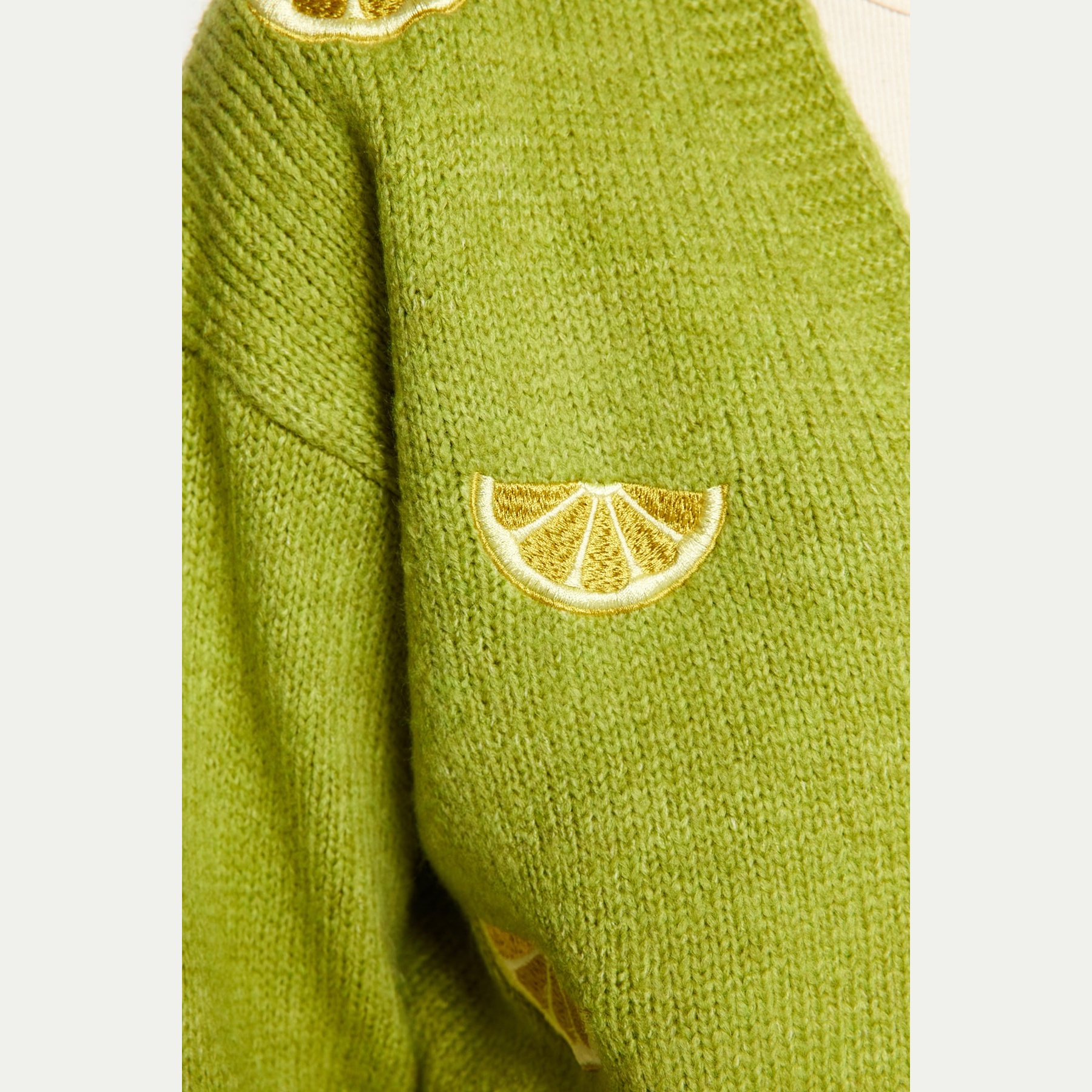 كارديغان نسائي بلون أخضر جذاب، مصنوع من خامة تريكو محاكة بتركيبة مزدوجة من الأكريليك والبوليستر، يتميز بملمس ناعم وتفاصيل تطريز تضيف لمسة مرحة وأنثوية. يأتي بقصة واسعة (Oversize) وياقة V وأكمام طويلة بتصميم كتف منخفض، ما يجعله خيارًا مثاليًا للإطلالات اليومية في فصل الشتاء.