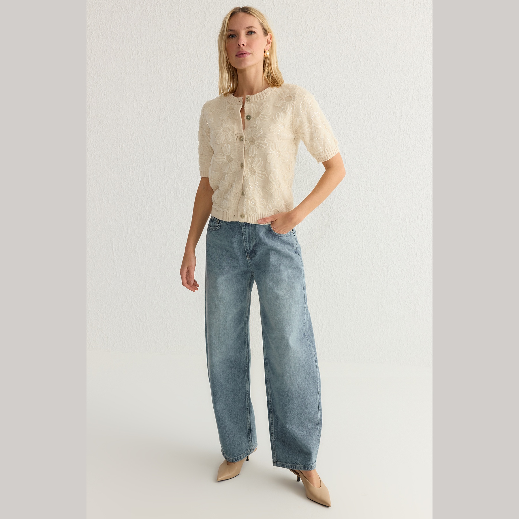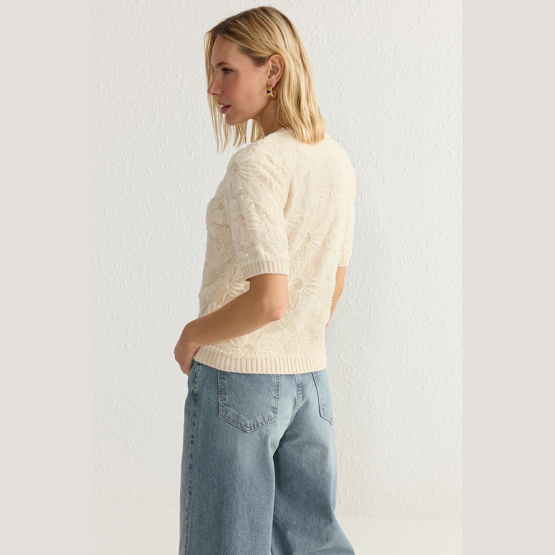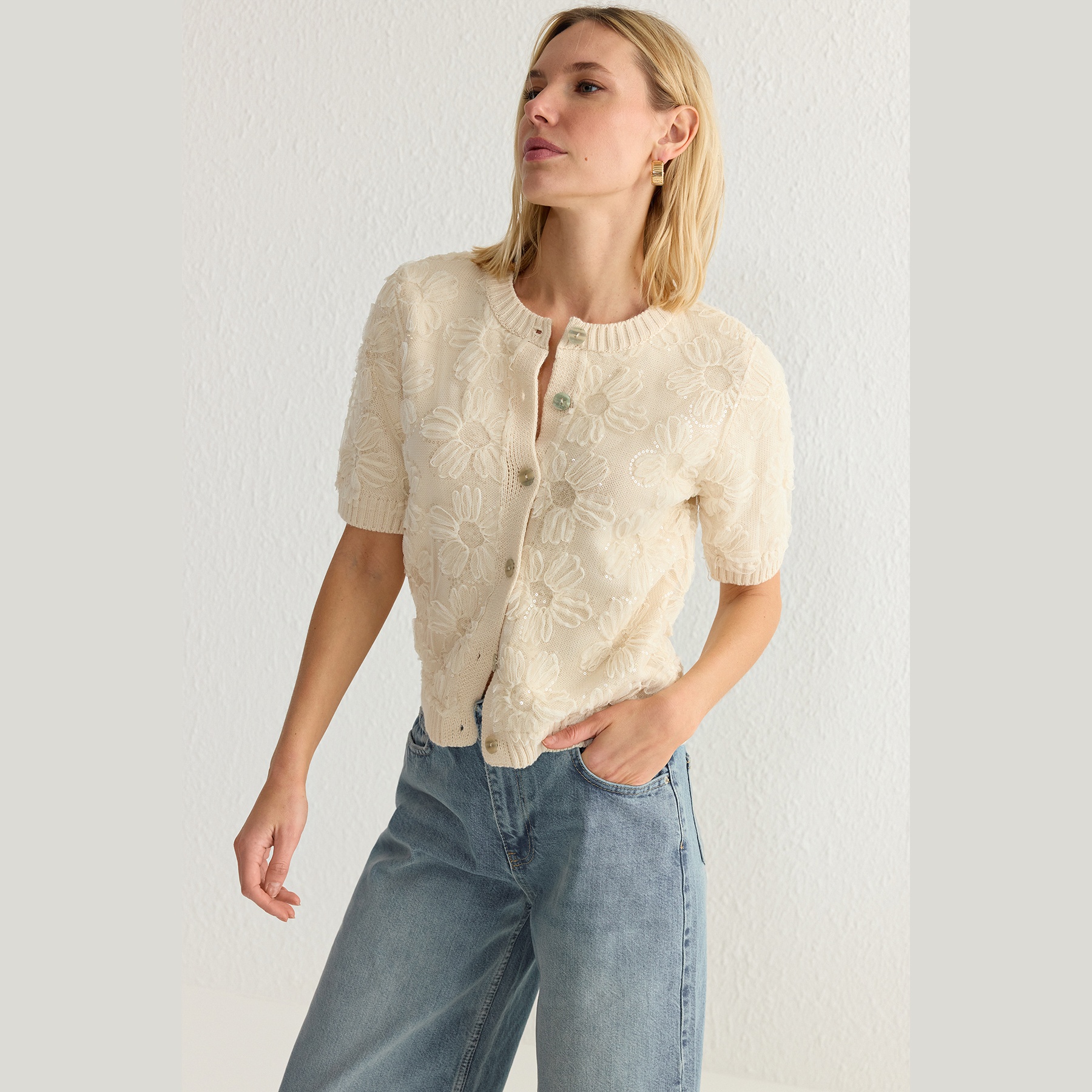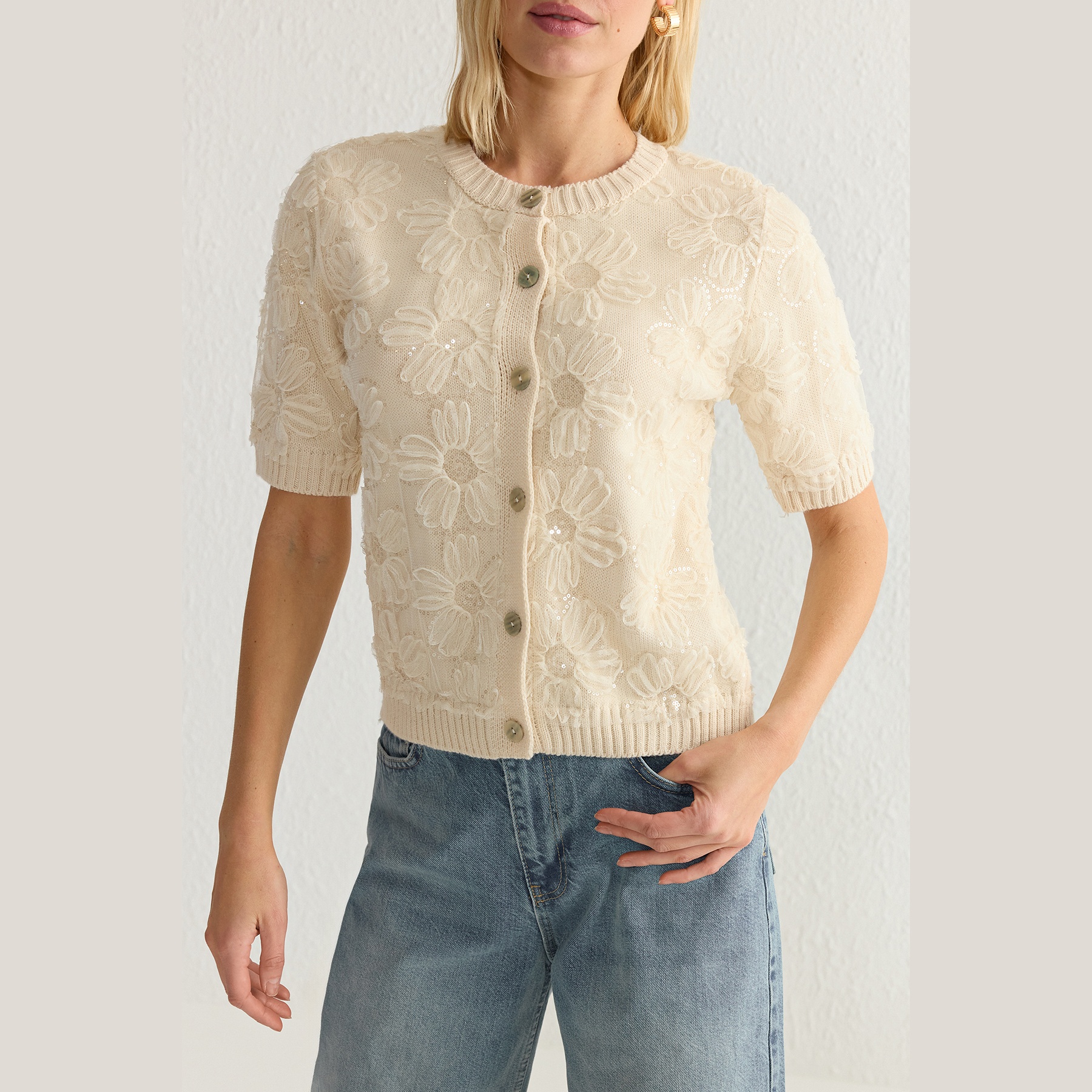 كارديغان نسائي بلون إكرو أنيق، مصنوع من خامة تريكو محاكة بالكامل من الأكريليك، يتميز بتفاصيل زهور من قماش التول تضيف لمسة أنثوية فنية. يأتي بقصة منتظمة (Regular) وياقة دائرية (Bisiklet Yaka) وأكمام قصيرة، ما يجعله خيارًا مثاليًا للإطلالات اليومية أو المناسبات الخفيفة في المواسم الانتقالية.