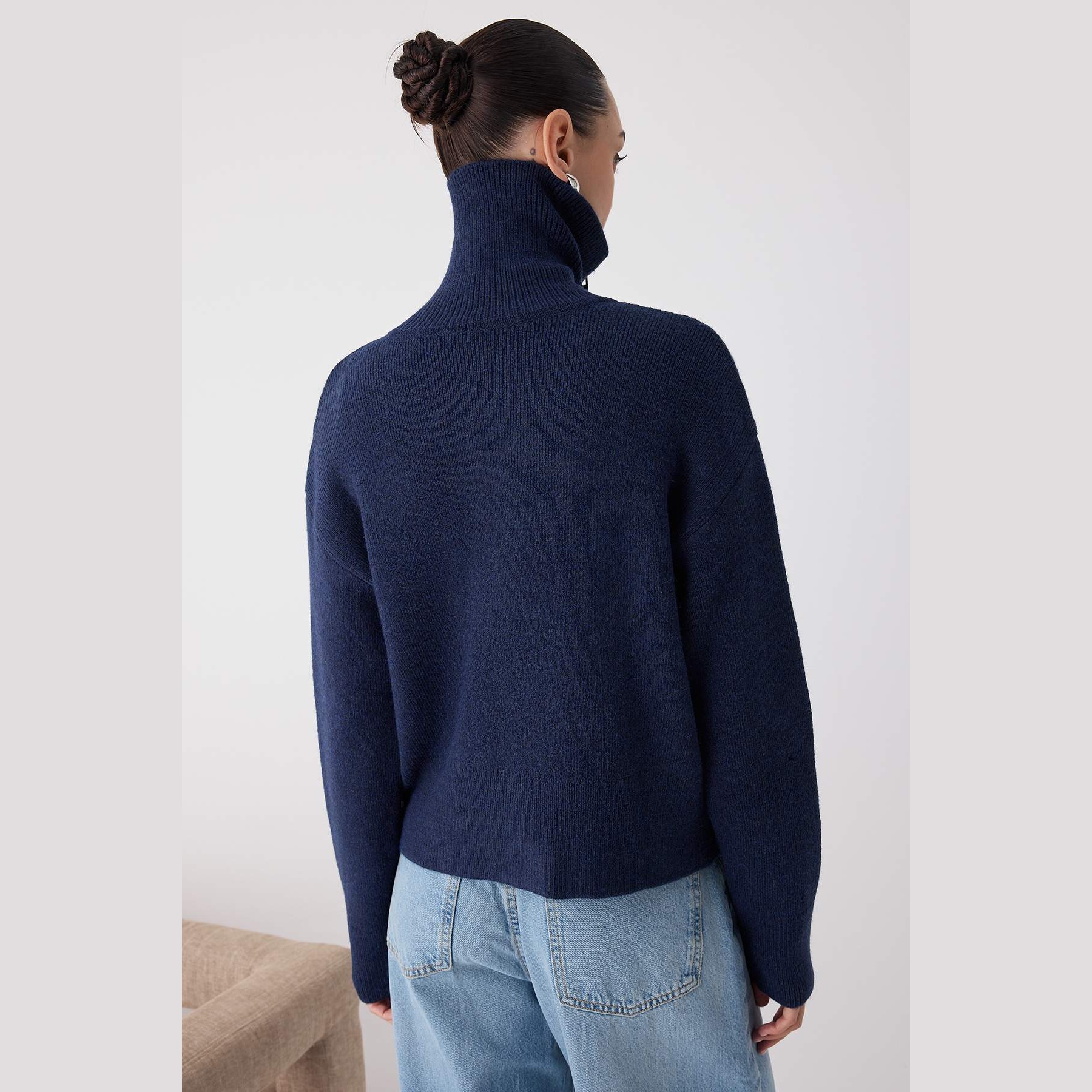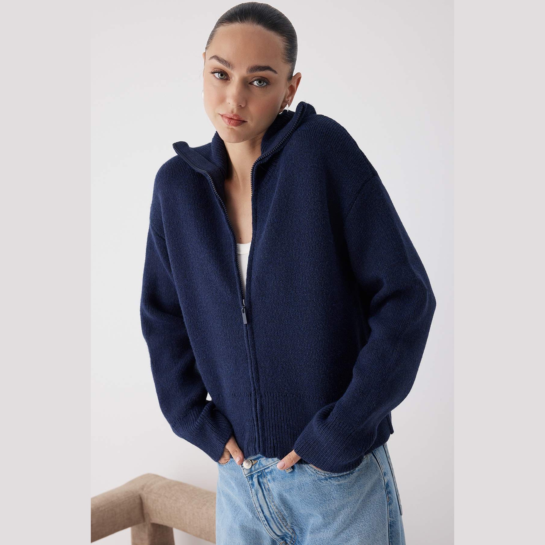كارديغان نسائي بلون كحلي أنيق، مصنوع من خامة تريكو محاكة بتركيبة ثلاثية من الأكريليك والبوليستر والبولياميد، يتميز بملمس ناعم وسُمك متوسط مثالي للأجواء الشتوية. يأتي بقصة واسعة (Oversize) وياقة منسدلة (Devrik Yaka) وسحاب أمامي عملي، مع أكمام طويلة وكتف منخفض، ما يجعله خيارًا مثاليًا للإطلالات اليومية.