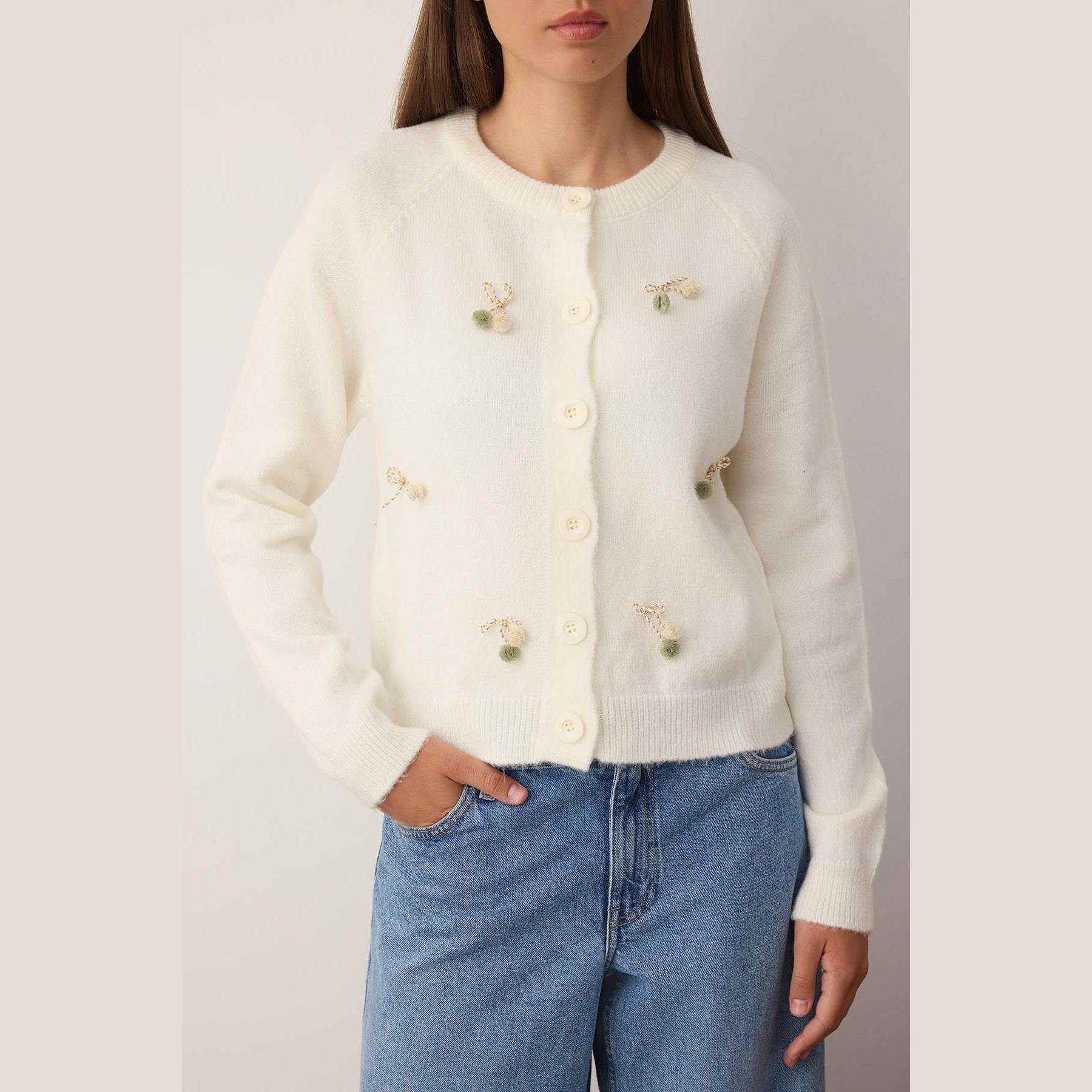 كارديغان نسائي – إكرو بياقة دائرية وتفاصيل كرز زخرفية (أنوثة مرحة بلمسة شتوية)
