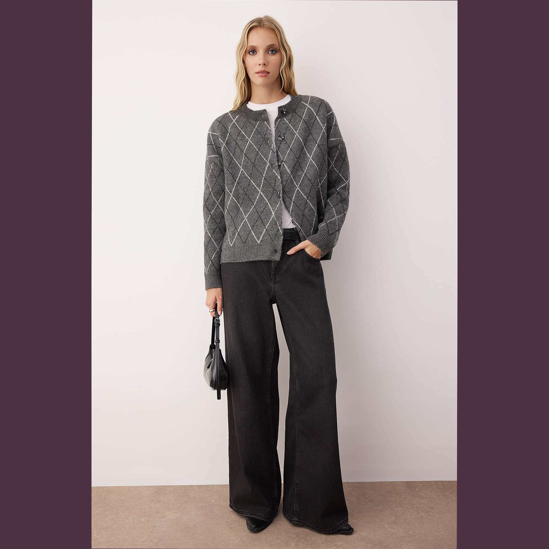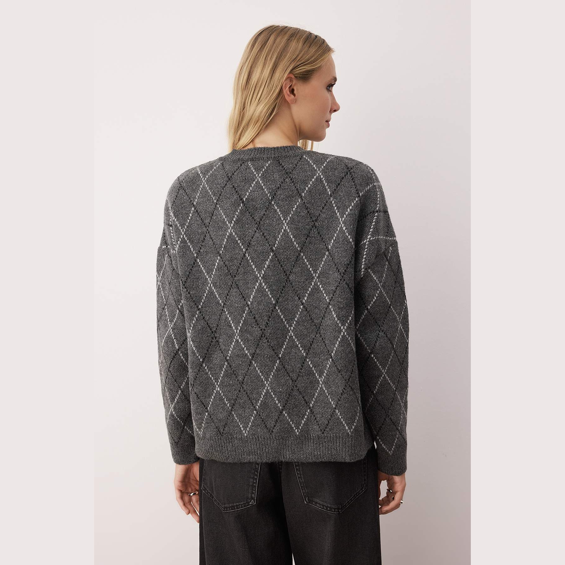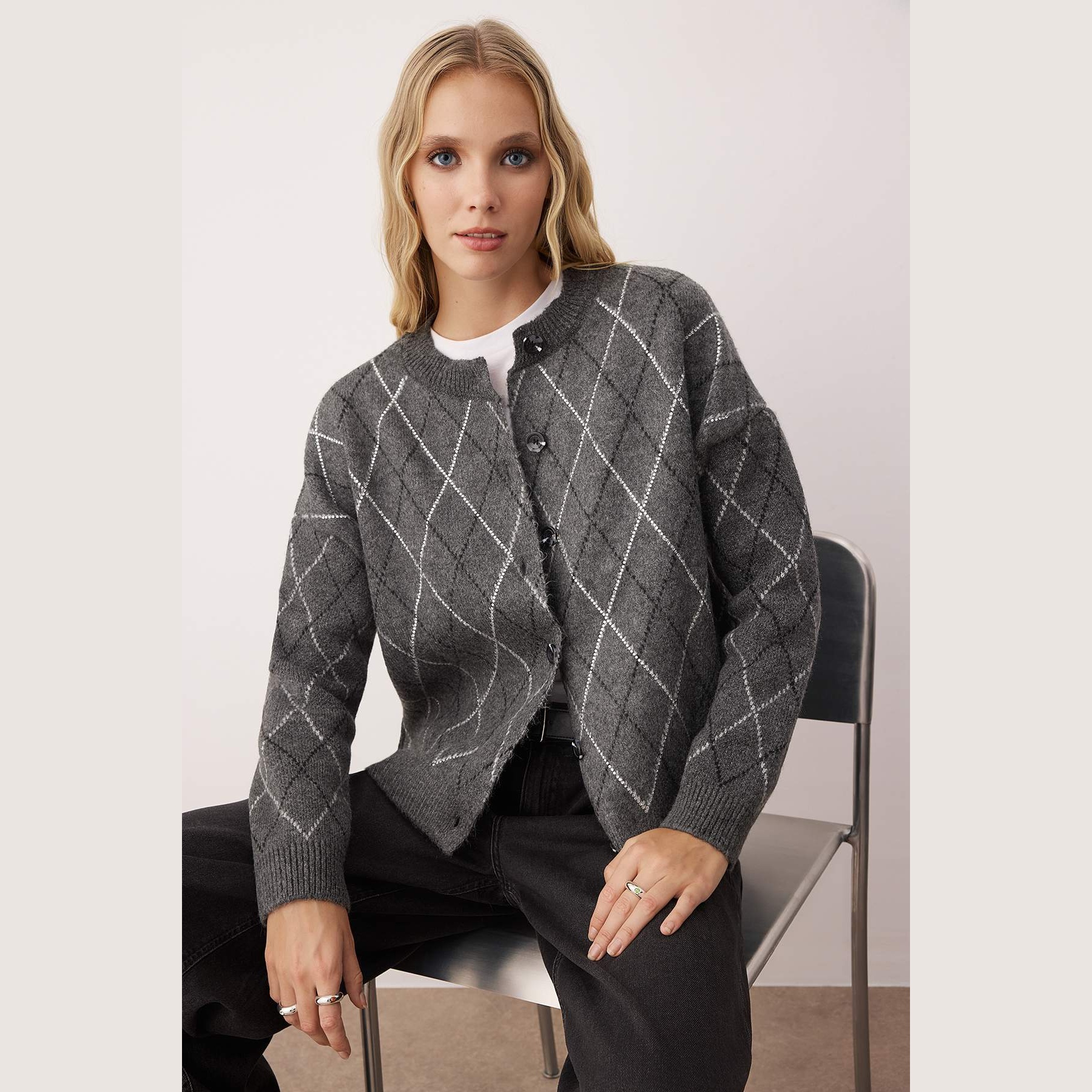كارديغان نسائي بلون أنْتراسيت أنيق، مصنوع من خامة تريكو محاكة بتركيبة مزدوجة من الأكريليك والبوليستر، يتميز بملمس ناعم وسُمك سميك مثالي للأجواء الباردة. يأتي بقصة واسعة (Oversize) وياقة دائرية (Bisiklet Yaka) وأكمام طويلة بتصميم كتف منخفض، وتبرز فيه تفاصيل حجرية تضيف لمسة فاخرة لافتة.