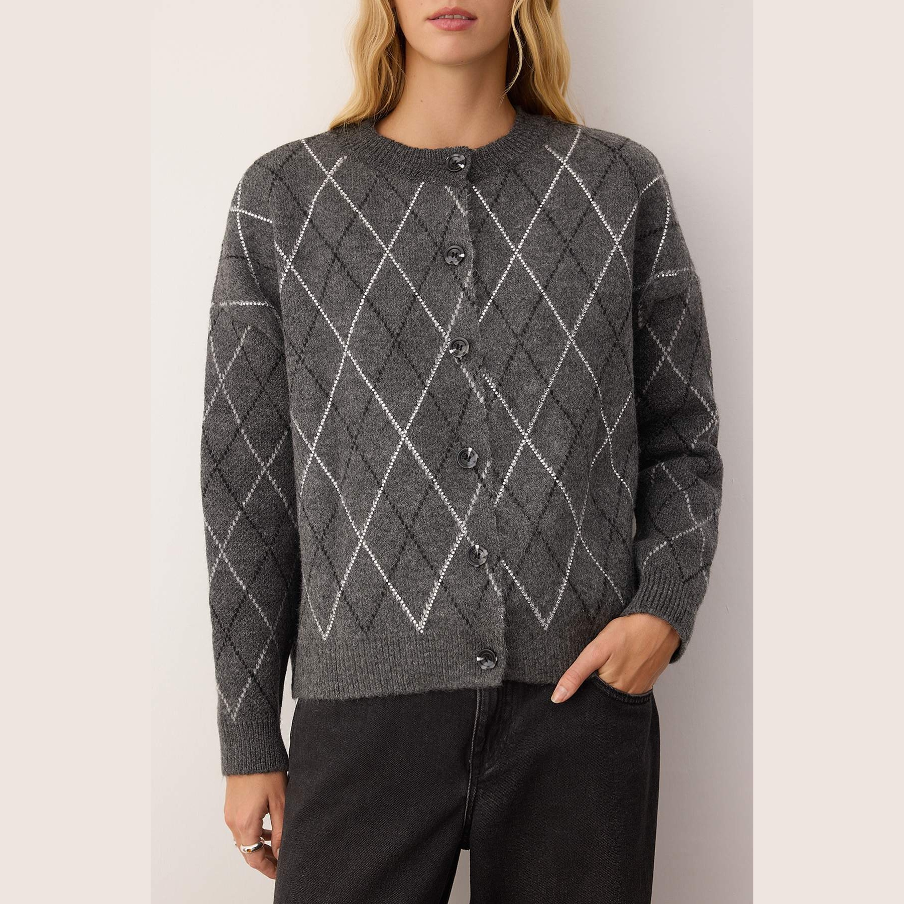 كارديغان نسائي – أنْتراسيت بملمس ناعم وتفاصيل حجرية وقصة واسعة (فخامة شتوية بلمسة لامعة)