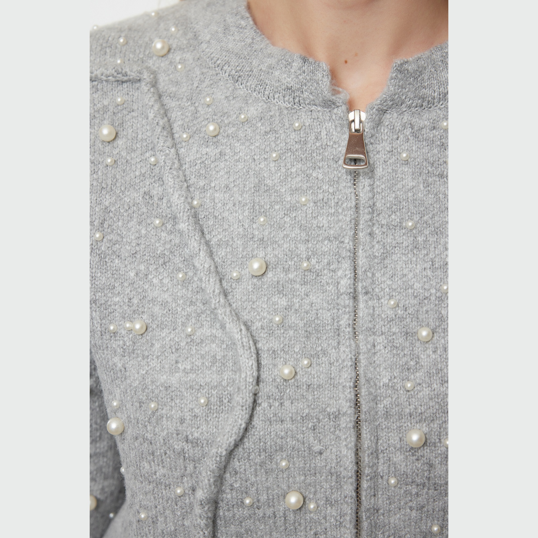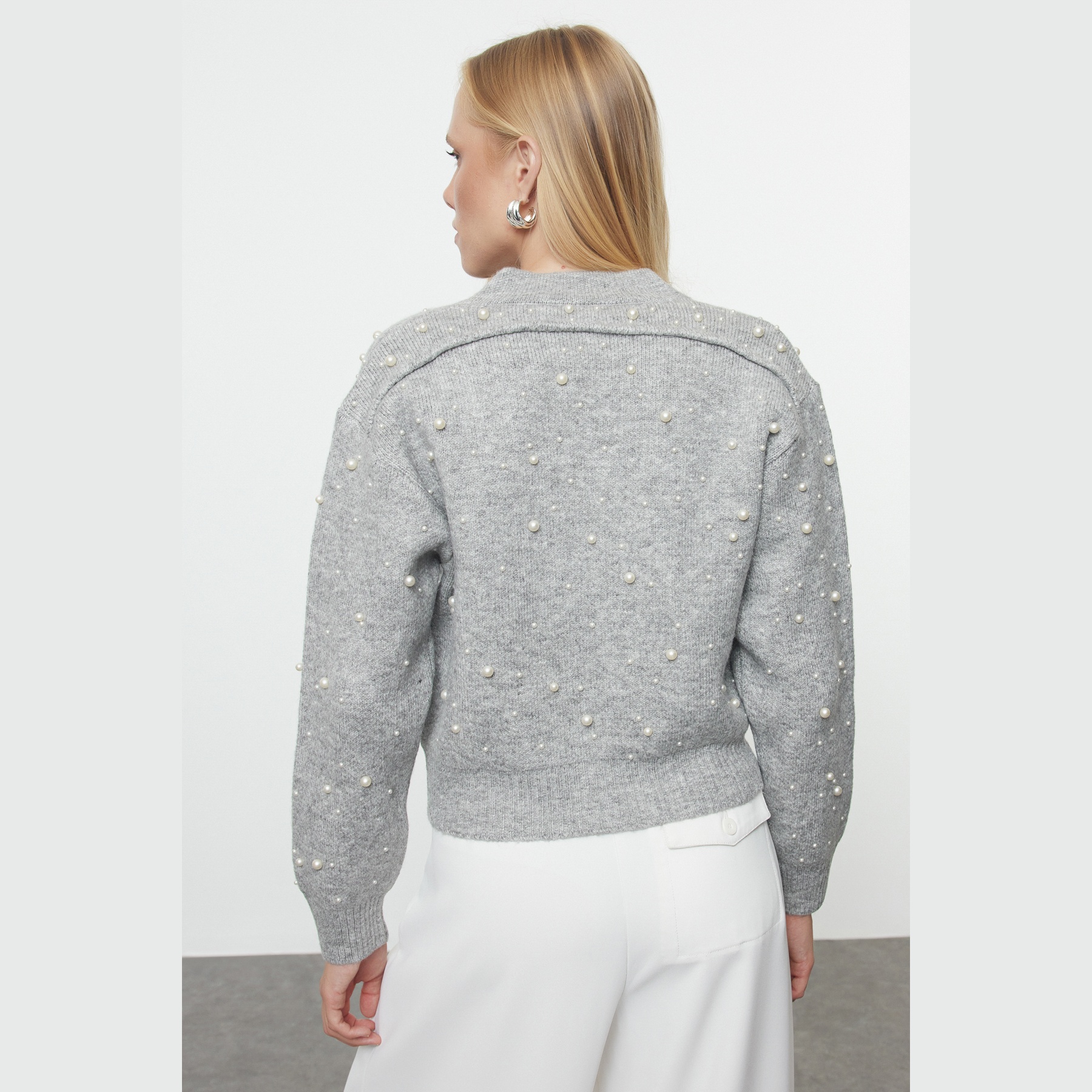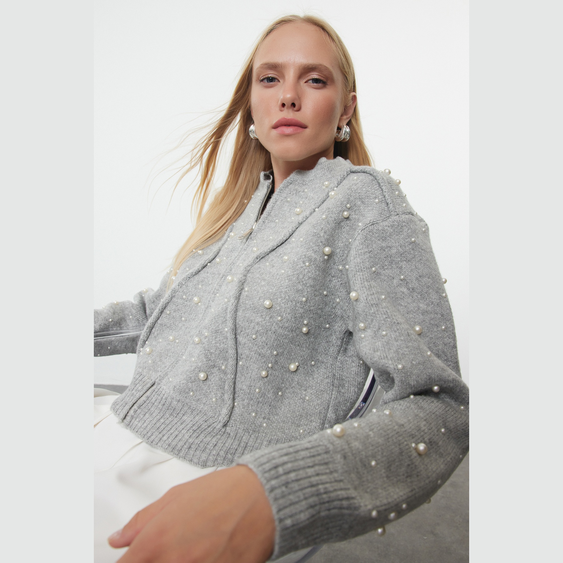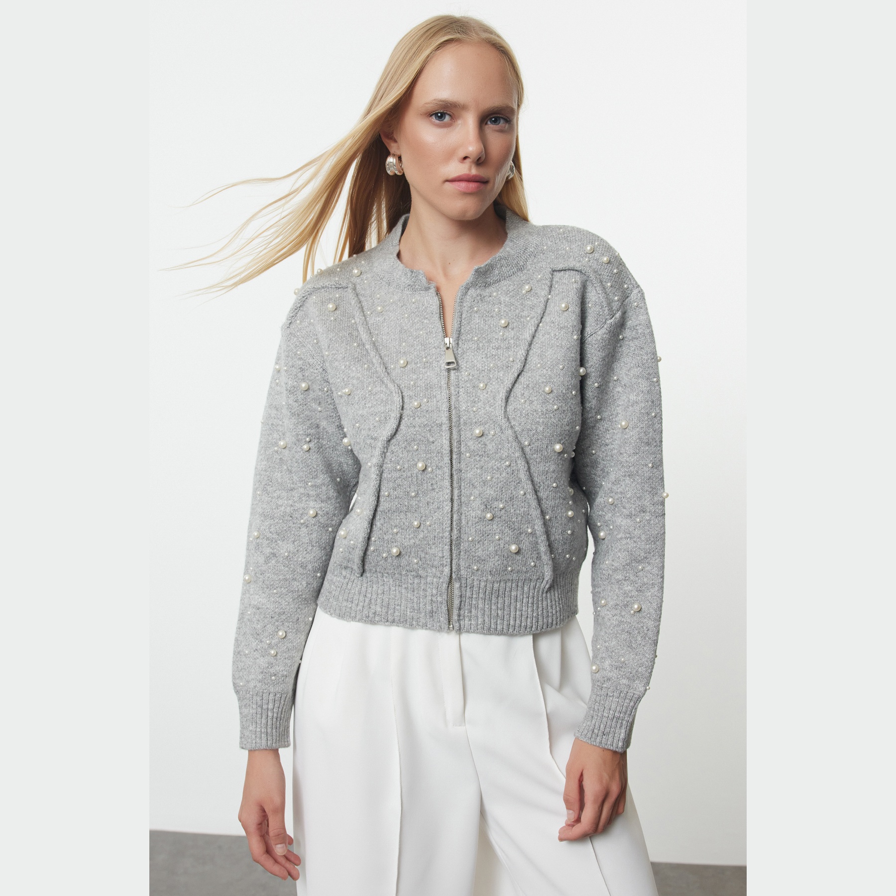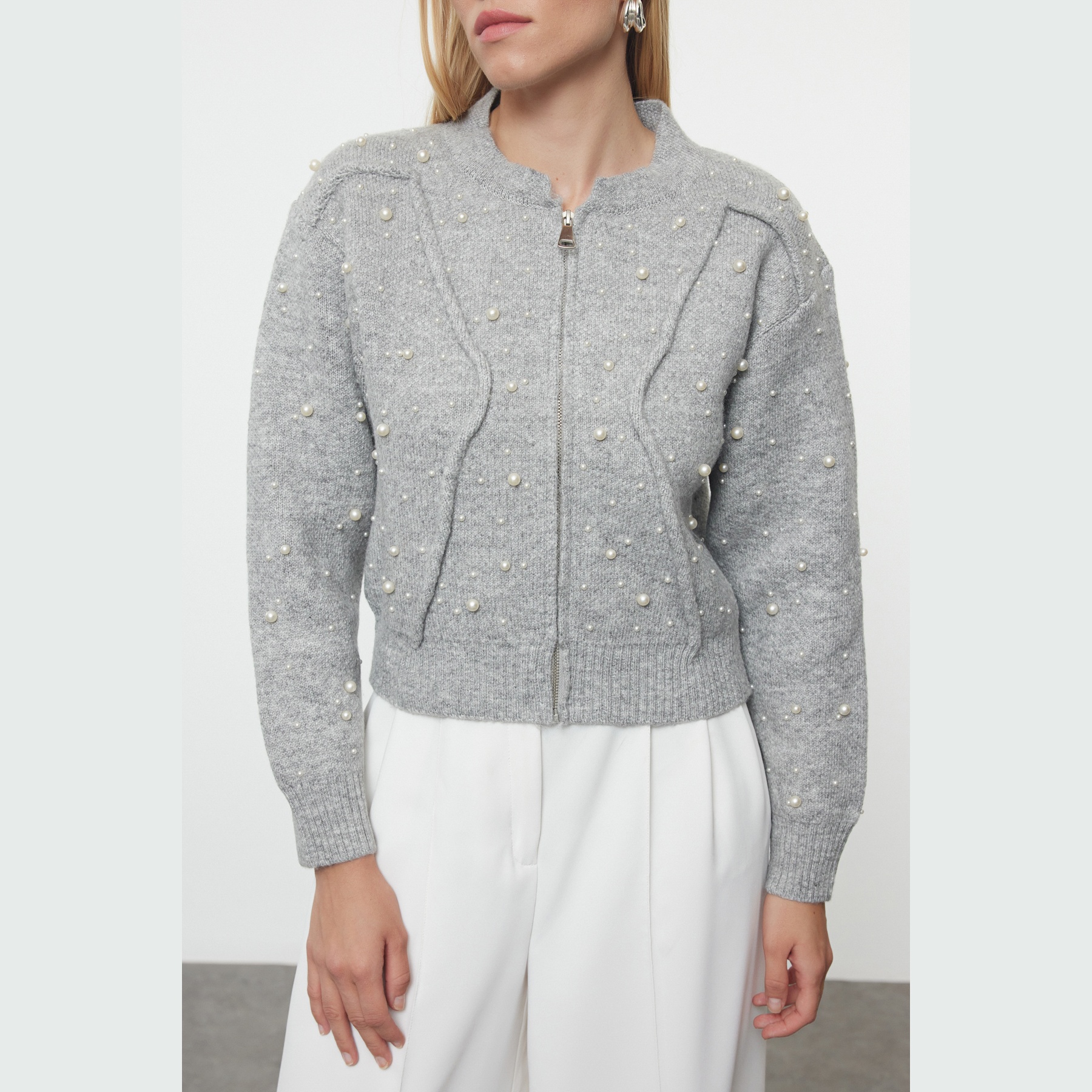 كارديغان نسائي – رمادي بملمس ناعم وسحاب أمامي وتفاصيل حجرية (أناقة شتوية بلمسة فاخرة)